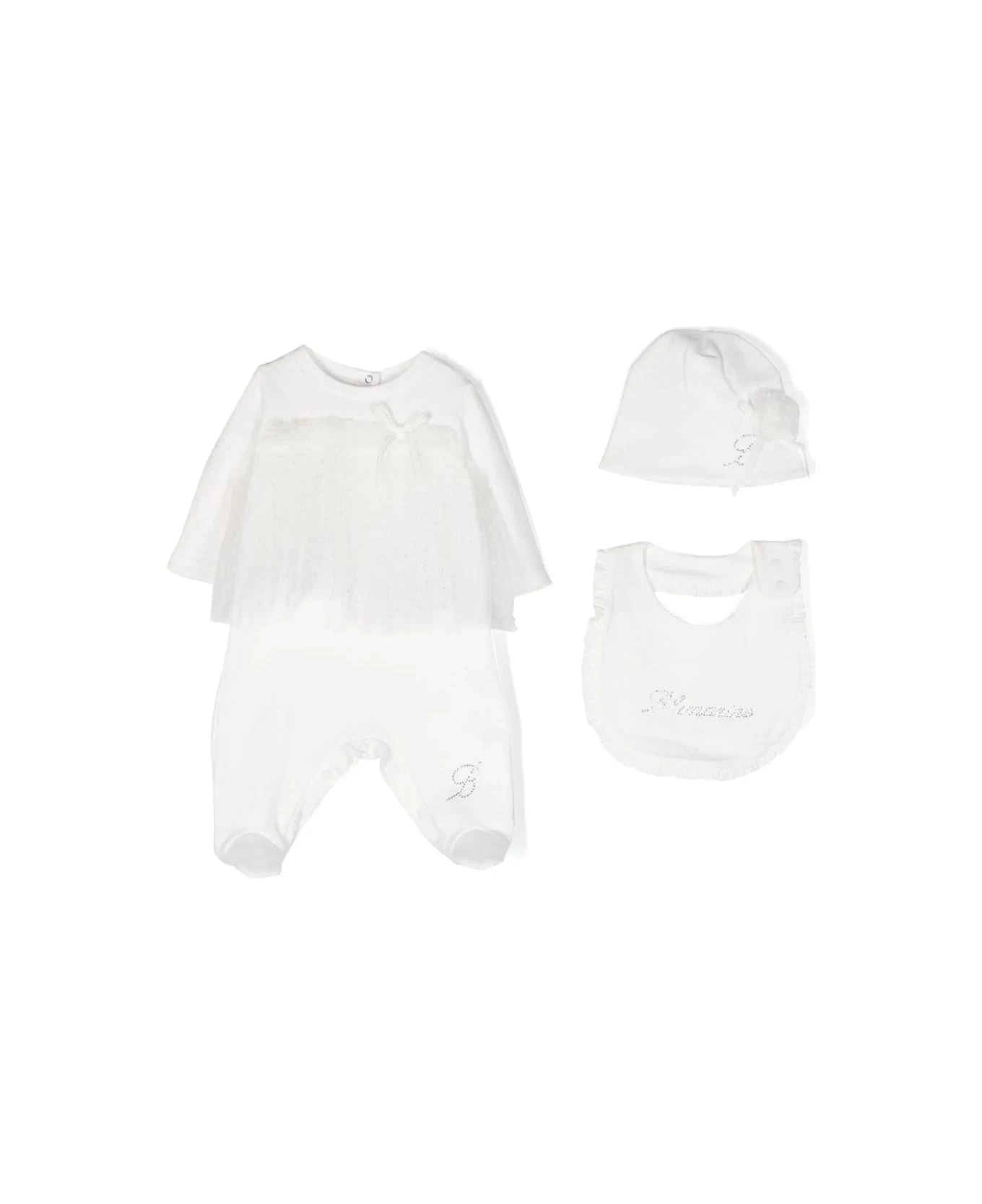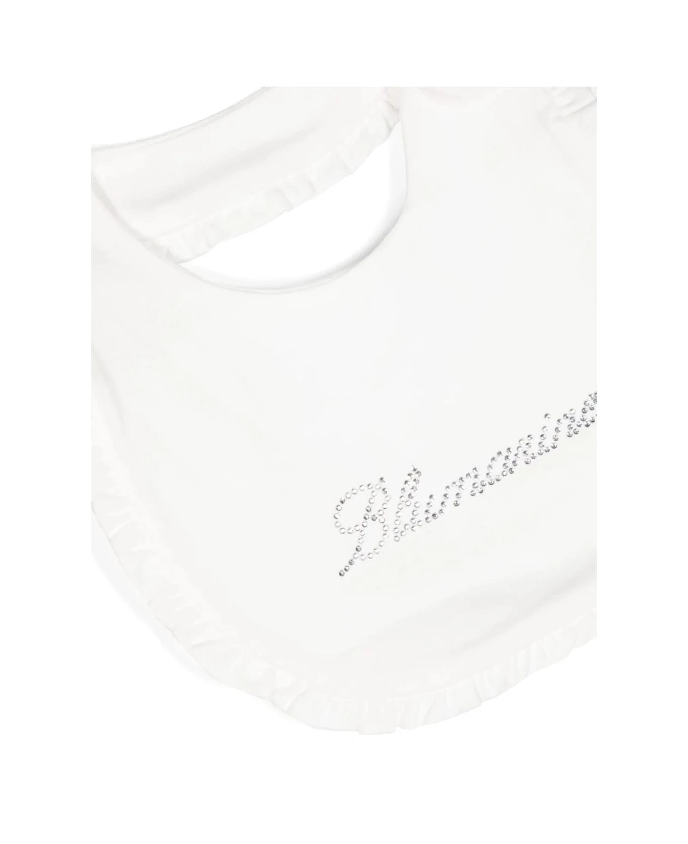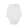 White, cotton, tulle inserts, synthetic diamond decoration, bow detail, crew neck, back button closure, long sleeves, synthetic diamond decoration, tulle inserts, ruffle trim, synthetic diamond decoration and back button closure. Composition