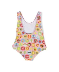 Pink one-piece swimsuit, with ruched shoulder straps. It is embellished with butterfly and hearts applique on the front.