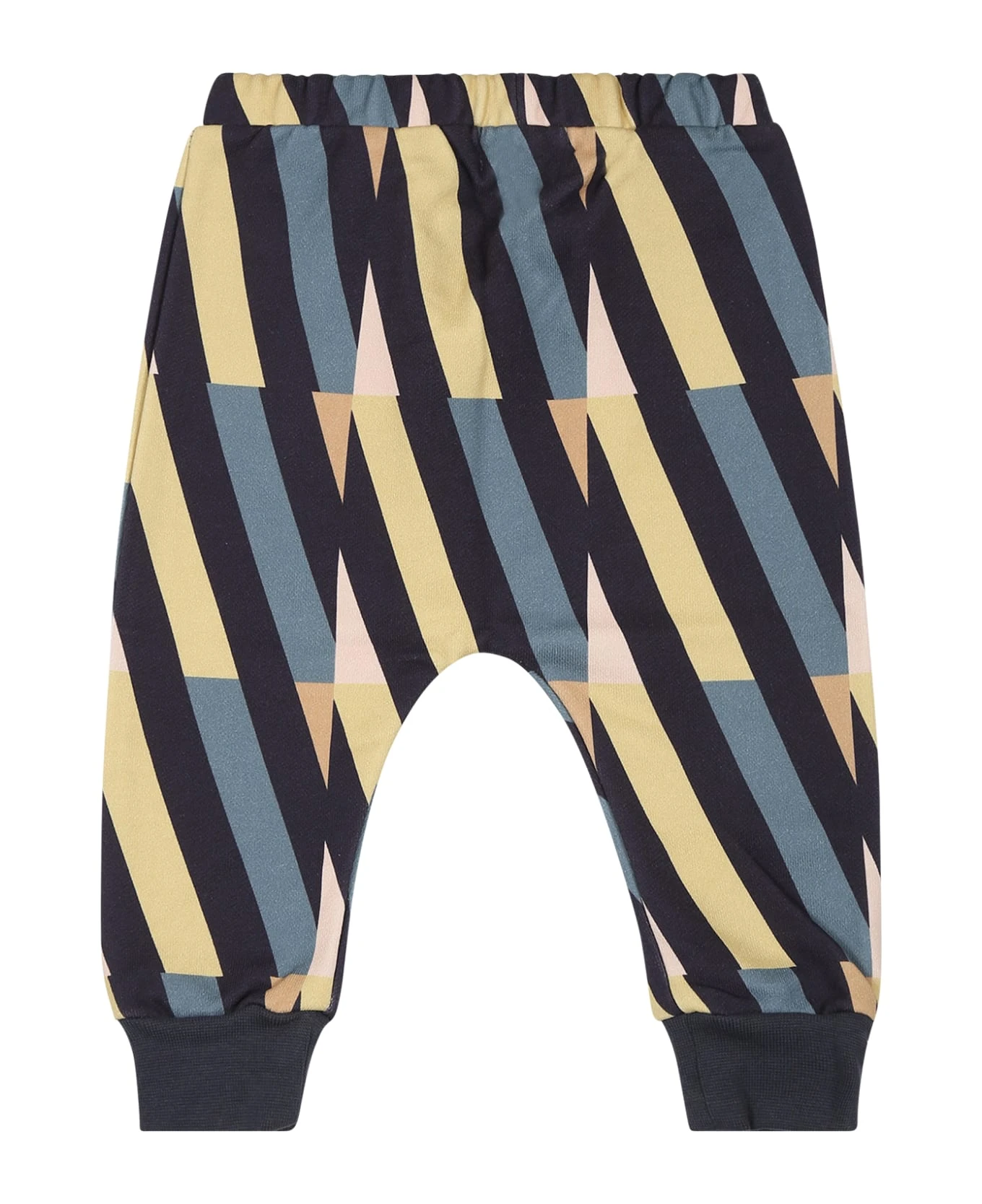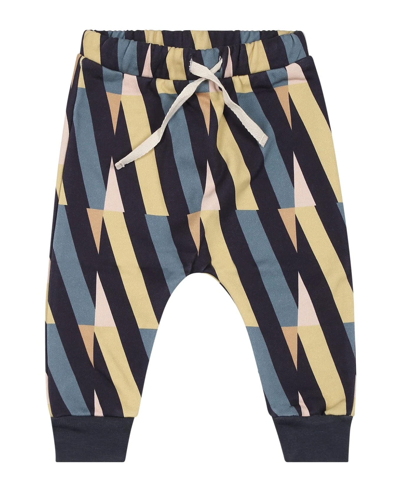 Blue trousers in fleece organic cotton, with elastic waist et drawstring. They are embellished with all-over abstract lines print.