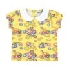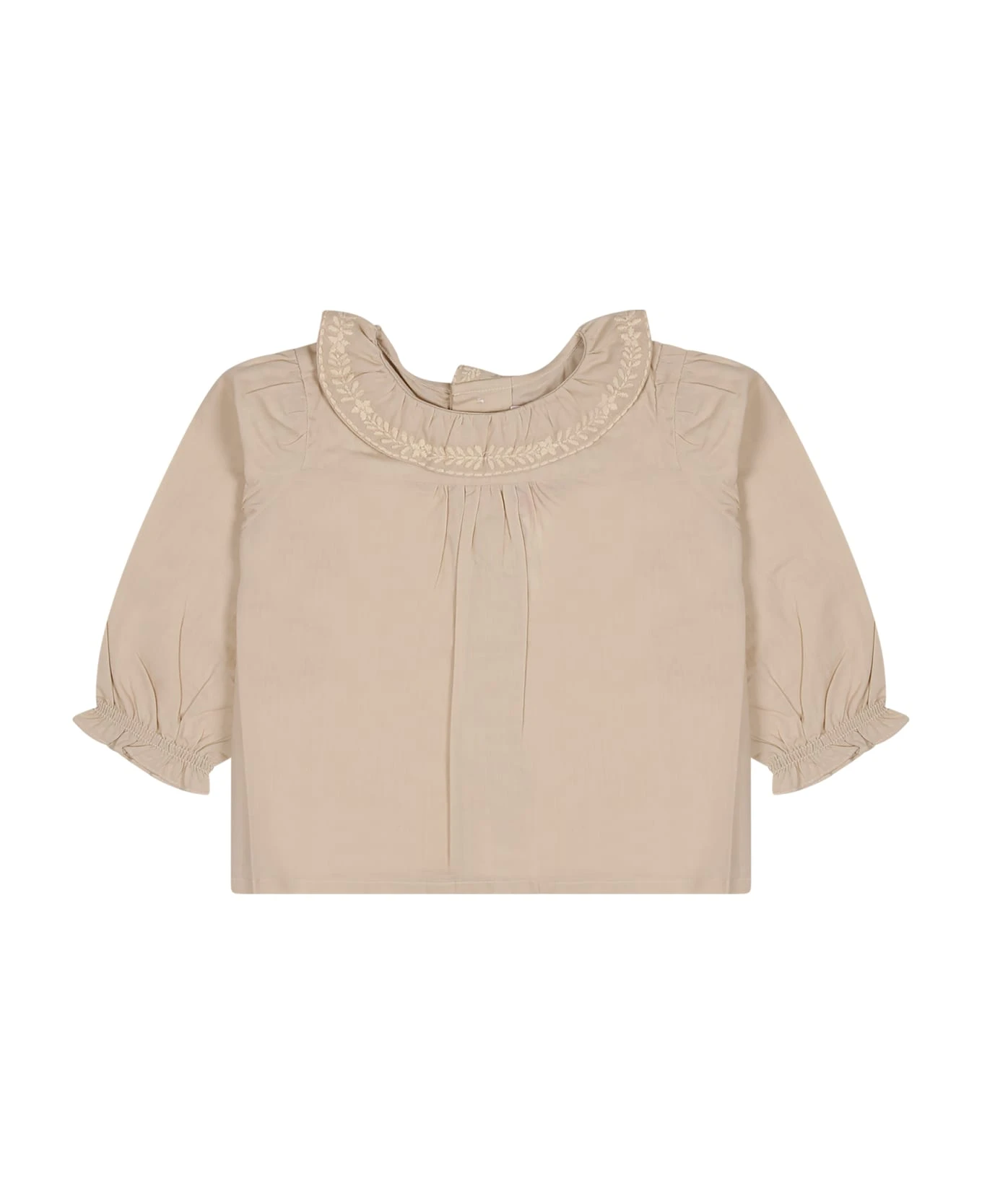 Pink cotton shirt, long sleeves, with collar, button closure on the back, with elasticated cuffs. It is embellished with flowers embroidered on the collar.
