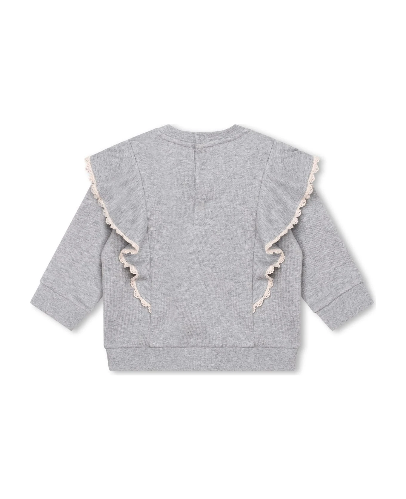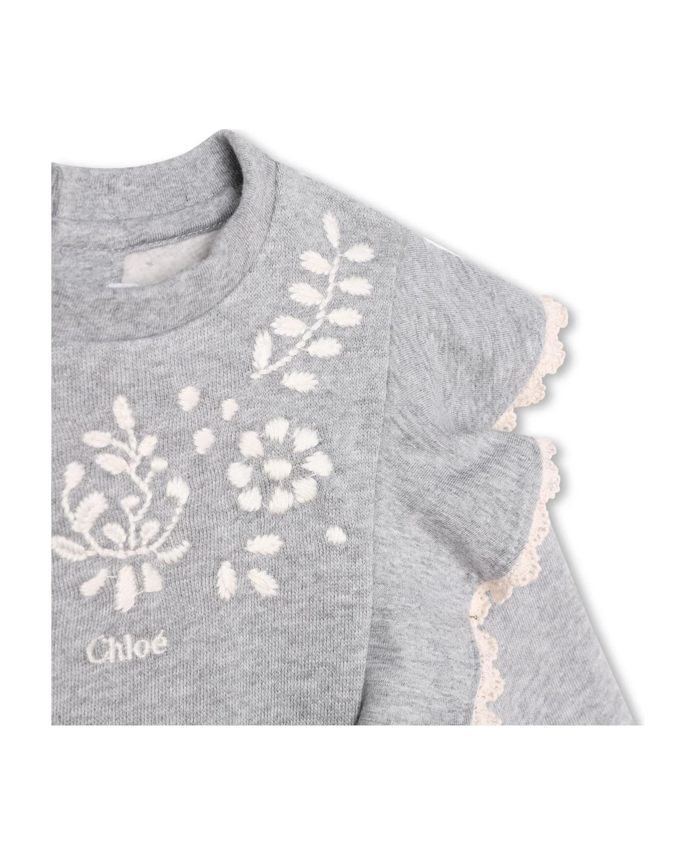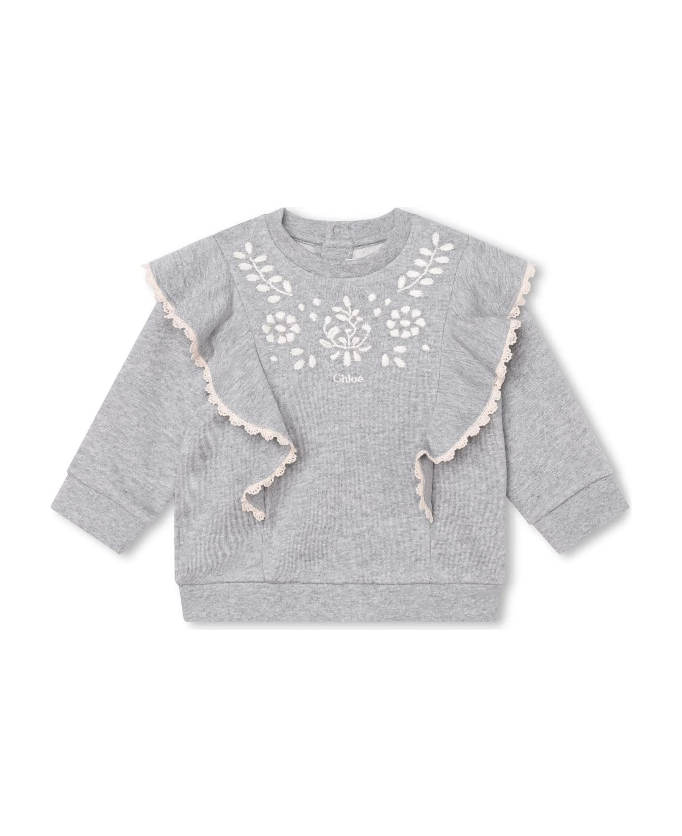 scallop-edge ruffled sweatshirt from CHLO KIDS featuring light grey, organic cotton, m nge effect, embroidered logo to the front, floral embroidery, ruffled detailing, scallop edge, round neck, long sleeves, elasticated cuffs and straight hem. This item is made from at least 50% organic materials.. Learn more about what makes a product Conscious on our Conscious Criteria page.