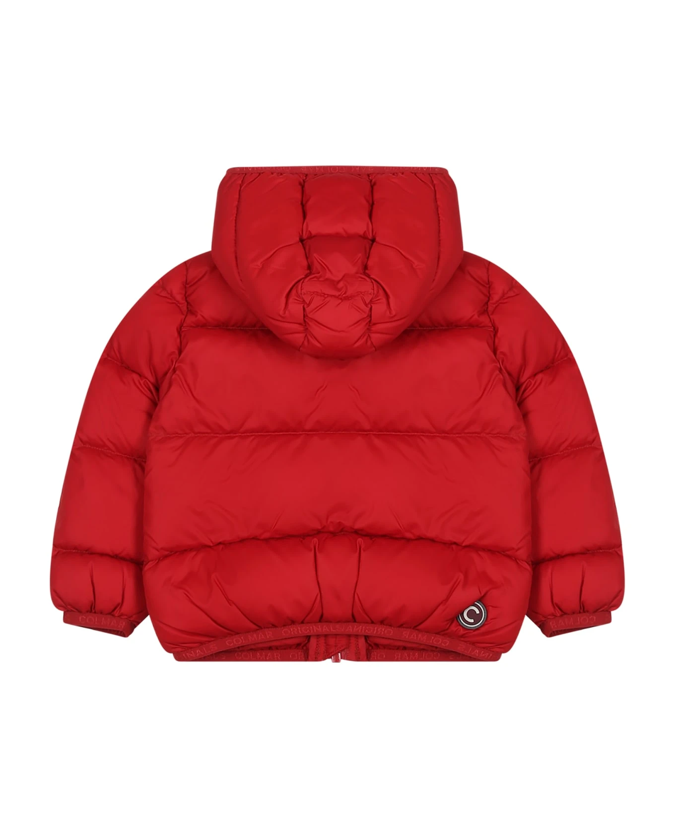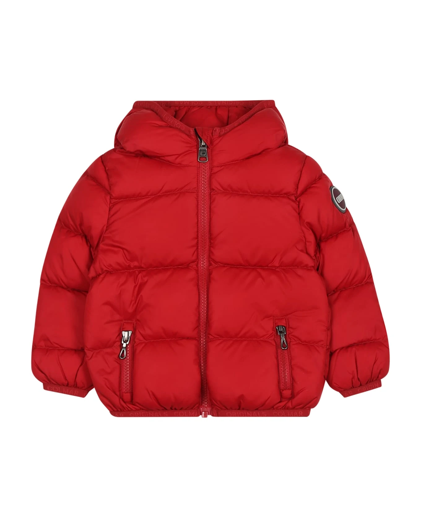 Quilted and lightly padded red down jacket, long sleeves, with hood, front zip closure, side zip pockets, elasticated cuffs and hem. It is embellished with a logo patch on the sleeve.