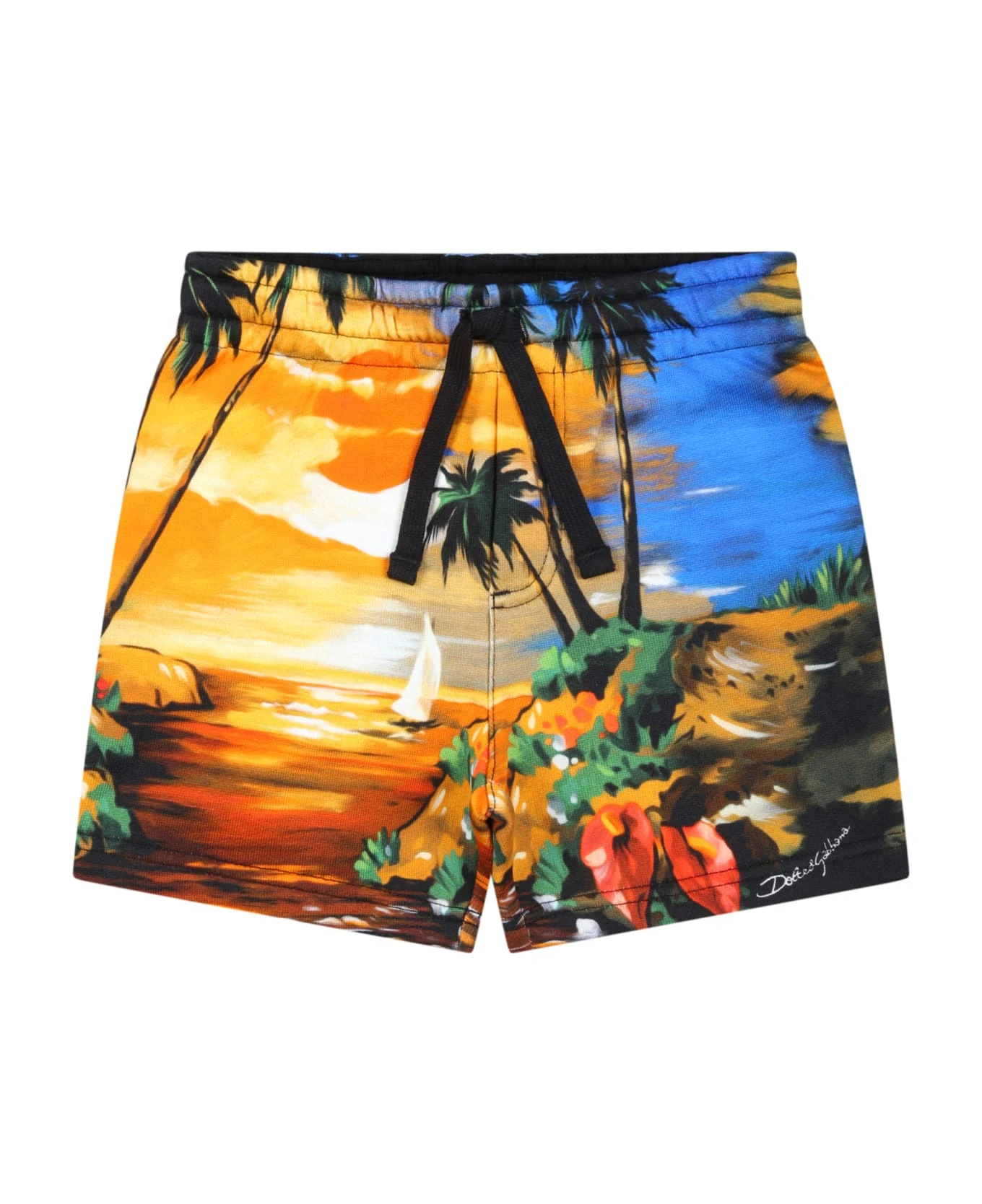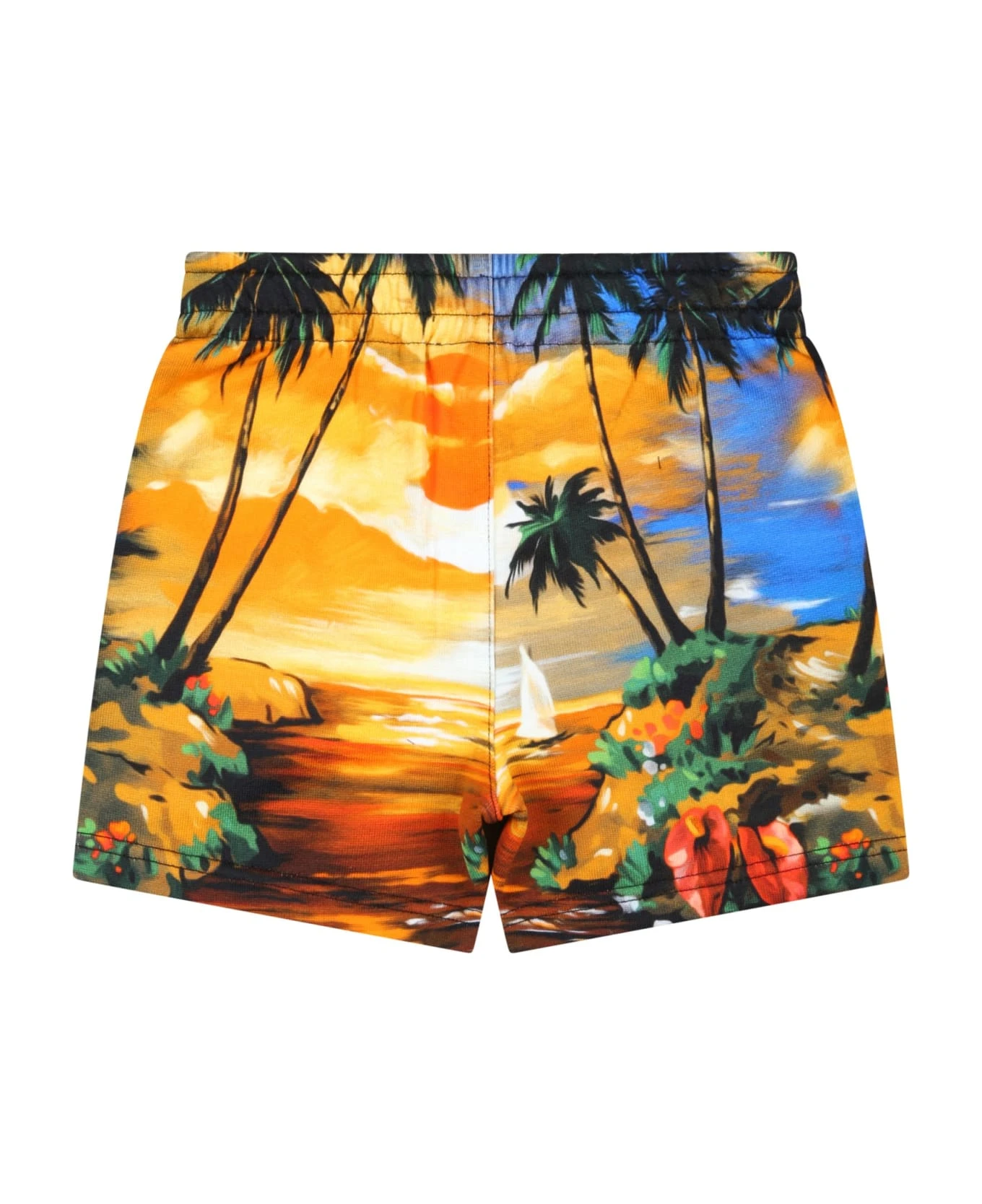 Multicolor shorts in brushed cotton, with elasticated waist with drawstring on the front. They are embellished with all-over sunset beach and white logo on the front.