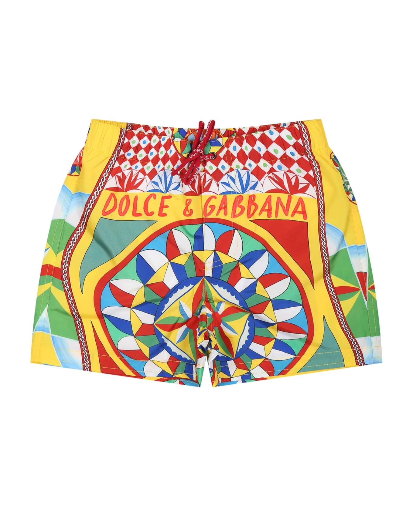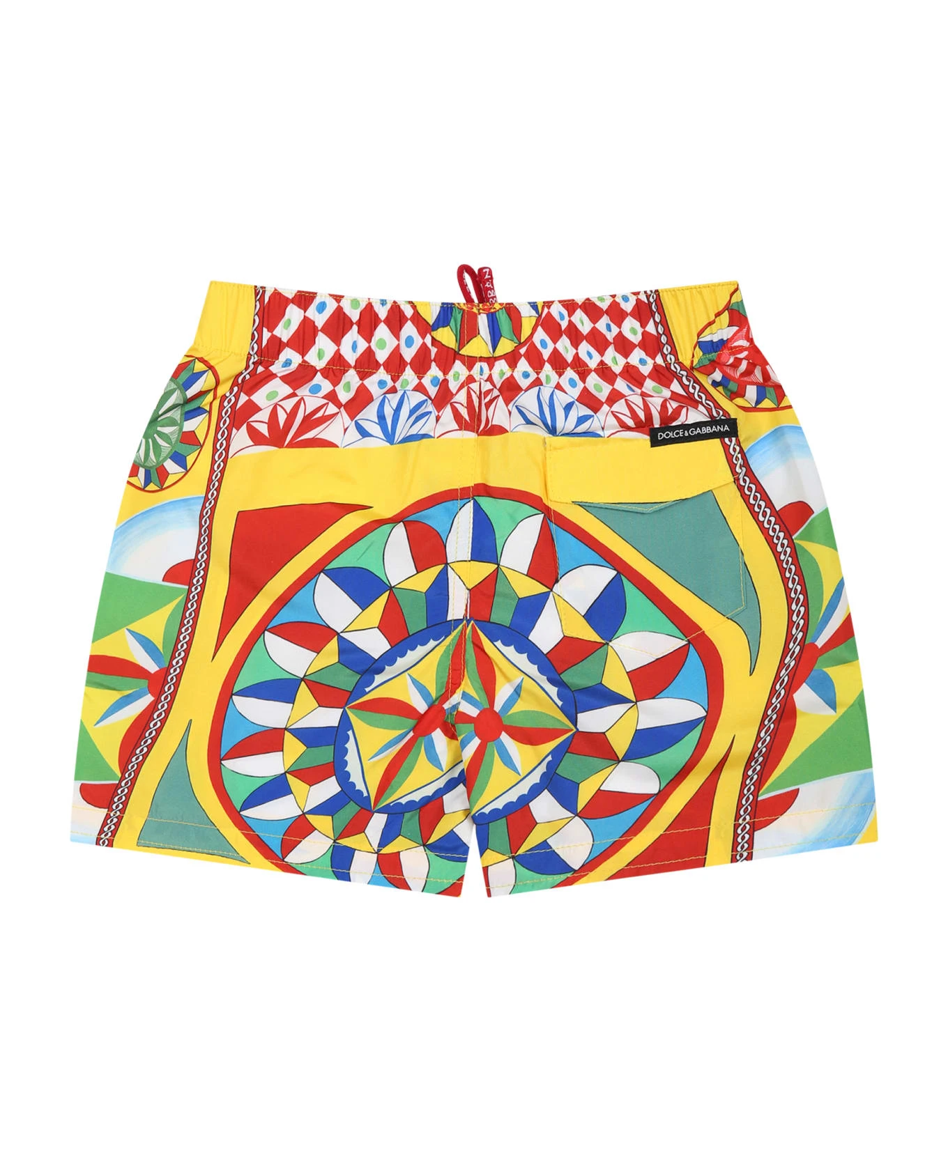 Yellow swim boxer, with elastic and drawstring waist, back pocket. It is embellished with red logo on the front and all-over iconic cart print.