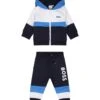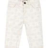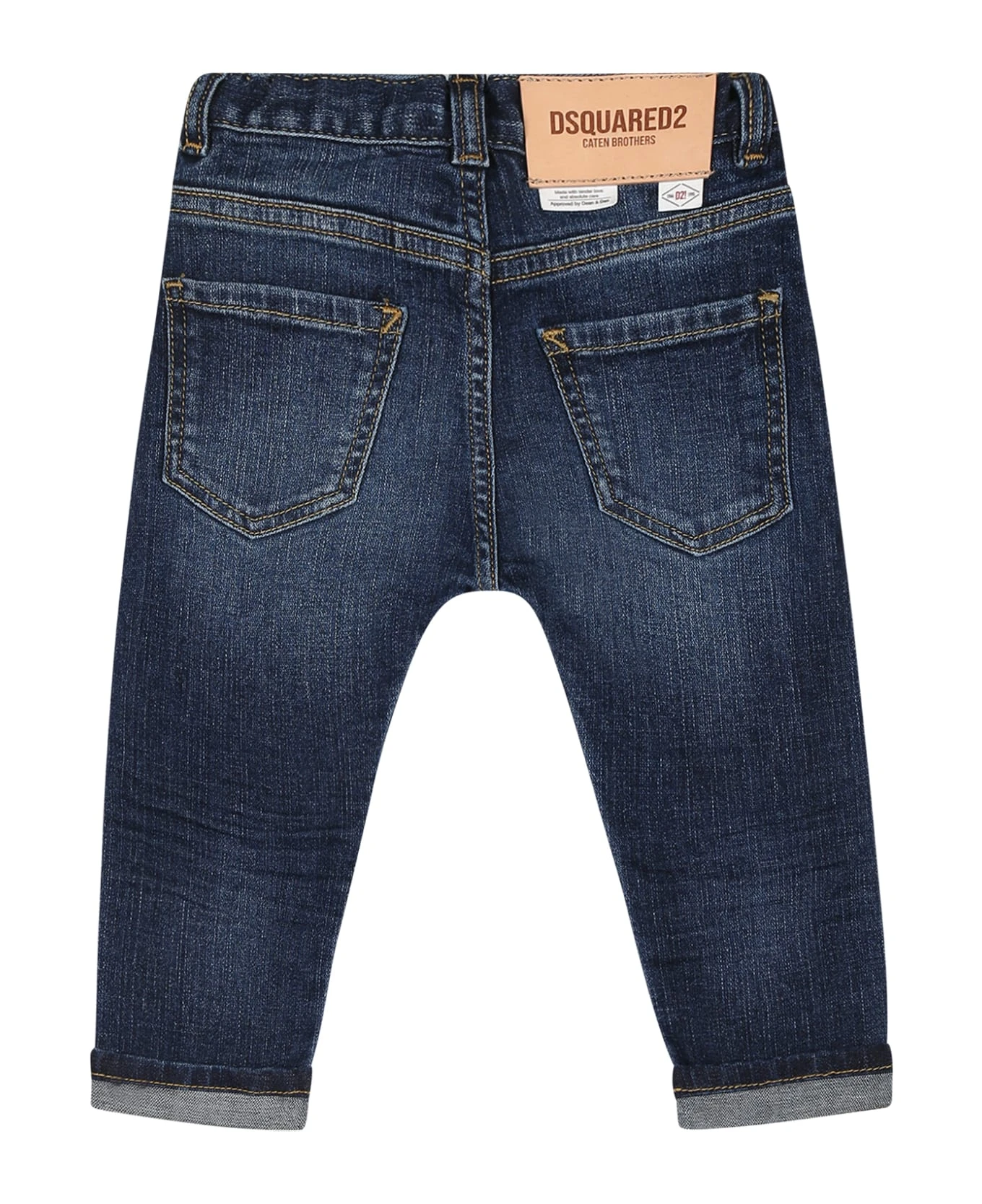 Denim blue jeans, five pockets, with belt loops, zip and button closure on the front, adjustable waist thanks to internal elastic bands with button, fake rips on the front. They are embellished with logo patch on the front and on the back.