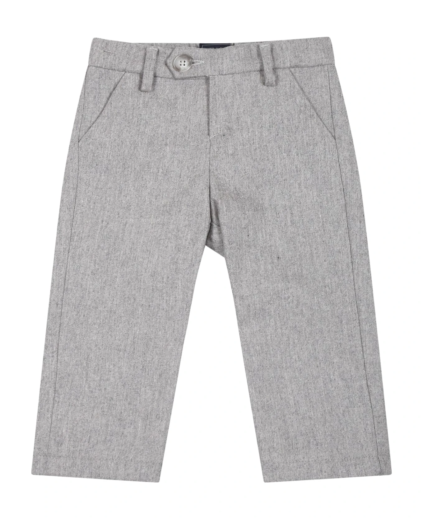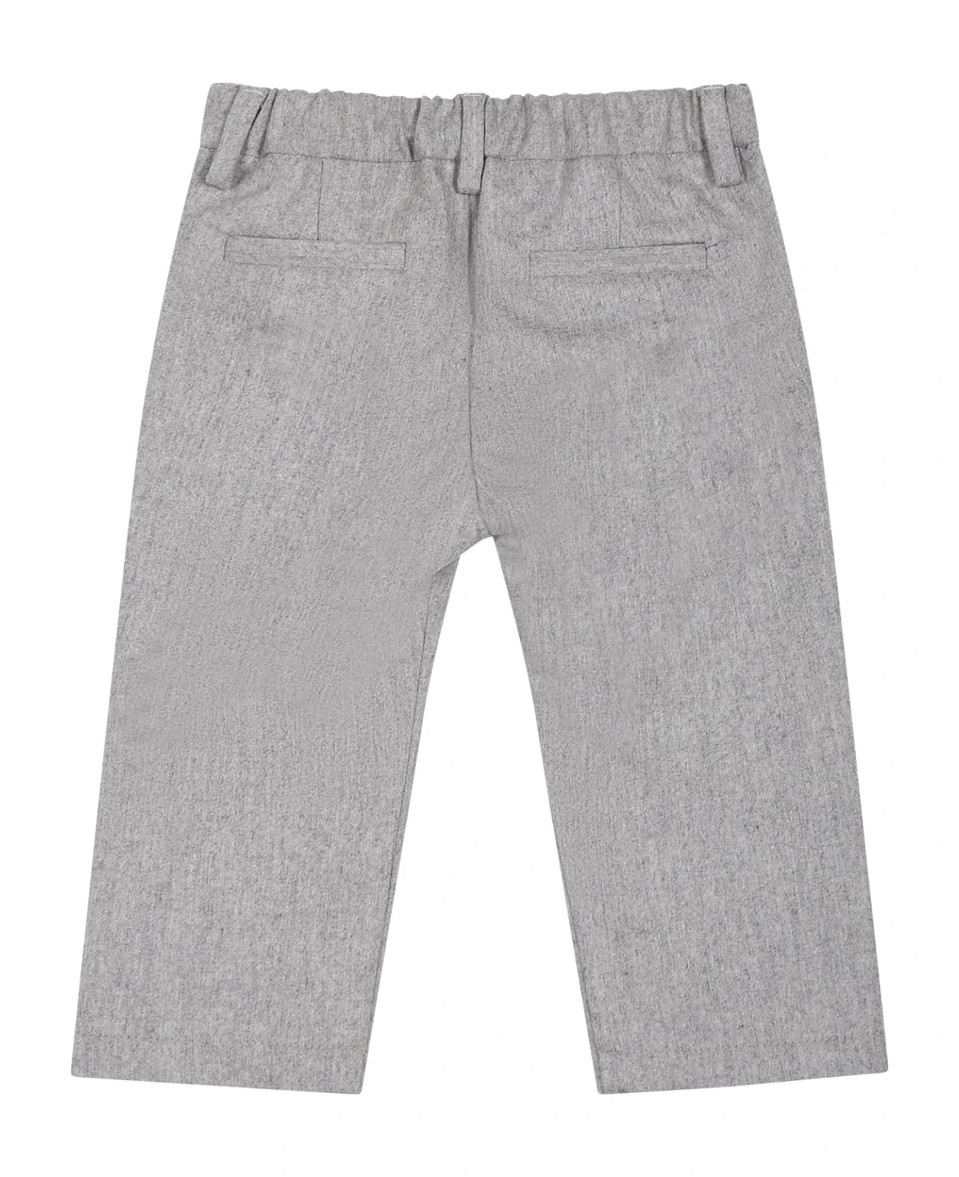 Grey trousers in wool blend, with belt loops, front closure with button, adjustable waist thanks to internal elastic bands with button, side and back pockets.