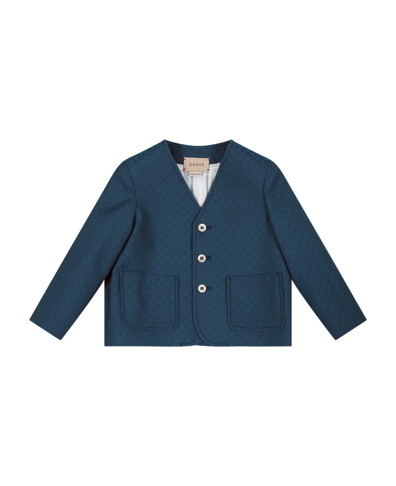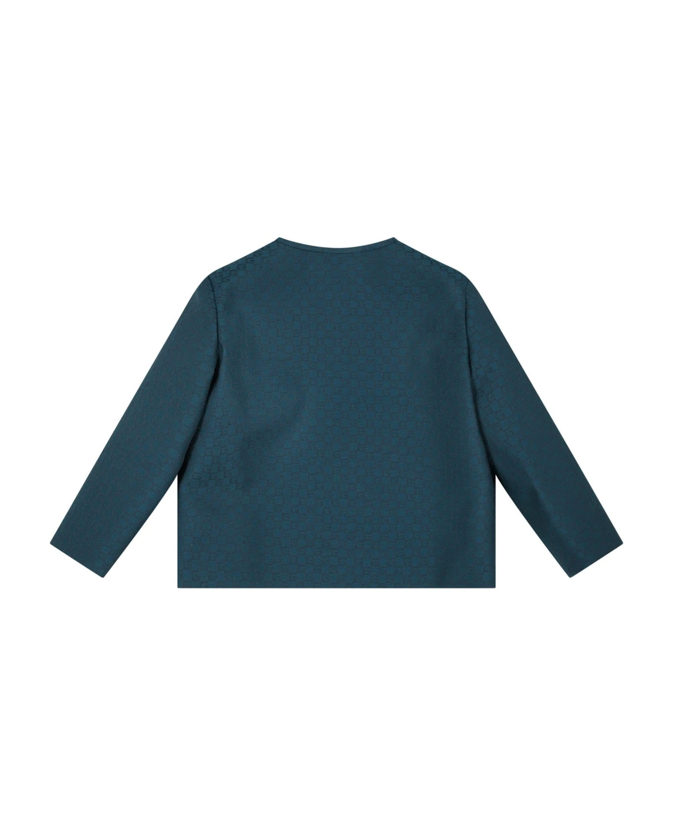 Green jacket in wool blend, with long sleeves, V-neck, button closure and front pockets. It is embellished with an all-over G motif.