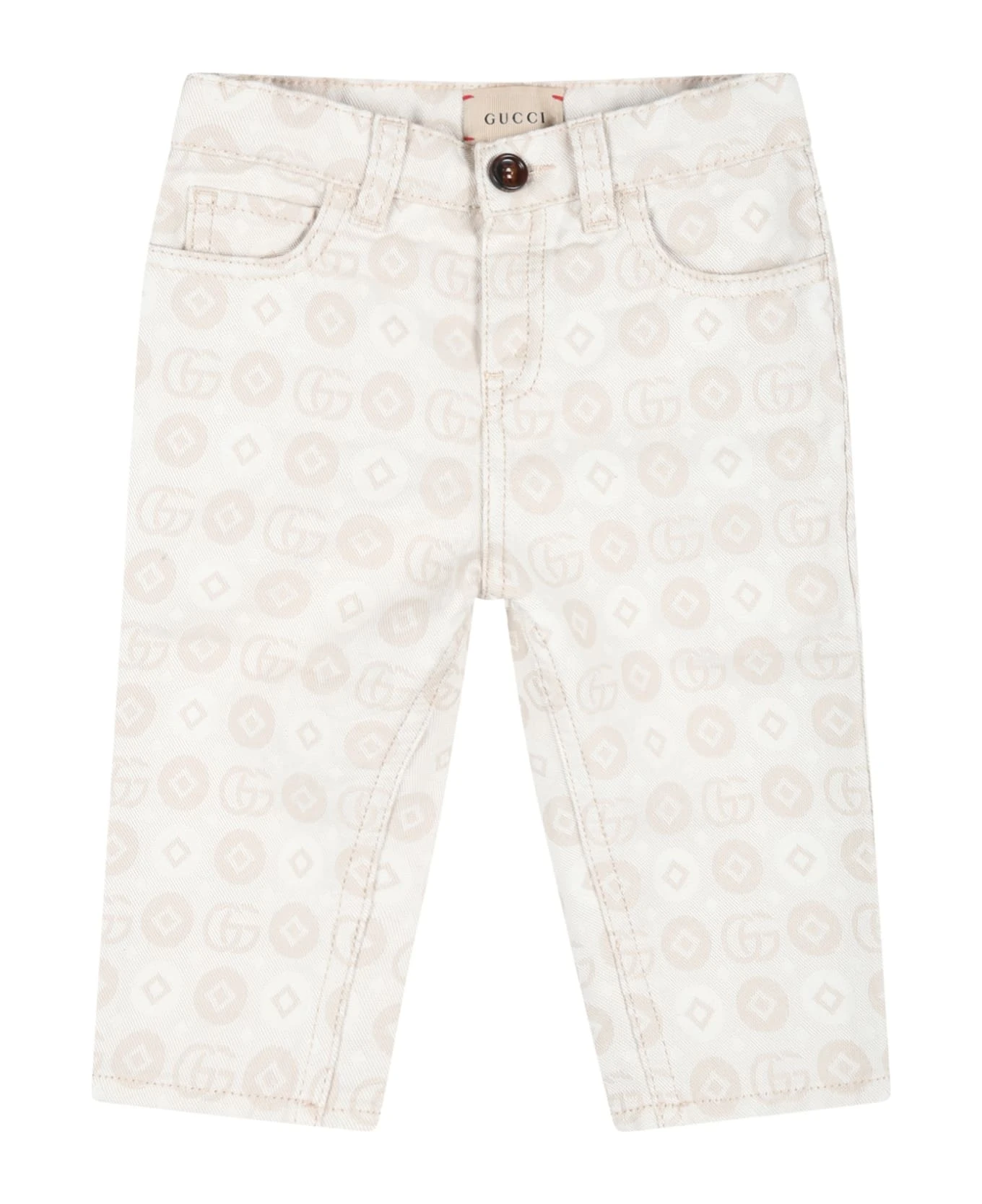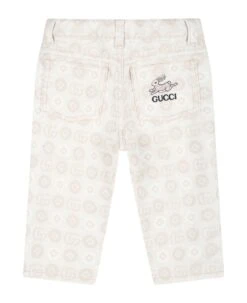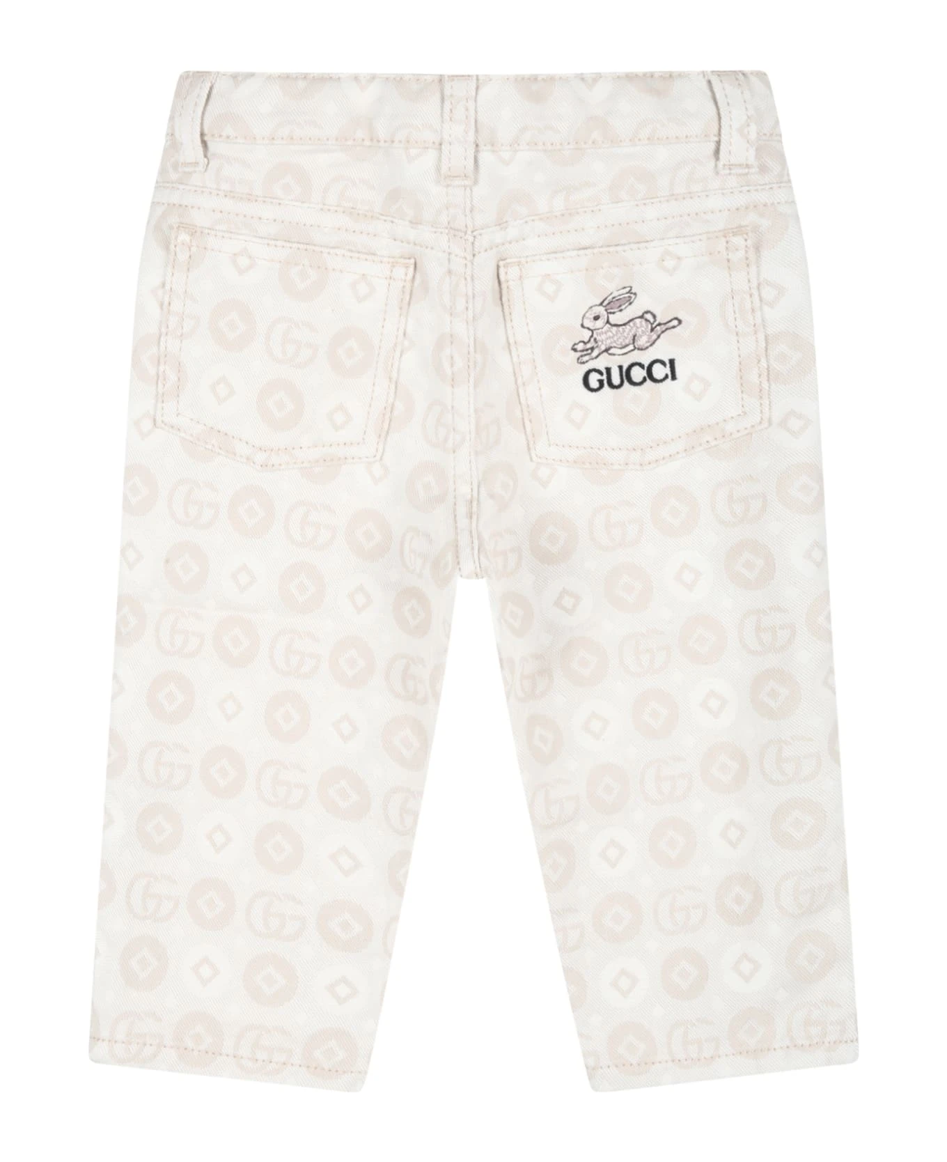 Ivory five-pocket jeans, with adjustable waistband thanks to the internal elastic bands with button, belt loops and button closure on the front. They are embellished with beige all-over GG, rabbit and black logo embroided on the back.