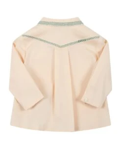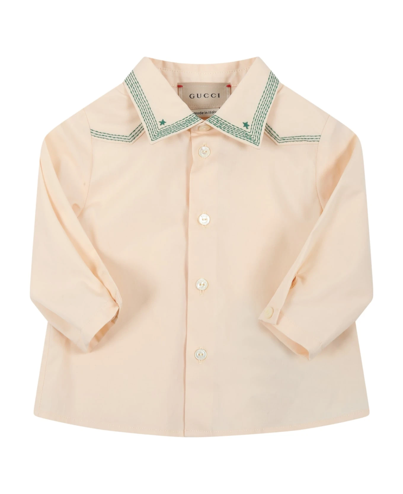 Ivory cotton shirt with long sleeves, classic collar and button closure on the front and cuffs. It is decorated with green embroidery and stars on the top. It is part of the Gucci x Angela Lynne capsule.