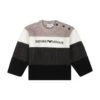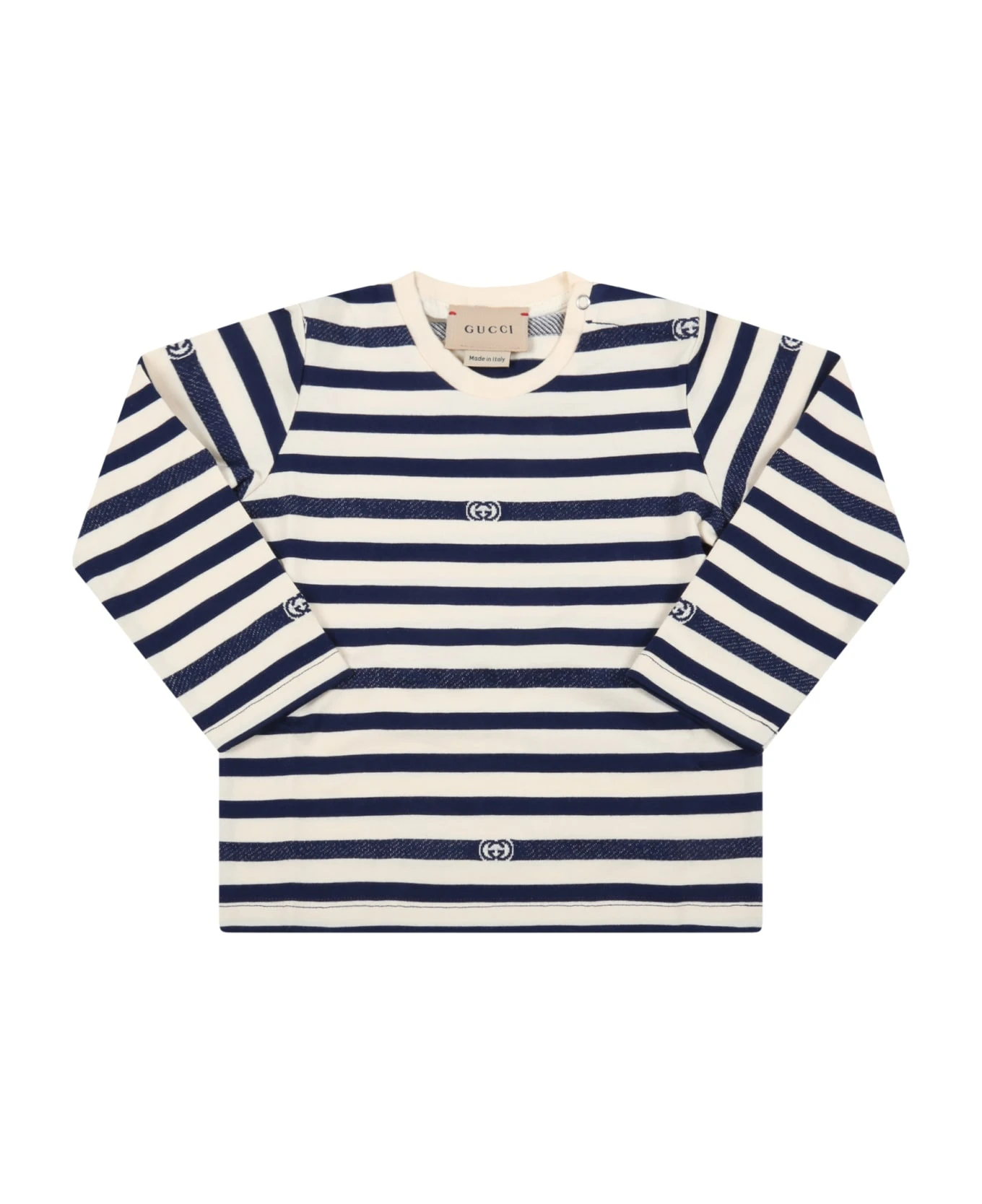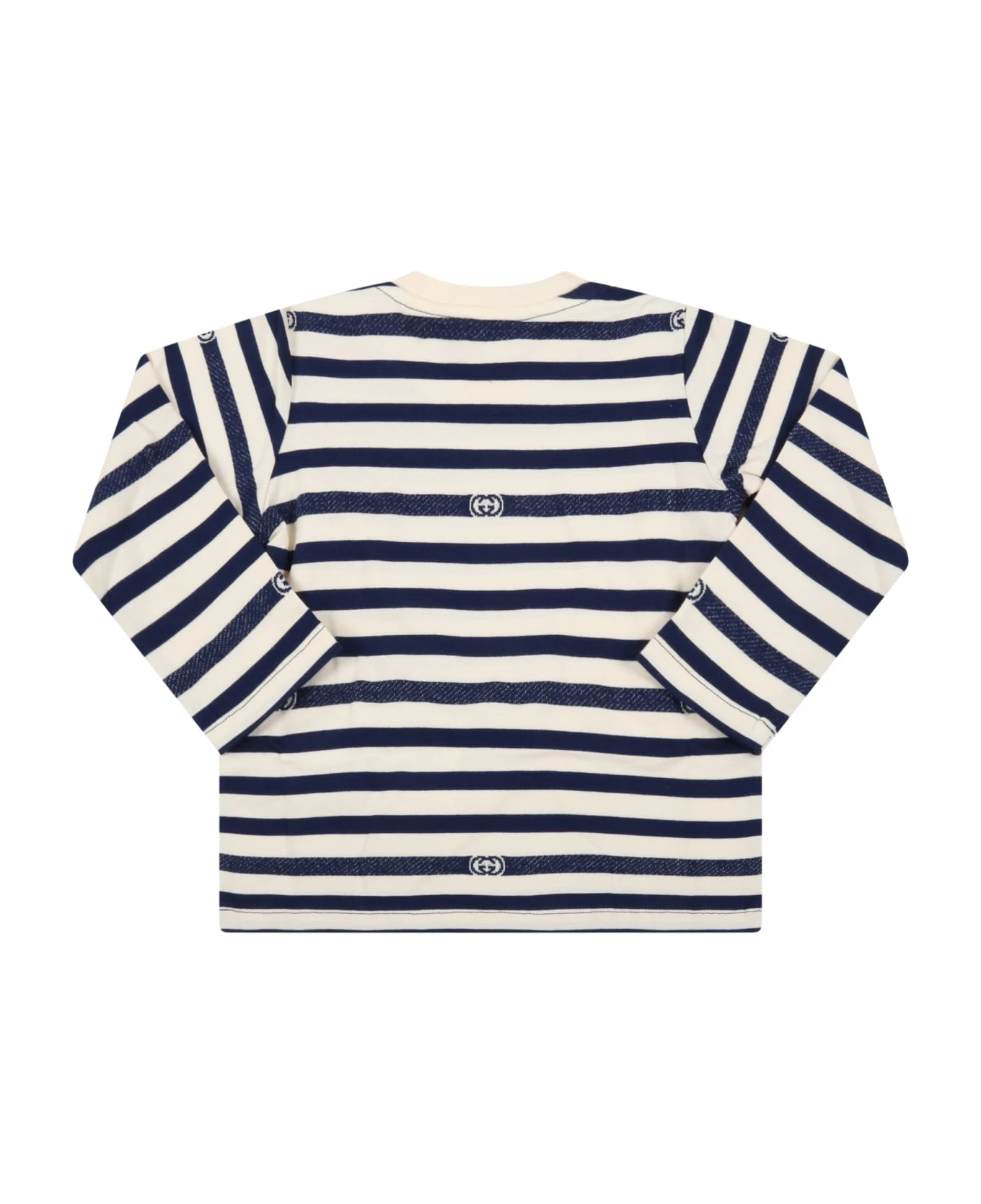 Ivory and blue striped t-shirt, made from cotton, with long sleeves, ribbed crew-neck and press-studs closure, on the shoulder. It is embellished with blue double GG all-over.