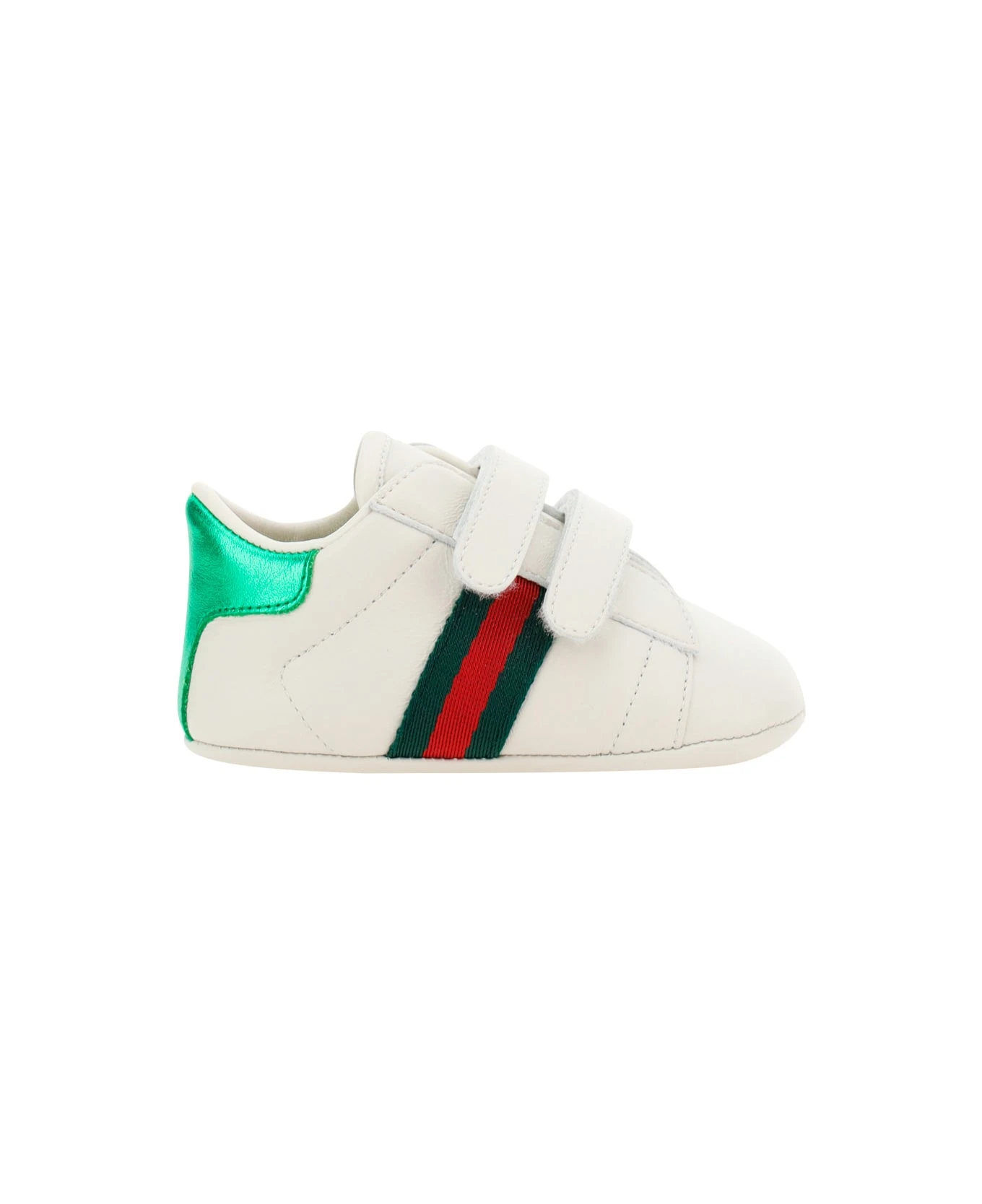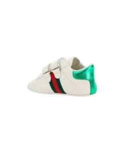 Calfskin sneakers for boy by gucci, front closure with double velcro strap, brand’s iconic webing bands applied to side panels, round toe, flat sole.