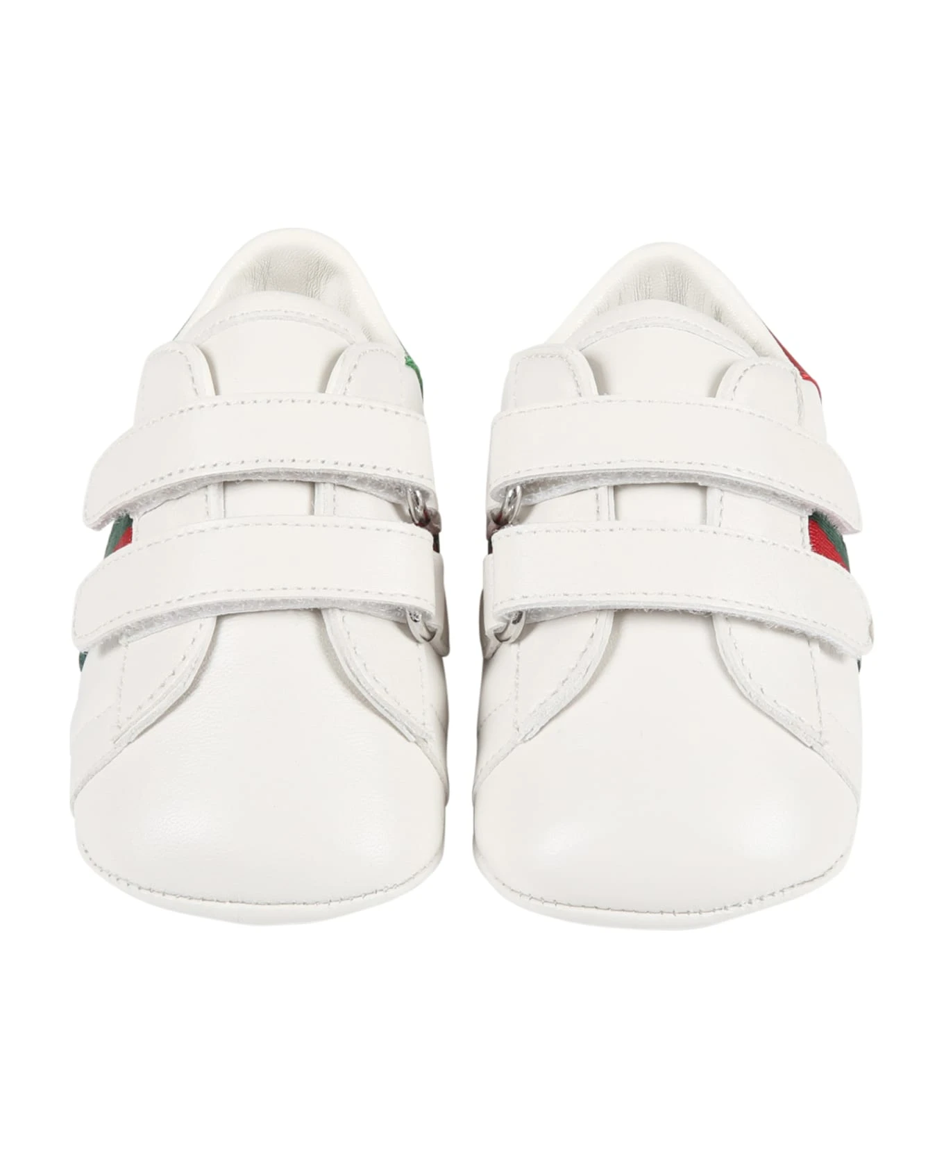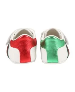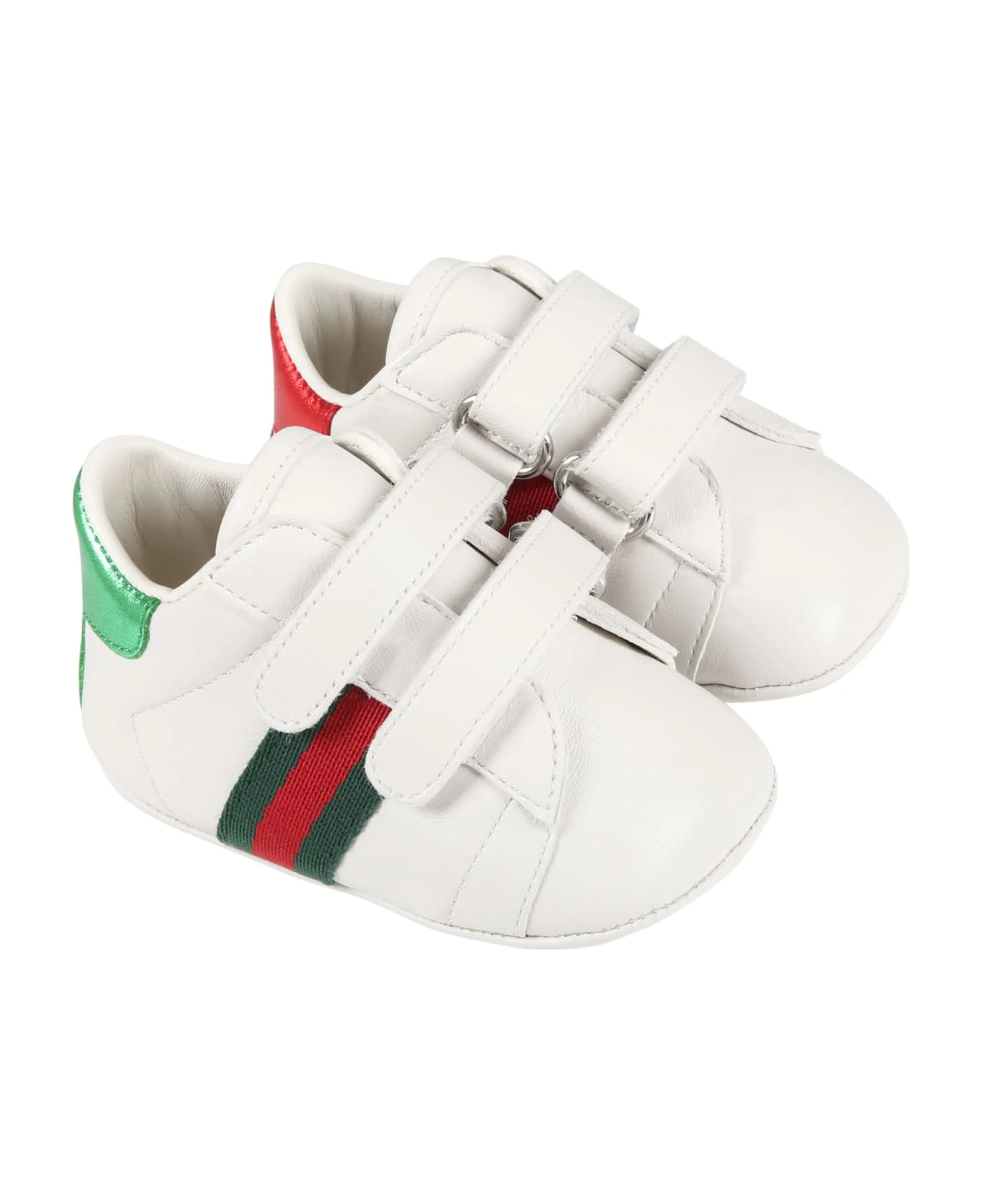 White crib sneakers, made from leather, with rubber sole and strap with adjustable Velcro closure. They are embellished with red and green Web detail on the sides and back stub with logo on green leather on one shoe and a red leather stub on the other.