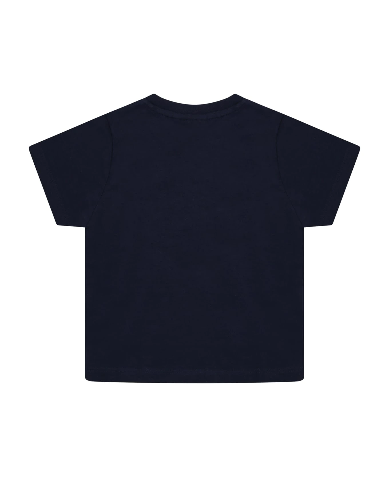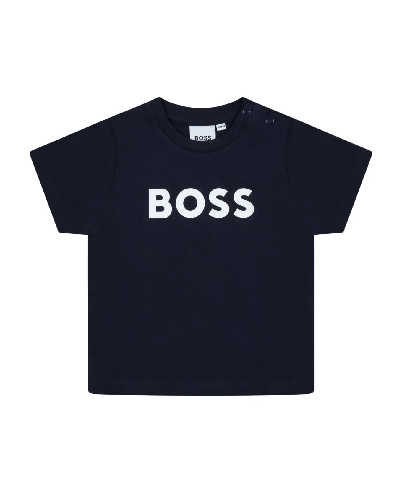 Blue cotton T-shirt, with short sleeves, snap button closure on the shoulder, crew neck and ribbed hem. It is embellished with white logo on the front.