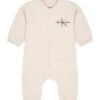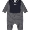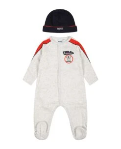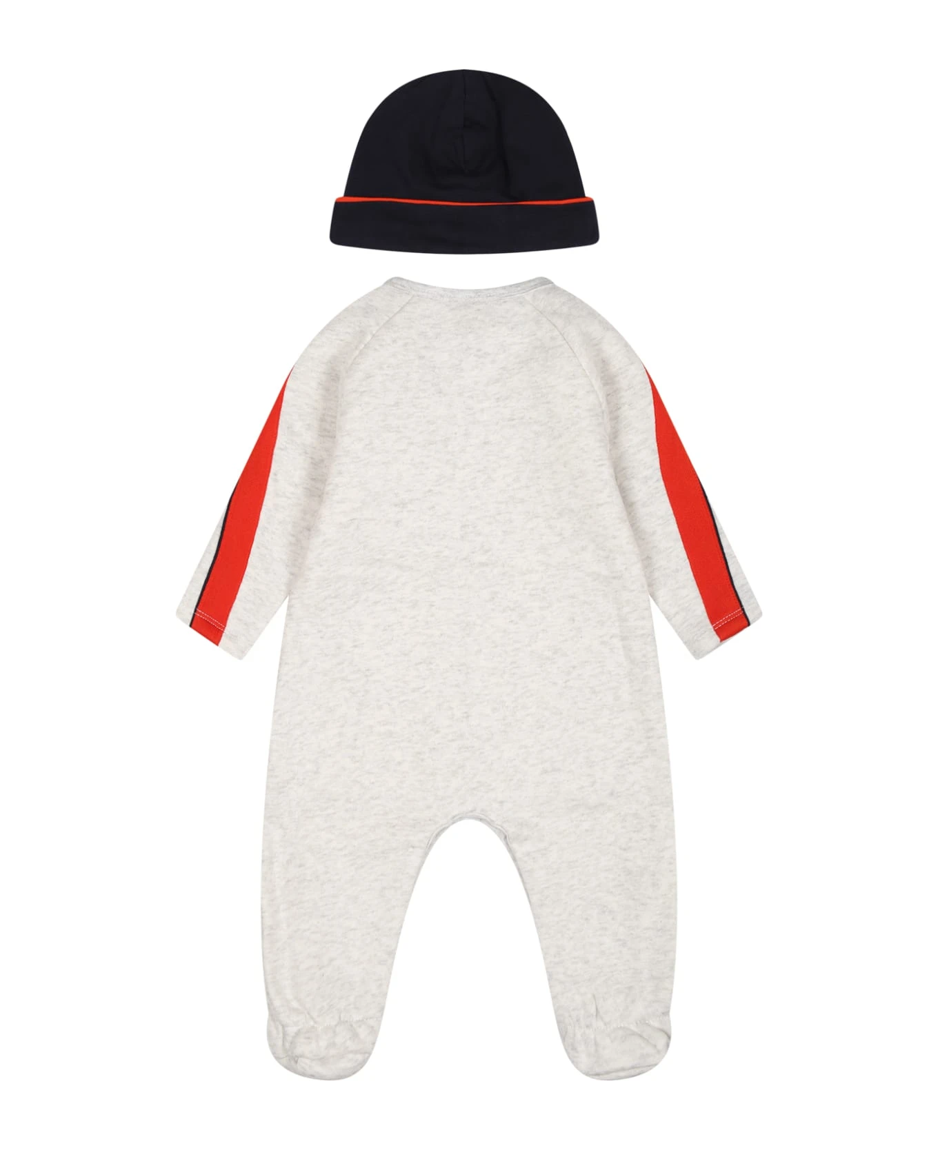 Grey set composed of babygrow and hat; fleece cotton jbbaygrow, with long sleeves, round neck, closure with automatic buttons on the front and between the legs; it is embellished with a logoed patch on the chest; blue hat with turn-up, it is embellished with logo embroidered on the front.