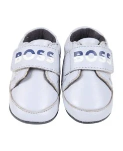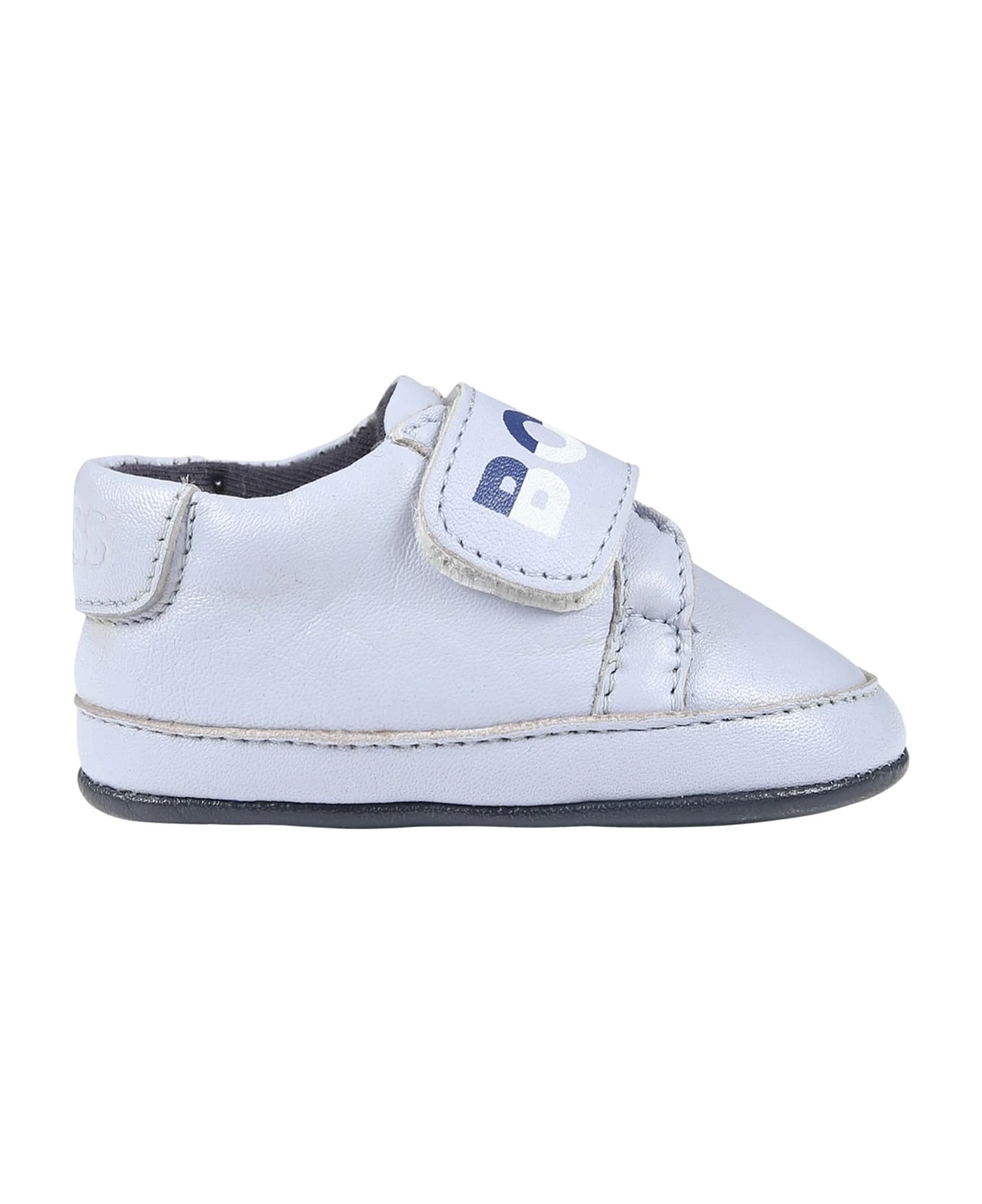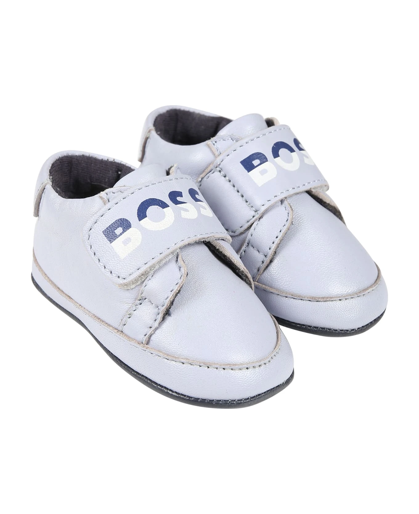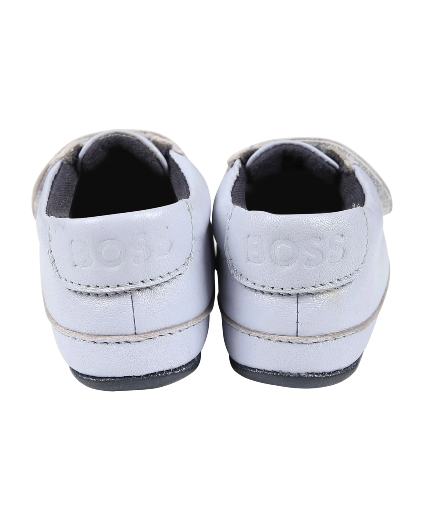 Light blue sneakers, velcro closure. They are embellished with multicolor print of the “Boss” logo on the velcro, with logo on the heel and on the sole.