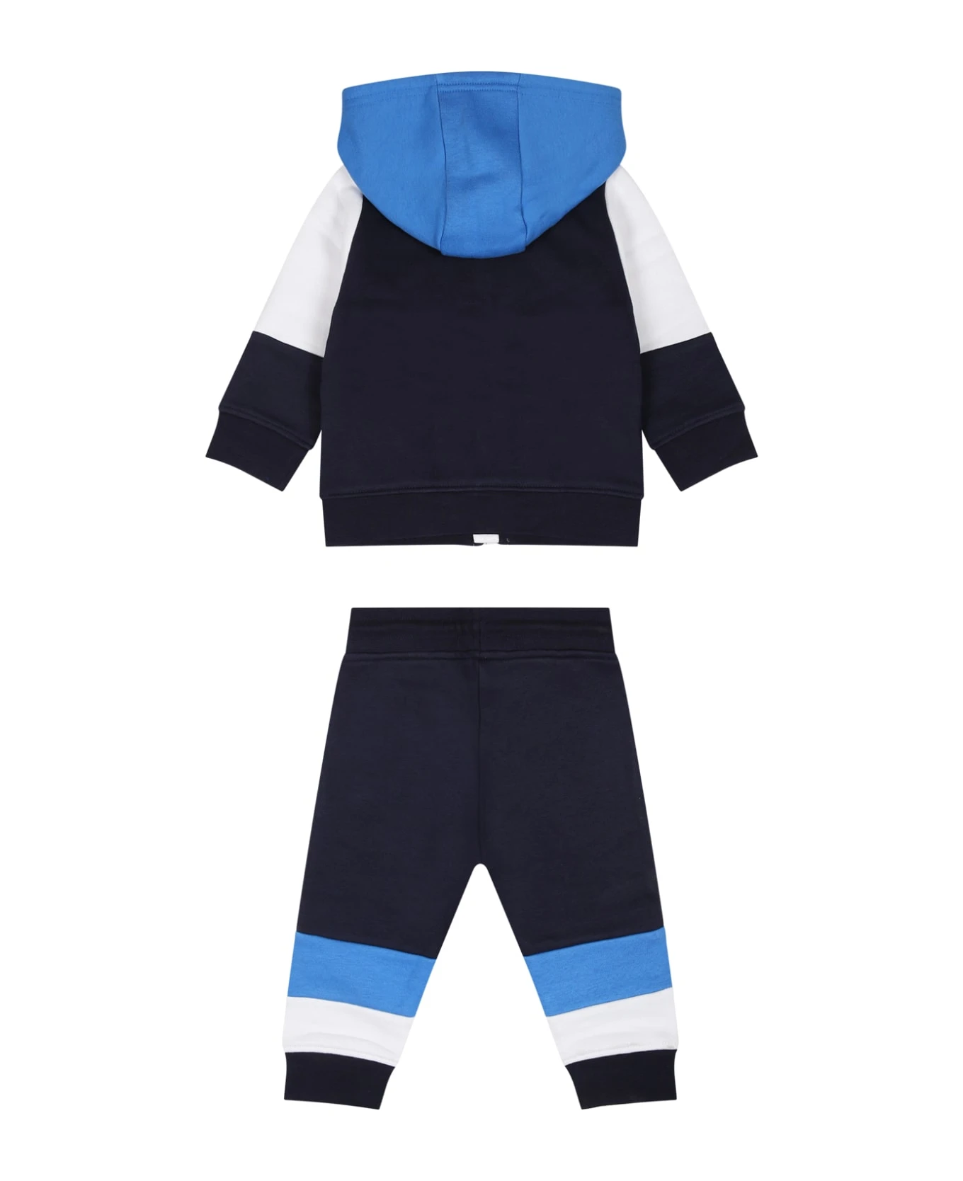 Multicolor sports suplative in cotton blend consisting of a sweatshirt and trousers. Hooded sweatshirt, side pockets, frontal closure with zip, hem and ribbed cuffs; Pants with adjustable coulisse in life, side pockets, ribbed ankles. They are decorated with logo print on the front