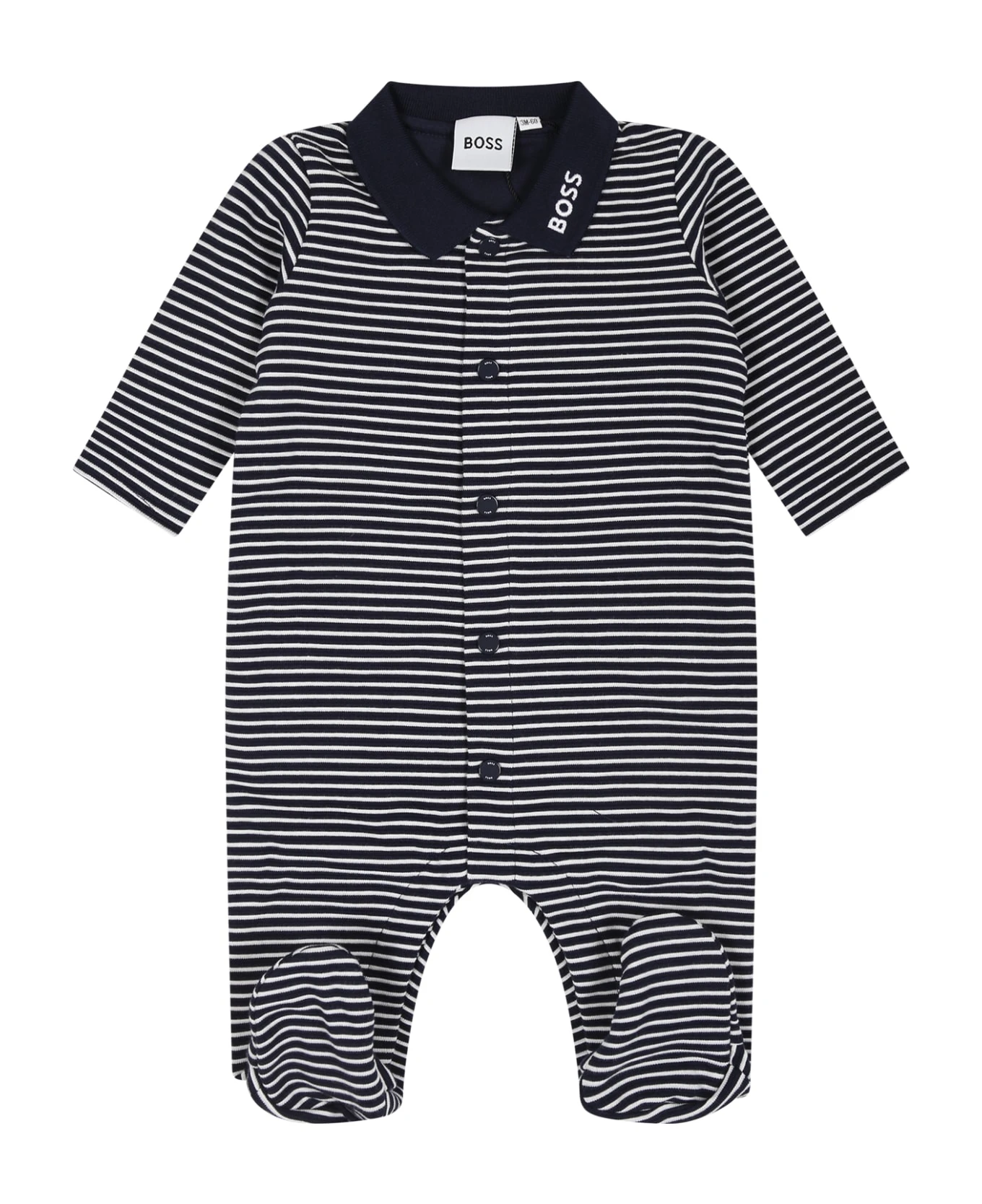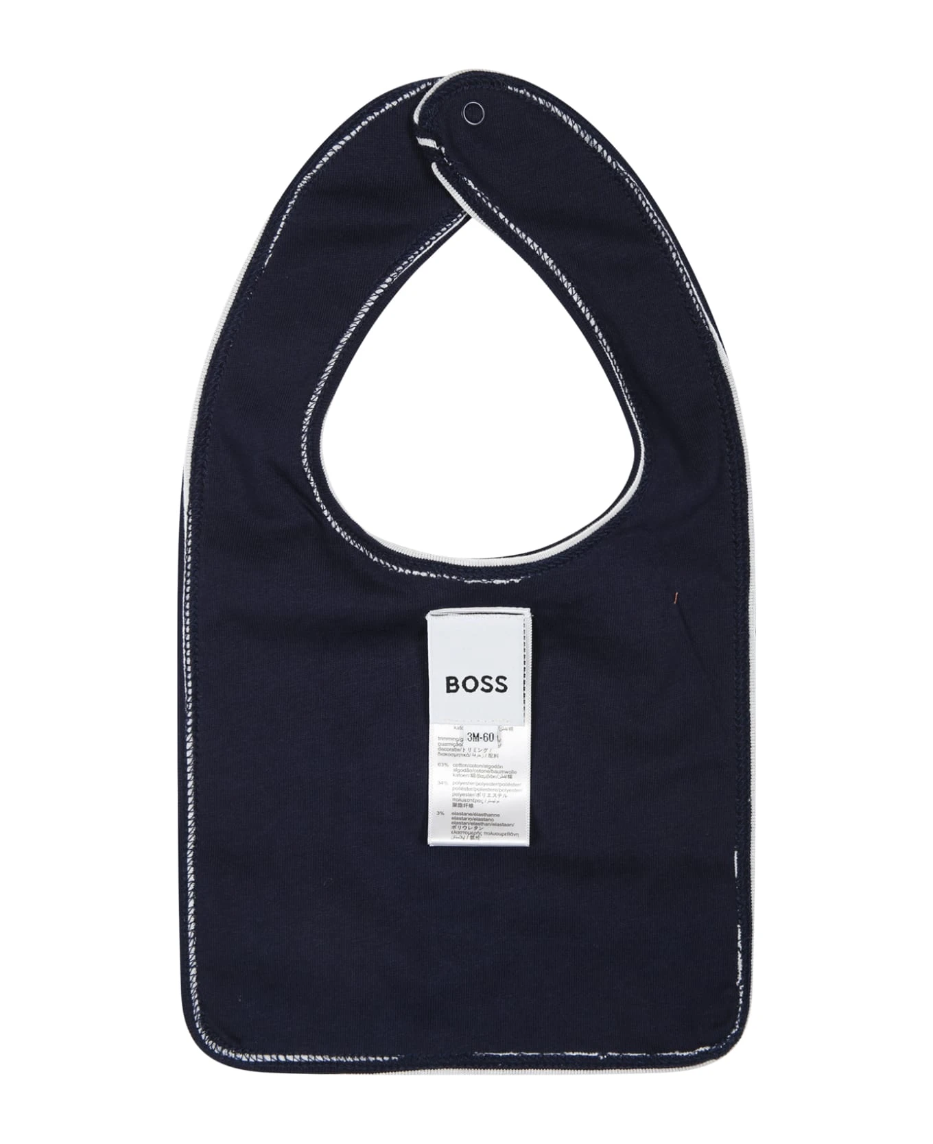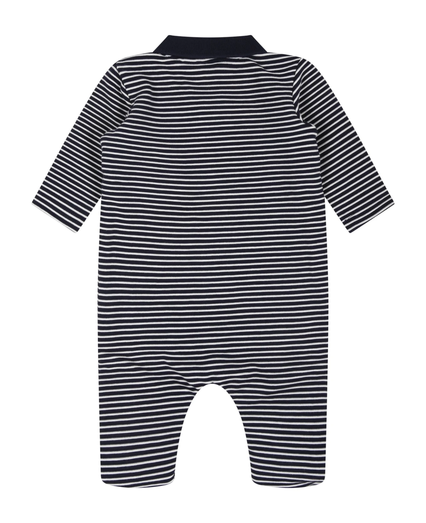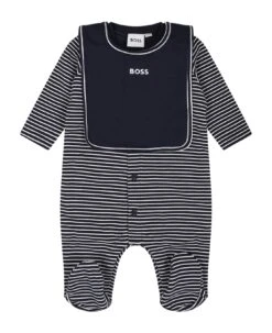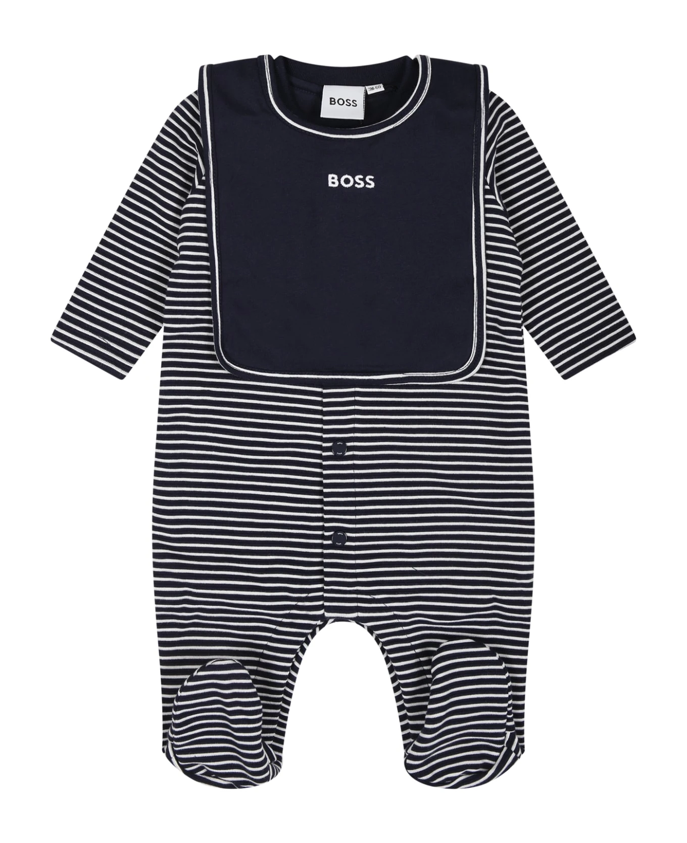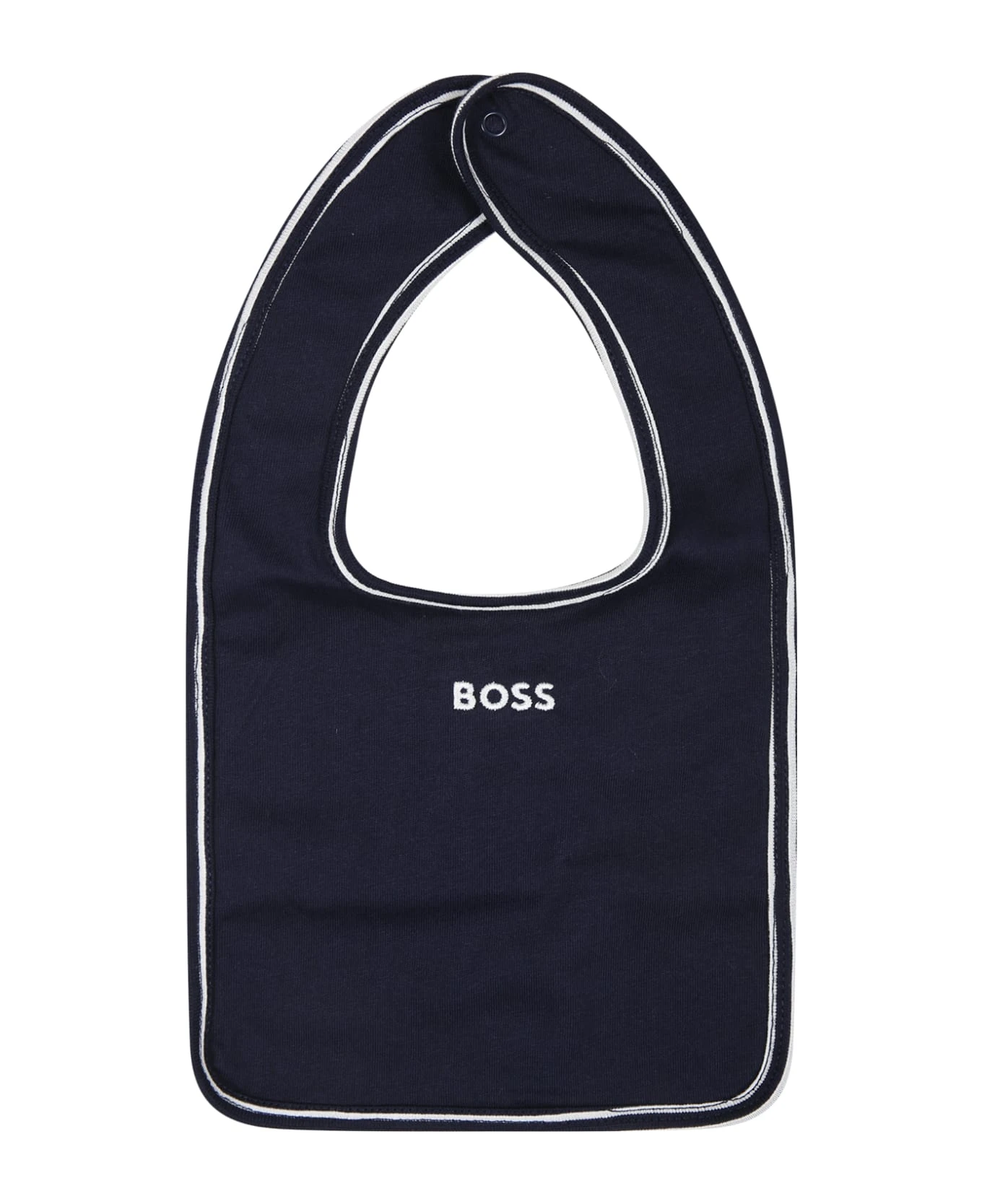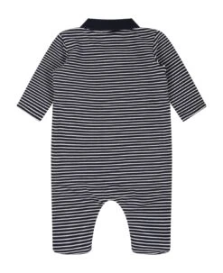 Baby set consisting of long sleeves, front closure with pressure buttons, classic collar and bavaglio in tone. They are decorated with logo embroidery on the front.