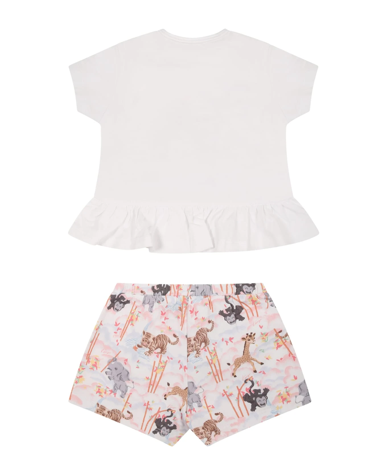 Multicolor suit, in organic cotton, composed of a t-shirt and shorts; white t-shirt, with short sleeves, round neck, snap button closure on the shoulders. It is embellished with iconic tiger and logo on the front. Multicolor shorts, with elastic waist. They are embellished with animal print and all-over logo.