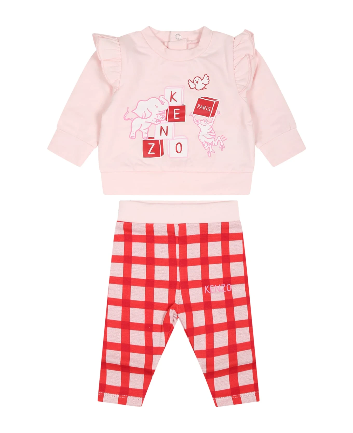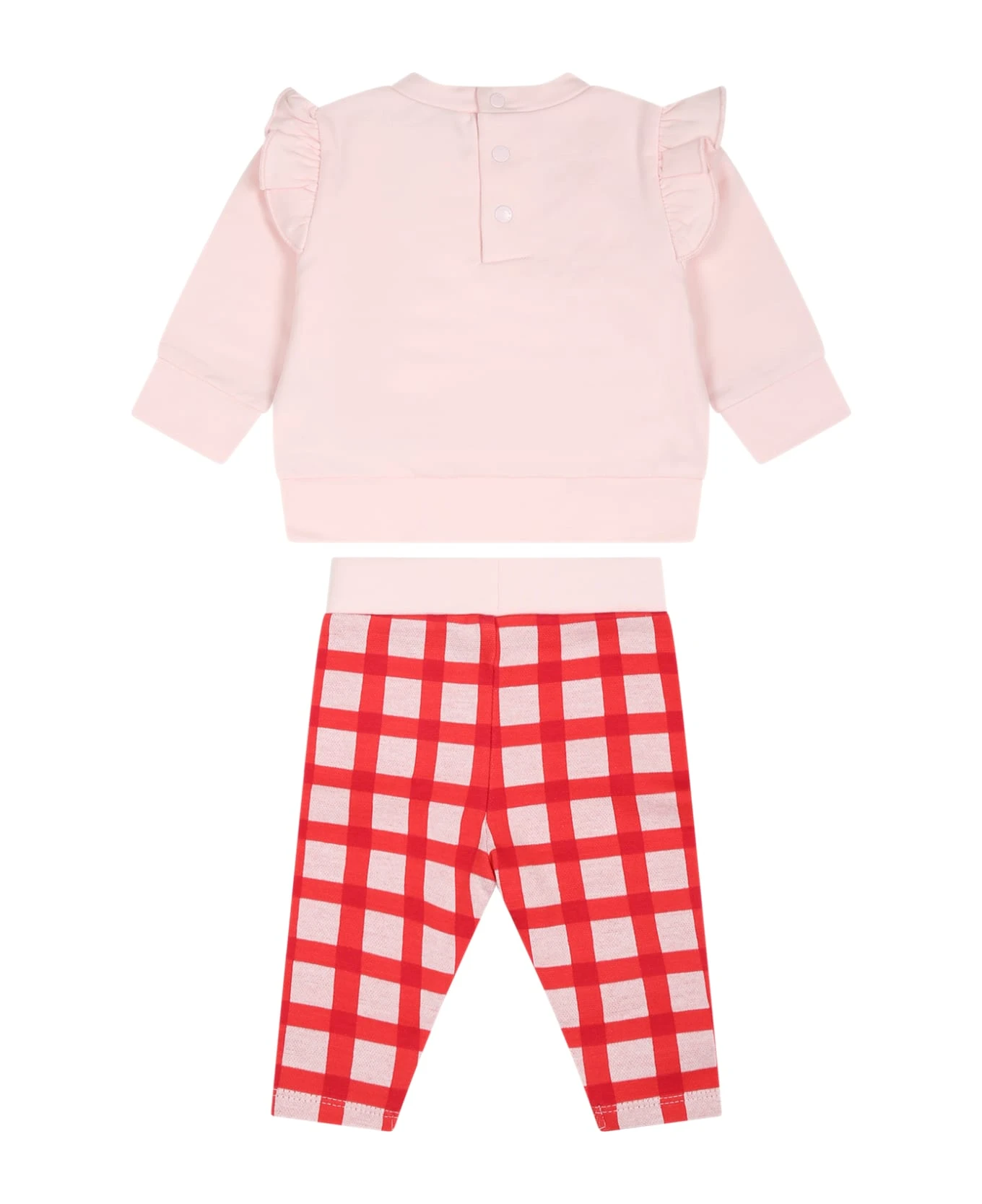 Pink suit composed of sweatshirt and trousers; sweatshirt in fleece cotton, with long sleeves, with round neck, closure with automatic buttons on the back, ruches on the shoulders; it is emebllished with animal print and logo, on the front; trousers with elasticated waist; they are embellished with check pattern.