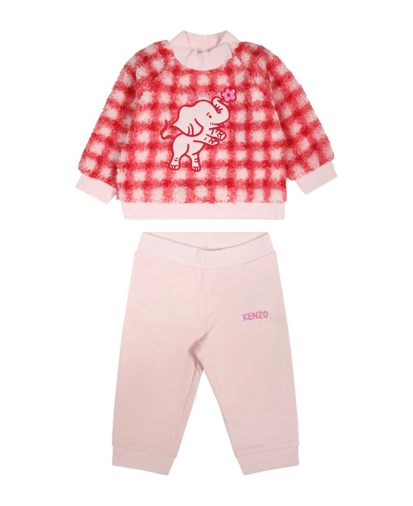 Red suit composed of sweatshirt and trousers; plush sweatshirt, long sleeves, crew neck, snap button closure on the front; it is embellished with all-over checked pattern with elephant and logo, on the front; trousers with elasticated waist and back pocket; they are embellished with logo on the side.