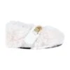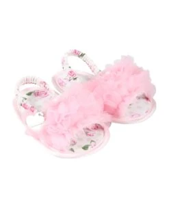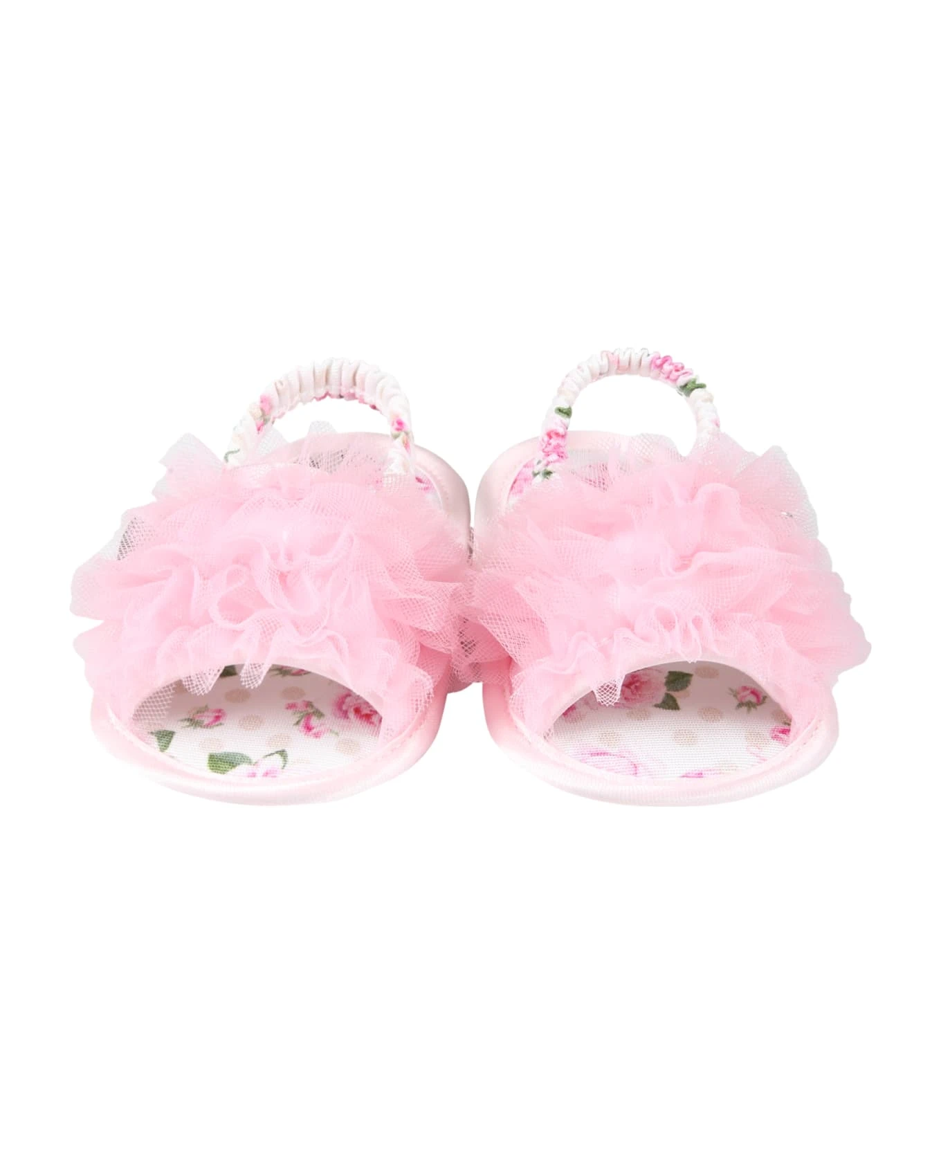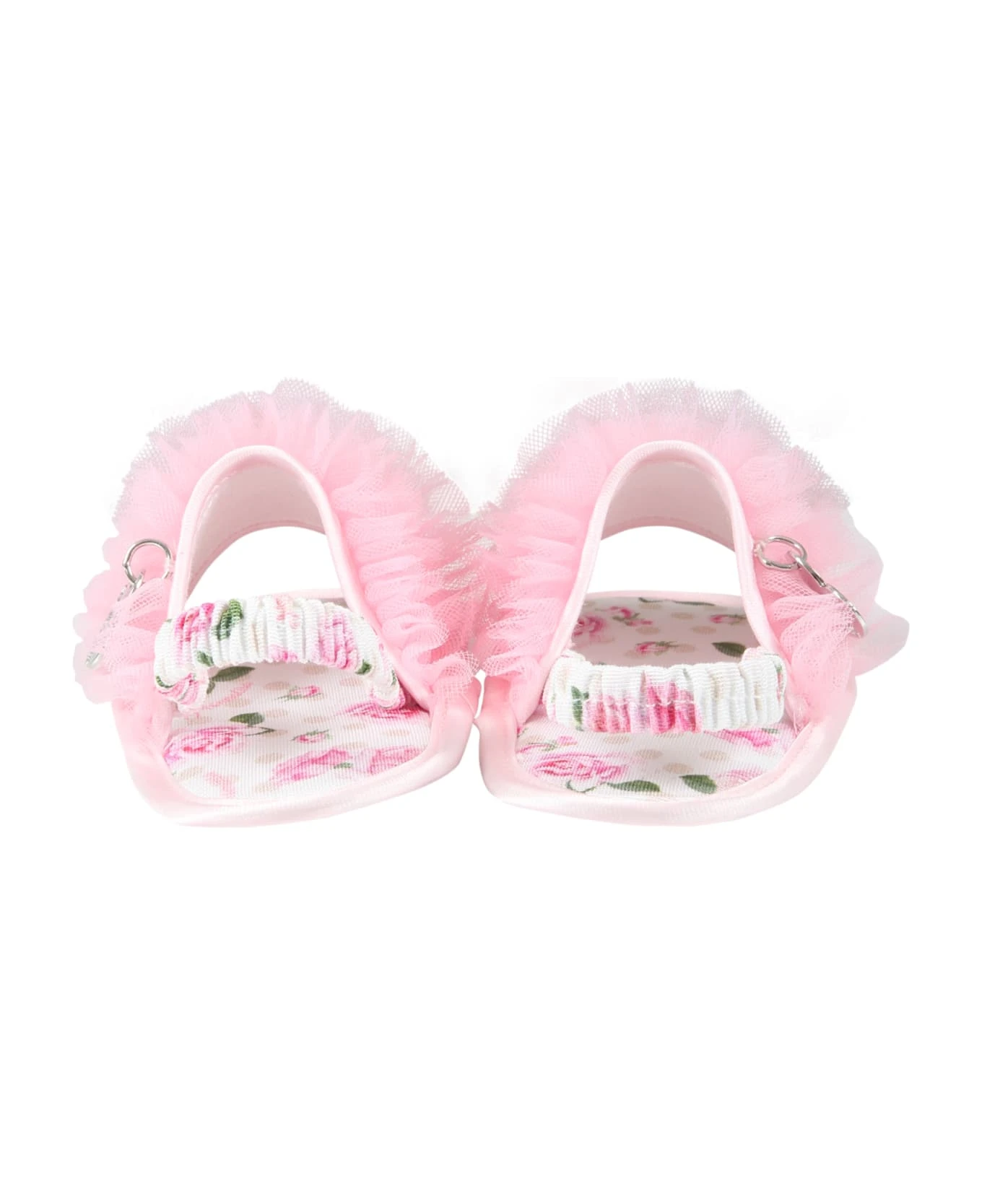 White and pink sandals with detail made from pink tulle on the front and silver charm shaped like heart with logo; the sole is embellished with all-over pink roses and beige polkadots; back elastic bracelet.