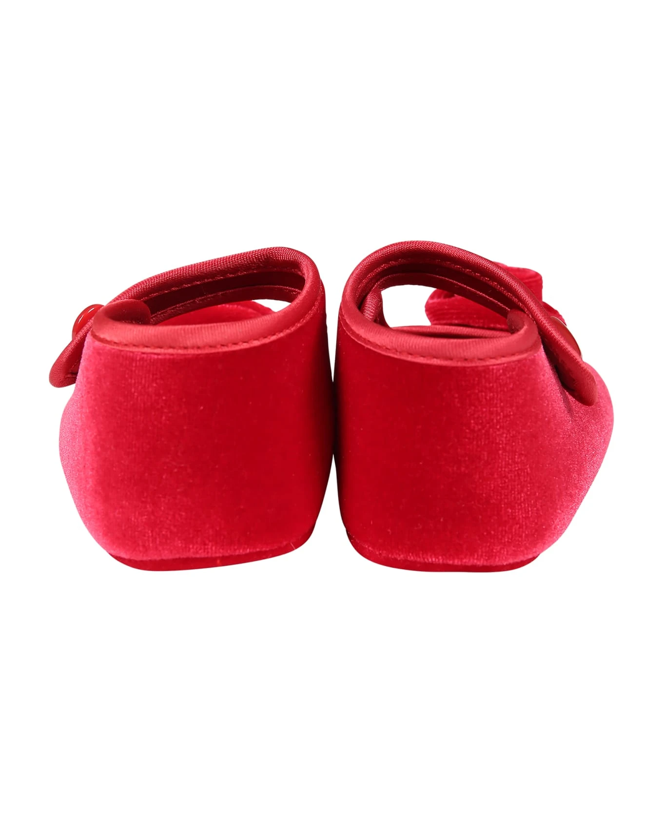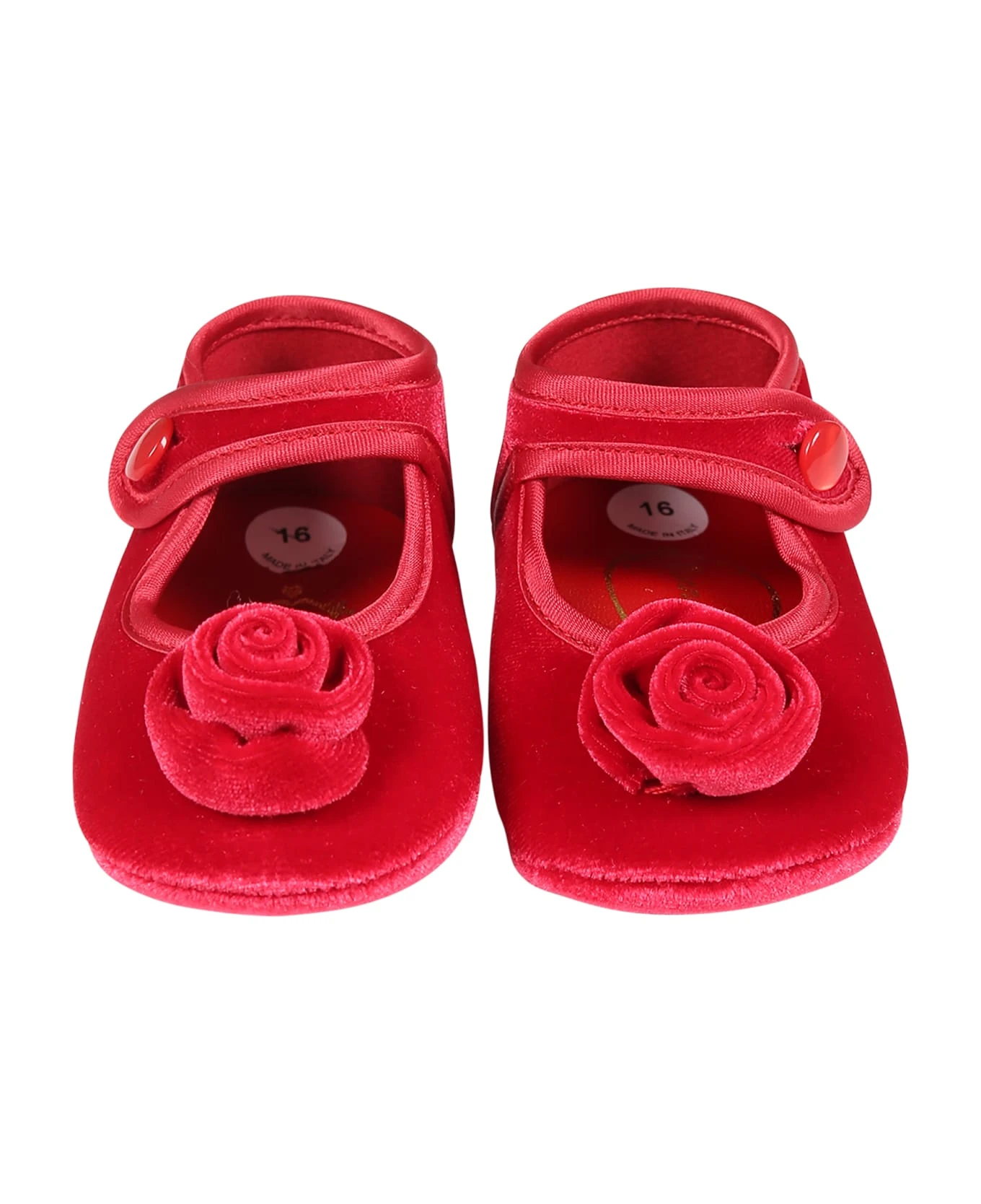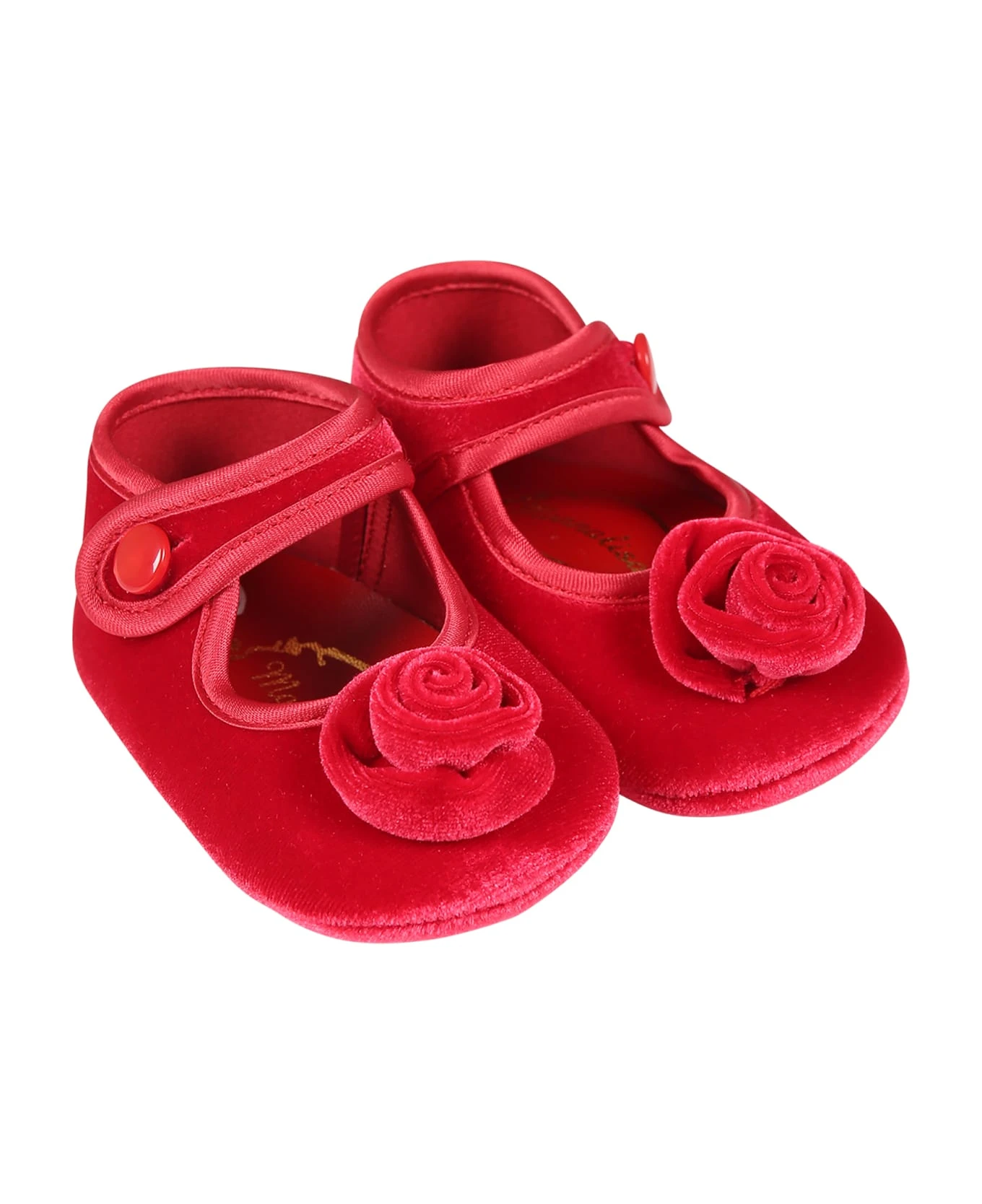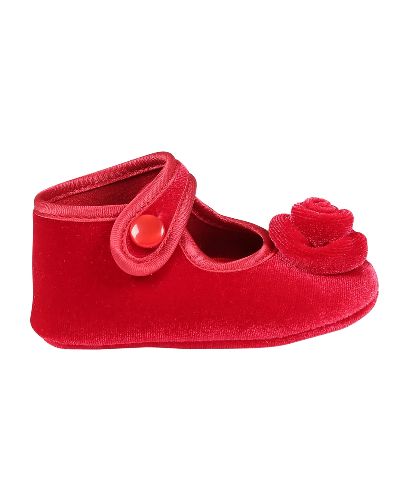 Red chenille flats, with bracelet and button closure, on the side. They are embellished with rose applique on the front