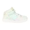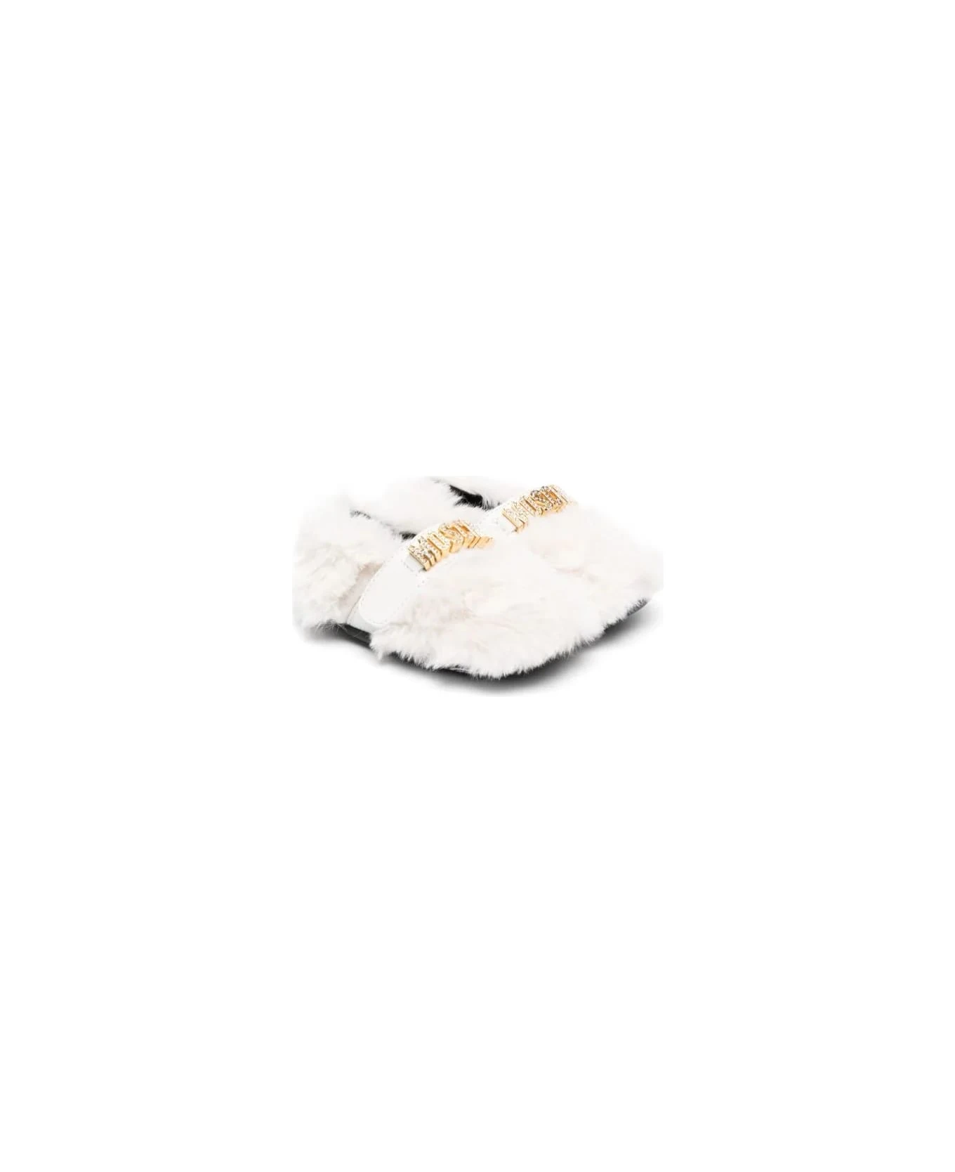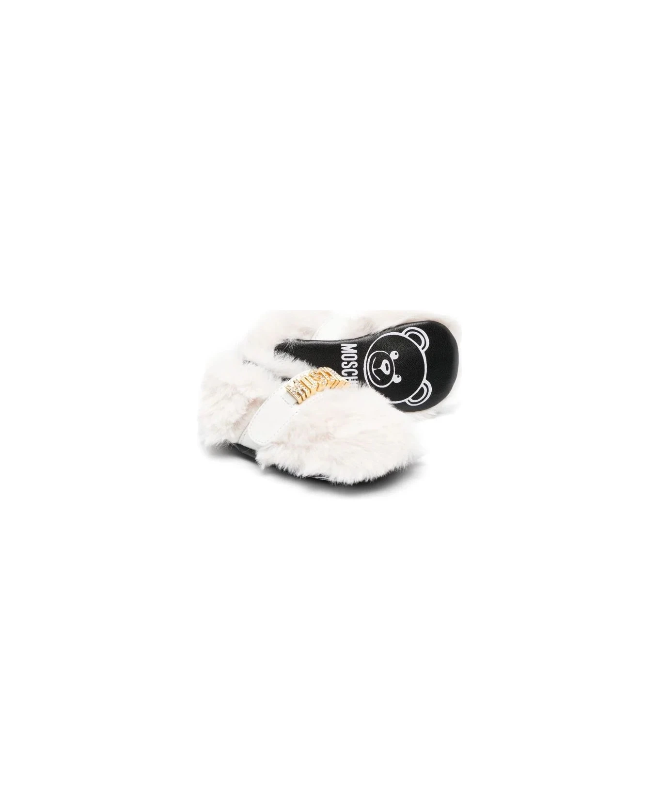 logo-plaque leather ballerinas from MOSCHINO KIDS featuring white, calf leather, faux-fur design, logo plaque, front touch-strap fastening, round toe, branded insole and flat sole.