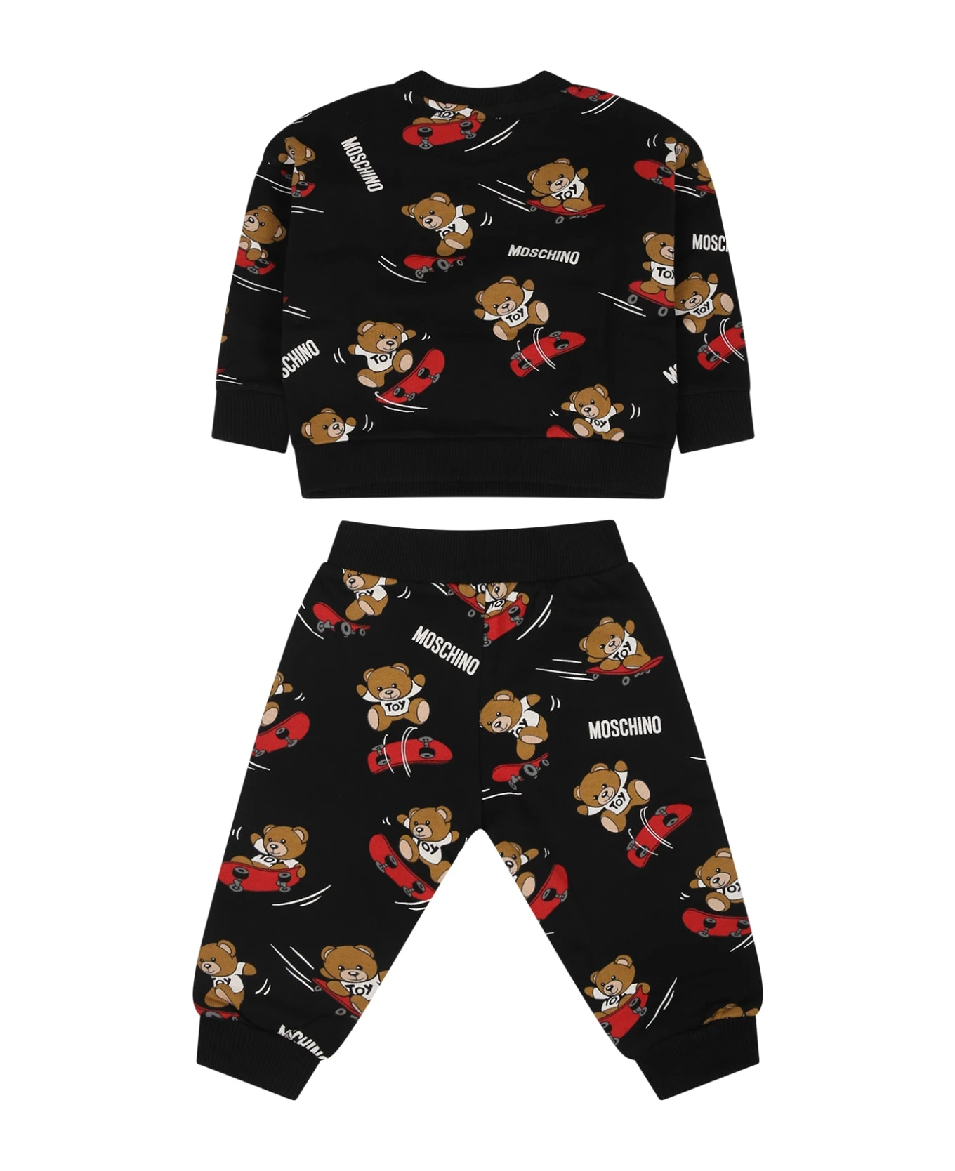 Black set in cotton fleece, composed of sweatshirt and trousers; sweatshirt with long sleeves, ribbed crew neck, cuffs and hem, snap button closure on the shoulder; trousers with elasticated waist, side pockets and ribbed ankles. They are embellished with all-over Teddy Bear with skateboard and logo.
