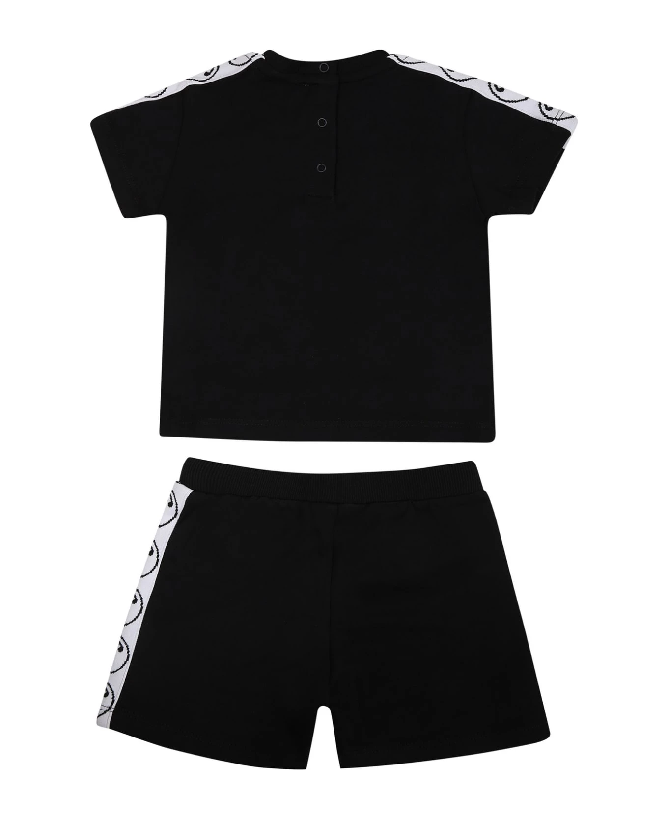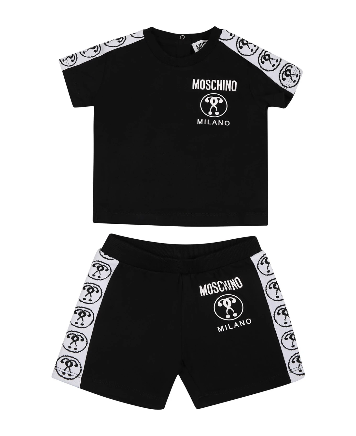 Black suit composed of t-shirt and shorts; short-sleeved t-shirt, with crew-neck and closure with automatic buttons on the back, bands on the shoulders; it is embellished with double question mark and logo on the chest; shorts with elastic waistband and bands on the sides; they are embellished with double question mark and logo on the side.