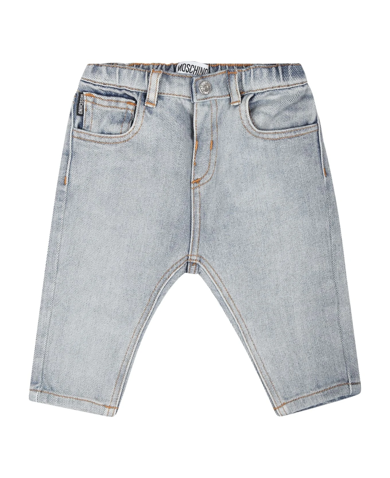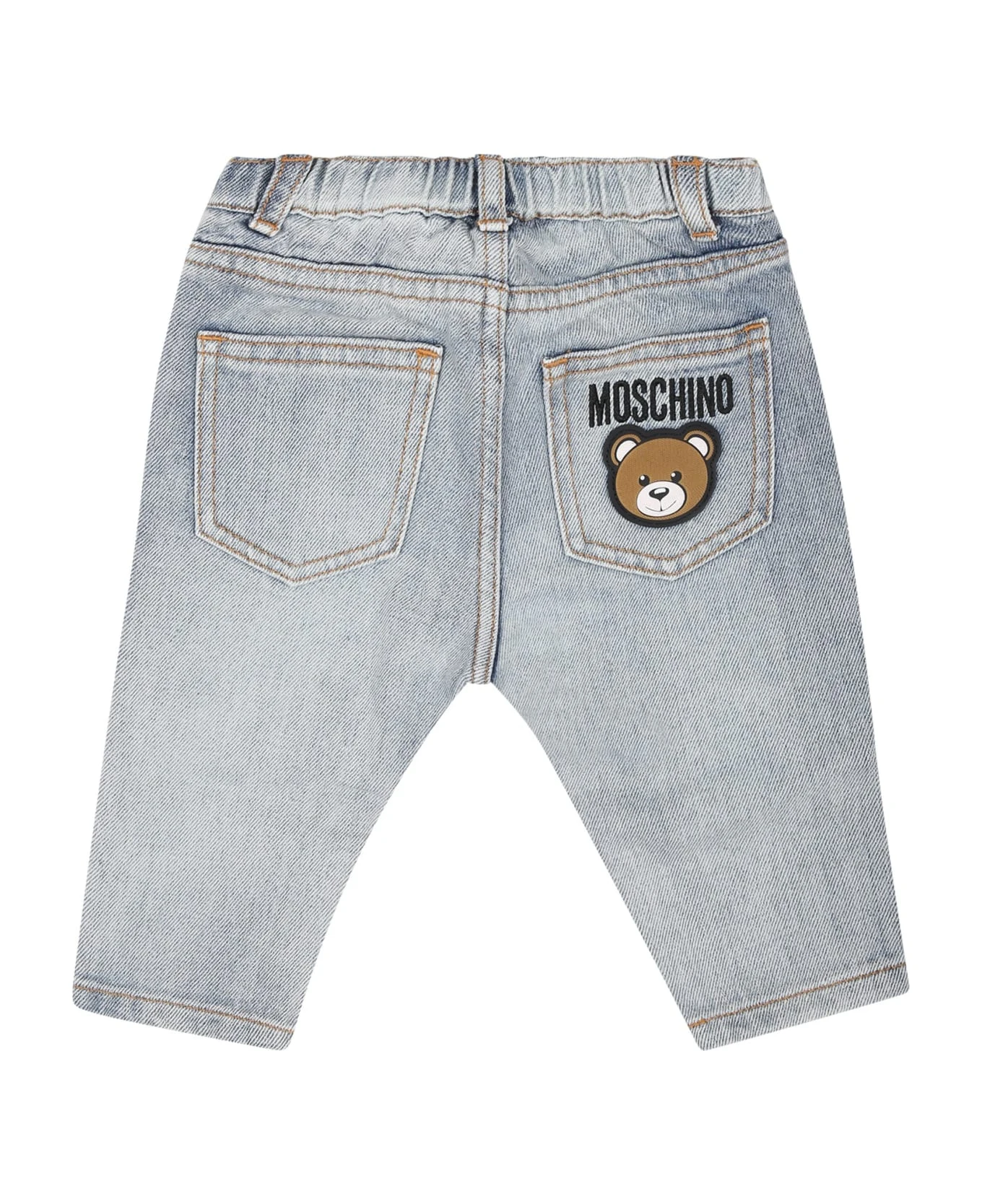 Blue denim jeans, five pockets, with belt loops, front closure with button. They are embellished with Teddy bear patch and logo on the back.