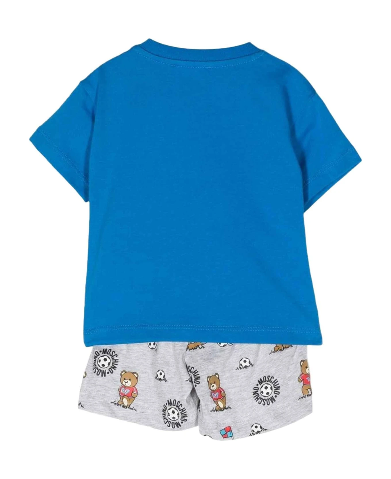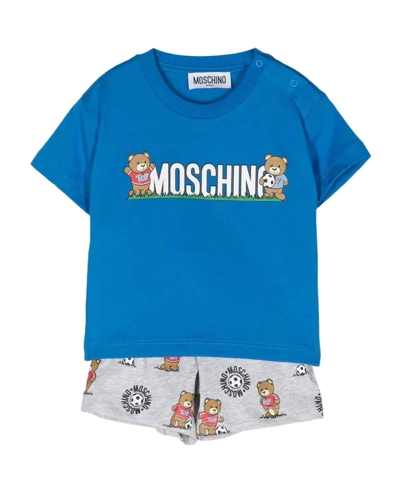 Blue set baby unisex. Signature Teddy Bear motif, round neckline, logo print to chest, short sleeves, straight hem, elasticated waistband, all-over logo print, straight fit, straight fit and knee length. 100% Cotton