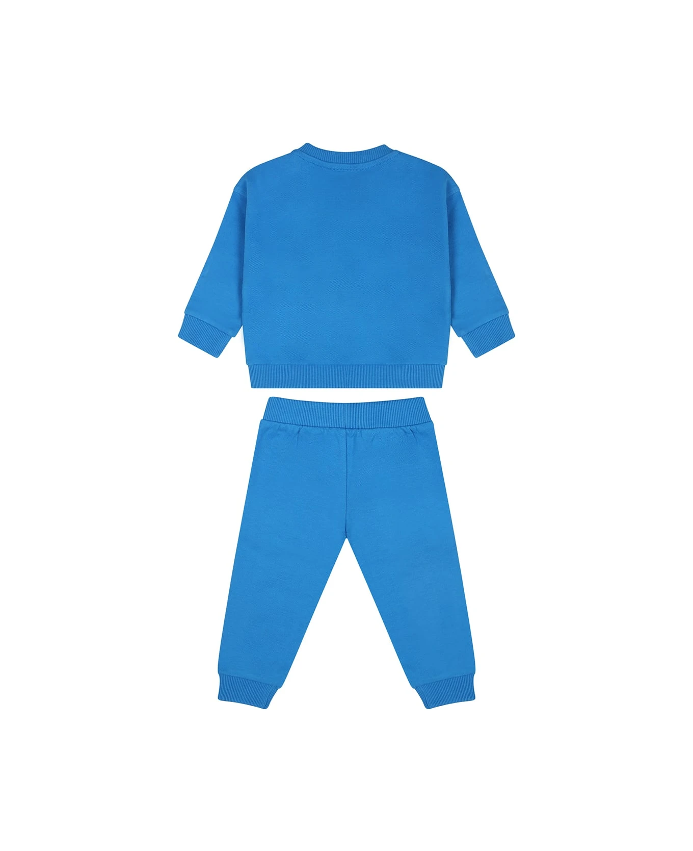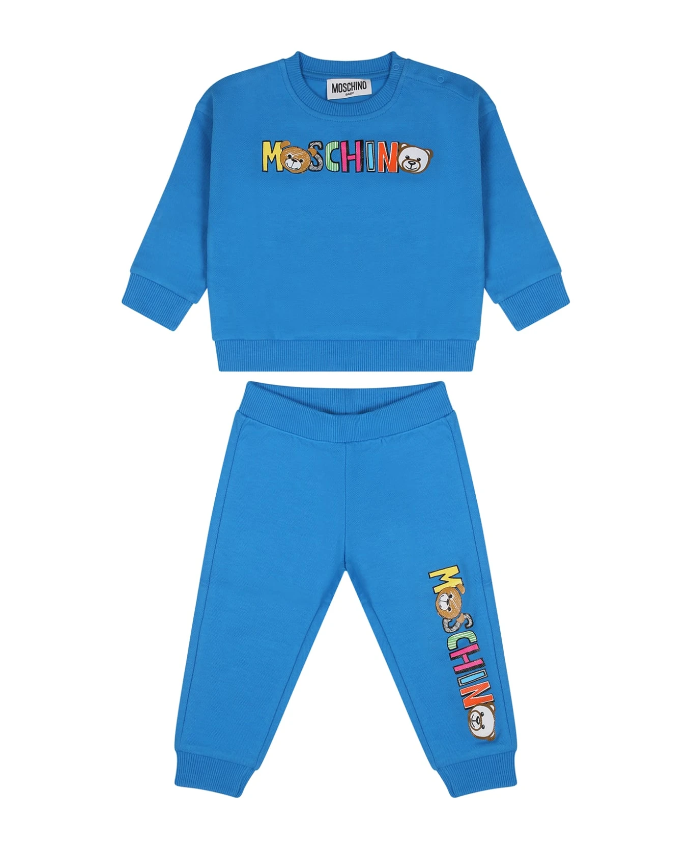 Blue fleece cotton suit, composed of sweatshirt and trousers. Long-sleeved sweatshirt with ribbed crew neck, cuffs and hem. snap button closure on the shoulder. It is embellished with multicol logo and Teddy Bear on the front. Trousers with elastic waist, ribbed ankles. They are embellished with multicolor logo and Teddy bear on the side.