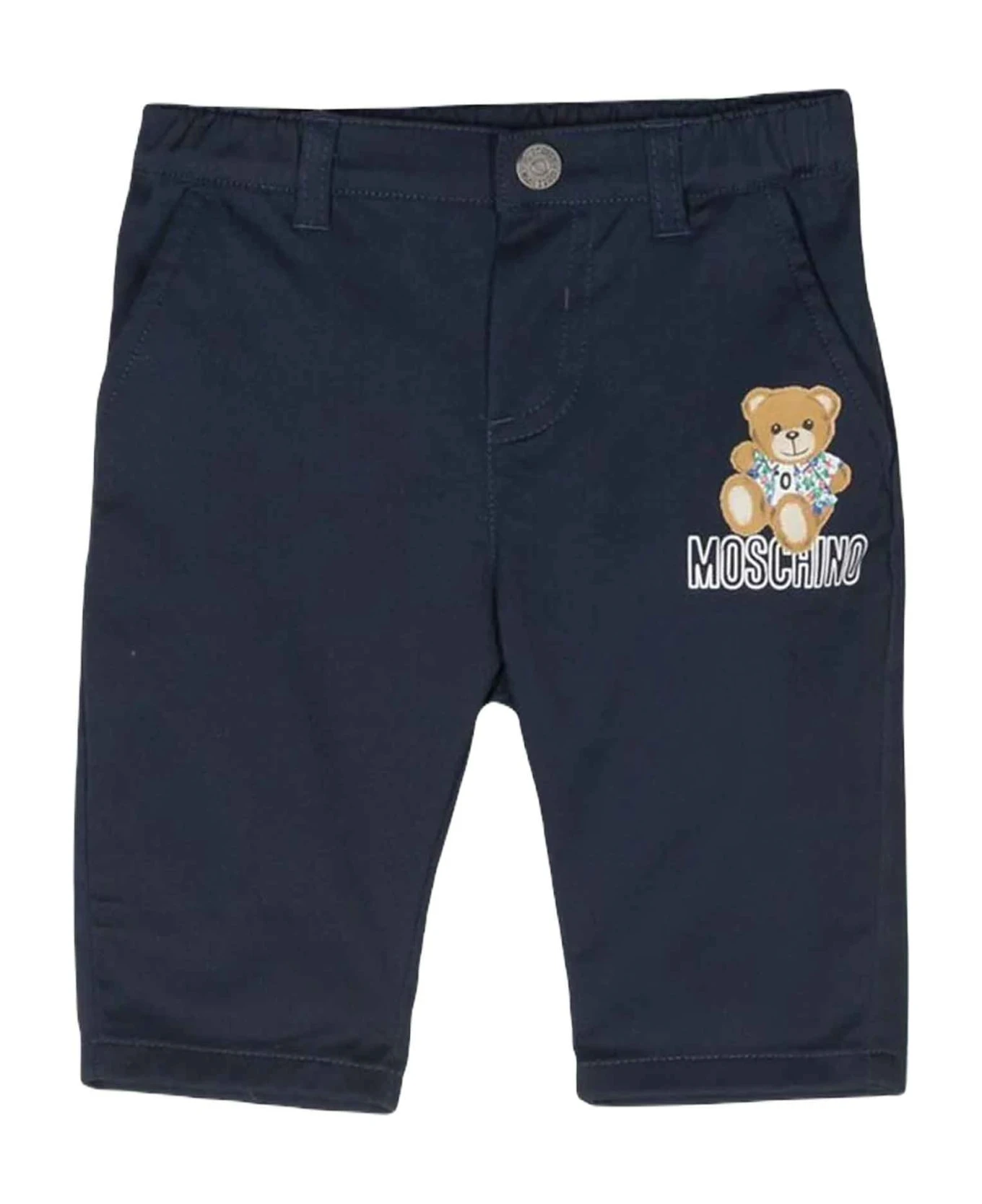 Blue trousers baby unisex. Front closure with buttons and zip, two pockets with inserts and two back welt pockets. Cotton 97%, Elastane 3%