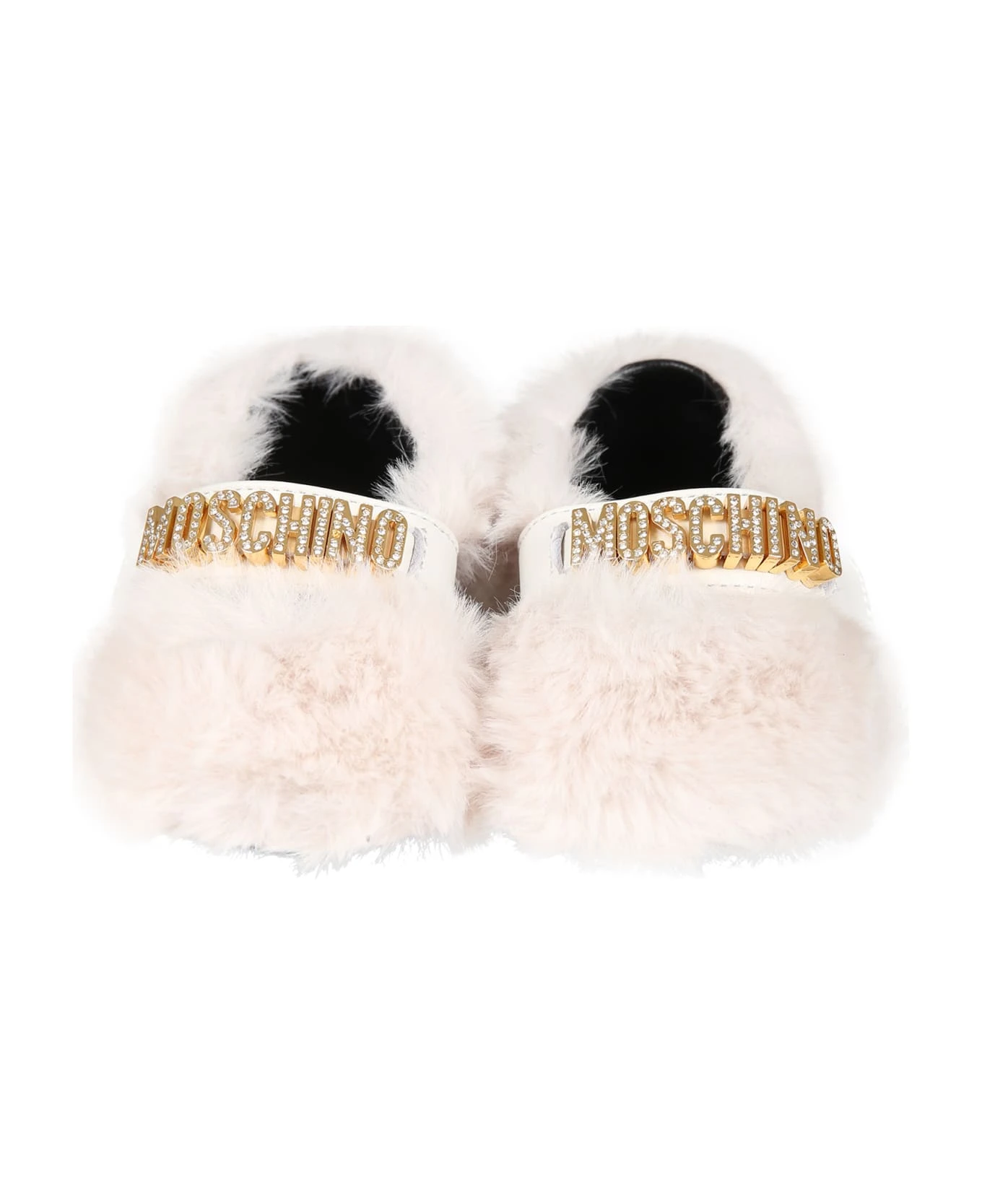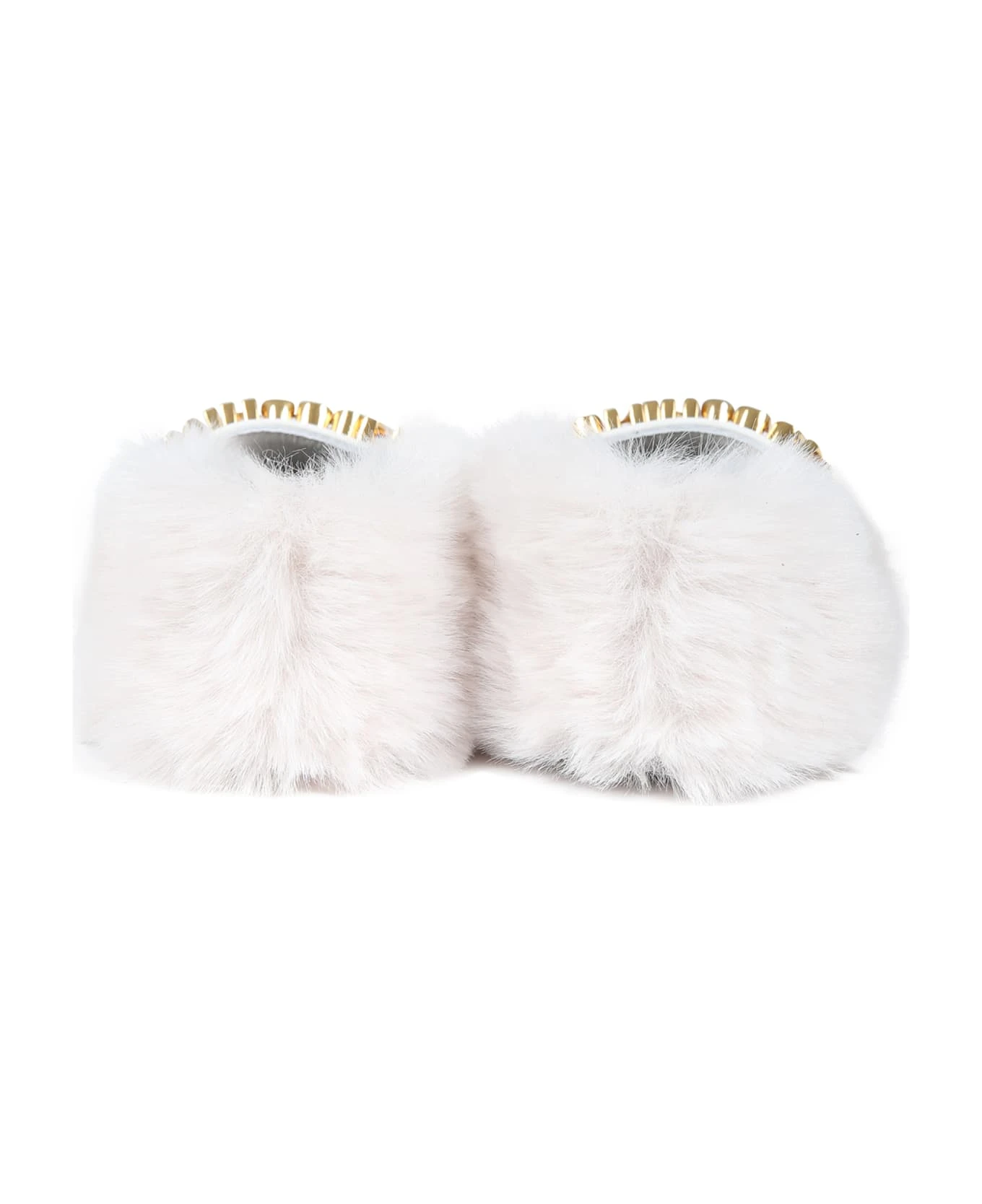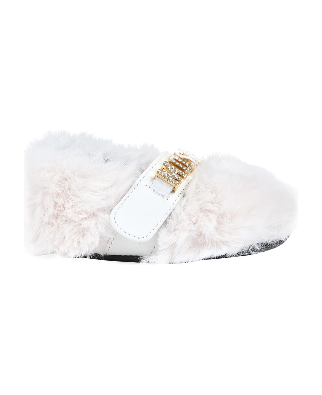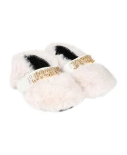 Ivory ballet flats in faux fur, with leather sole, strap and velcro closure. They are embellished with rhinestone logo on the top.