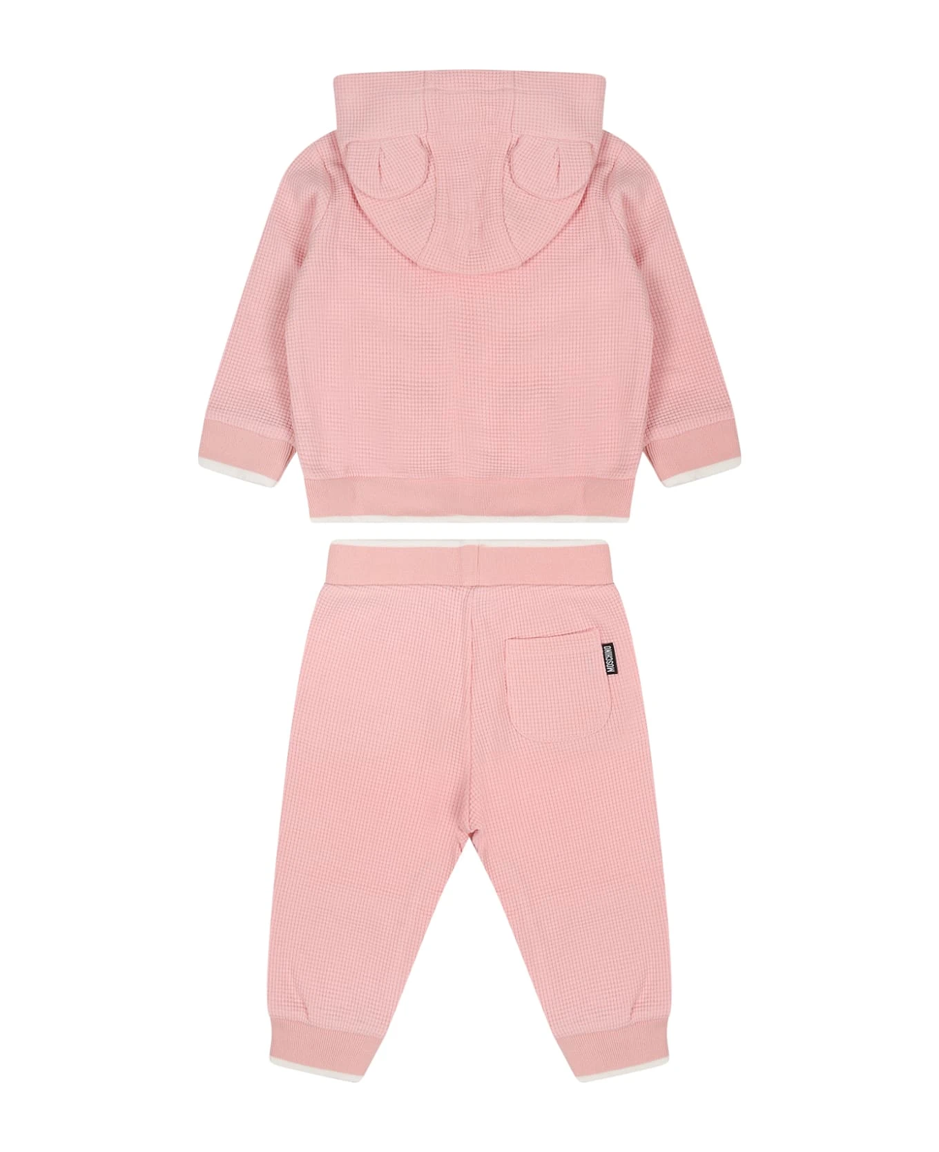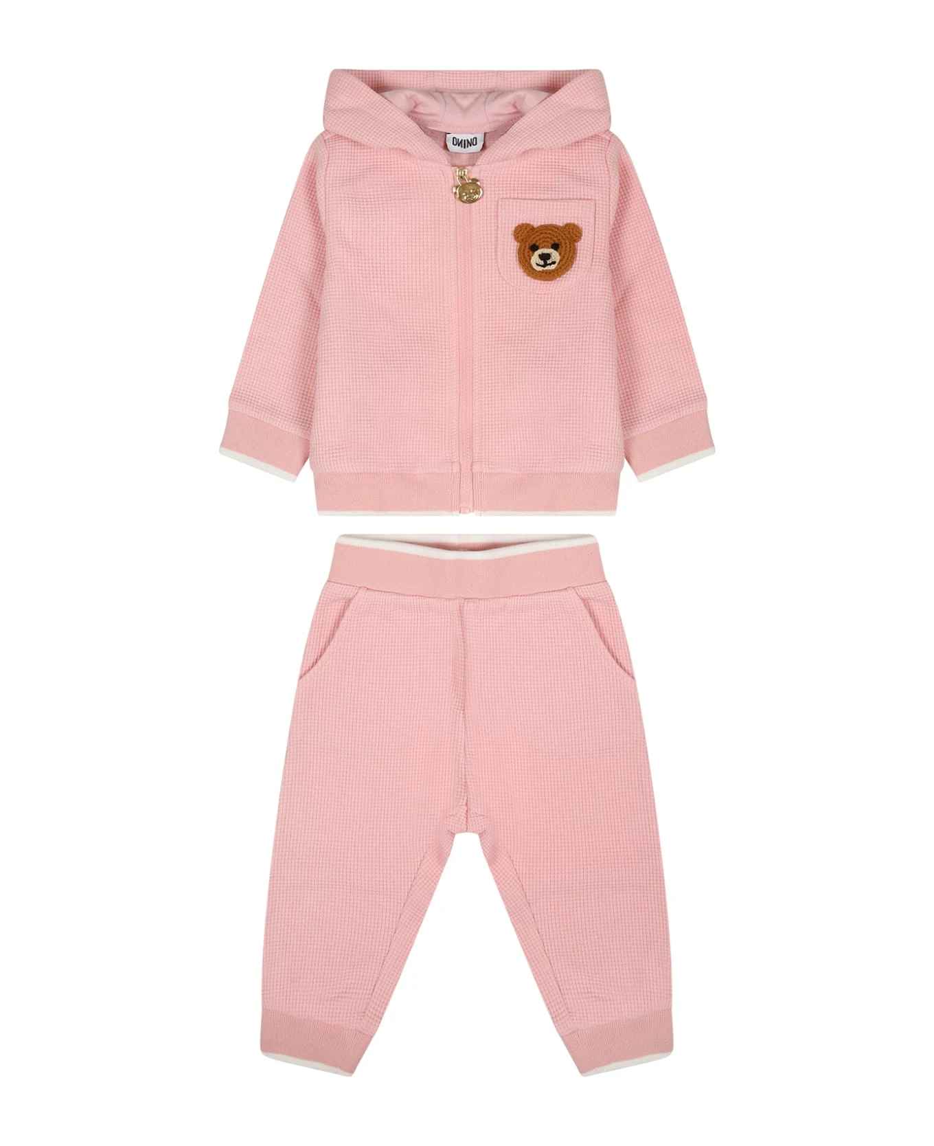 Pink tracksuit in cotton blend, composed of sweatshirt and trousers; sweatshirt with long sleeves, hood, ribbed cuffs and hem, front zip closure, patch pocket on the chest; it is embellished with Teddy Bear embroidered on the front; trousers with elasticated waist, side pockets and back pocket.