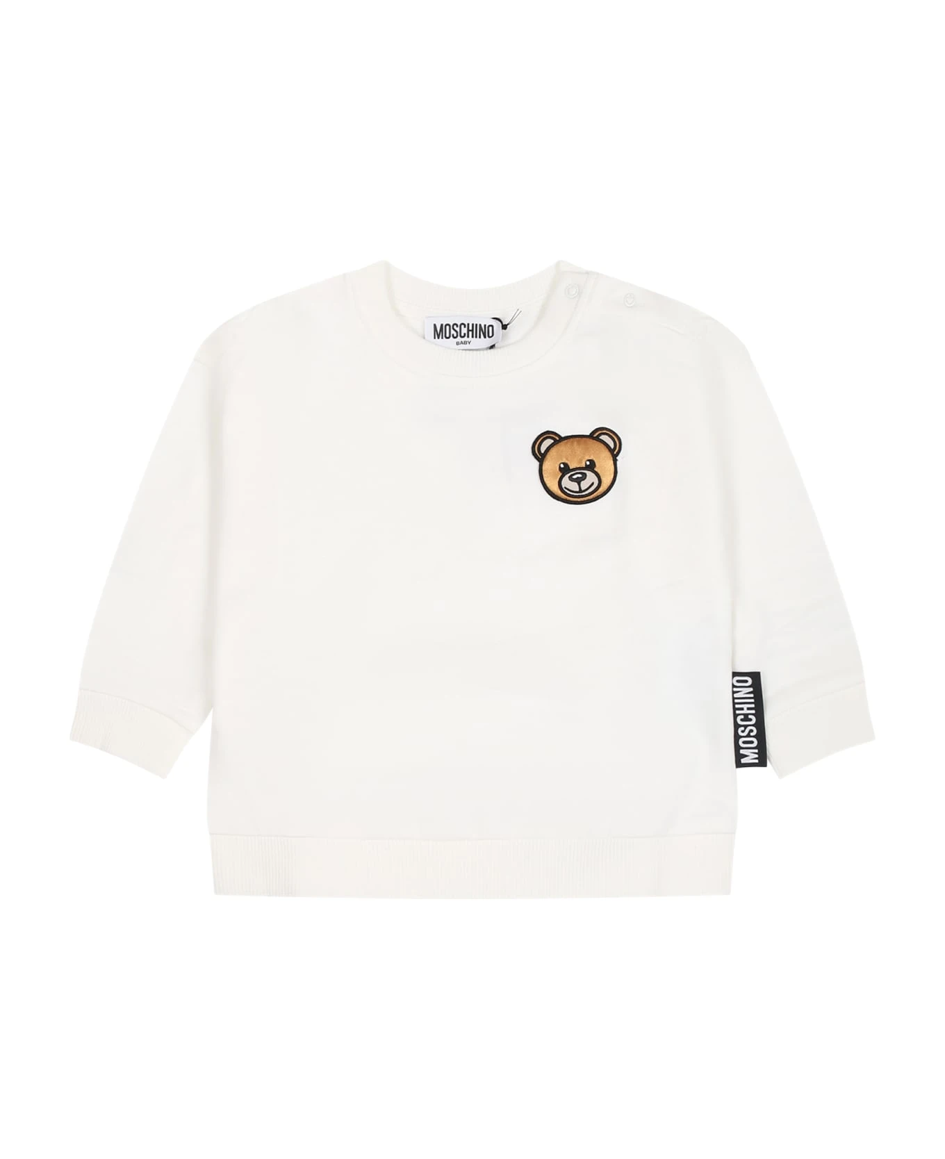 White sweatshirt in cotton fleece, with long sleeves, with ribbed crew neck, cuffs and hem and snap button closure on the shoulder. It is embellished with Teddy Bear applied on the chest and logoed patch on the side.
