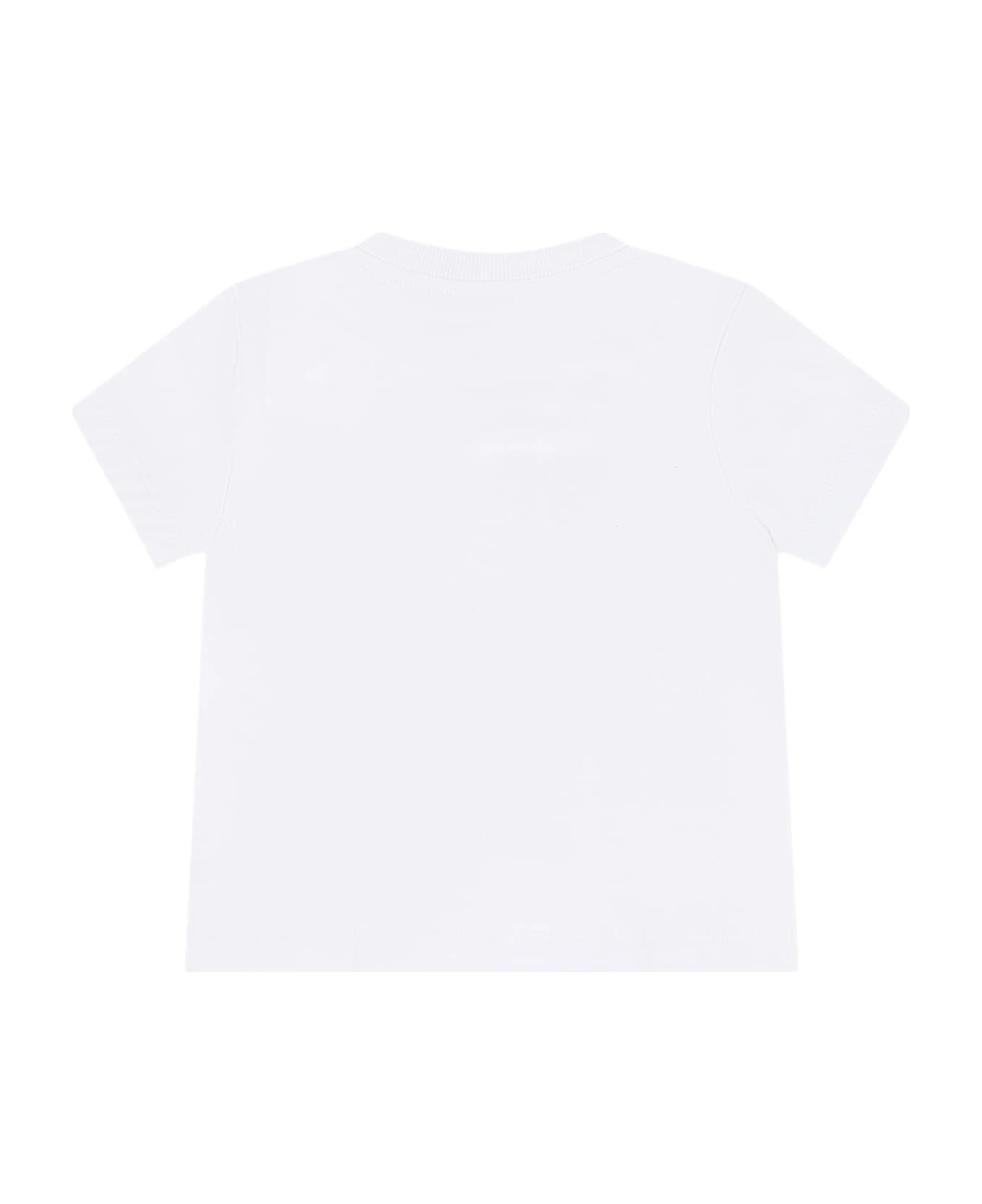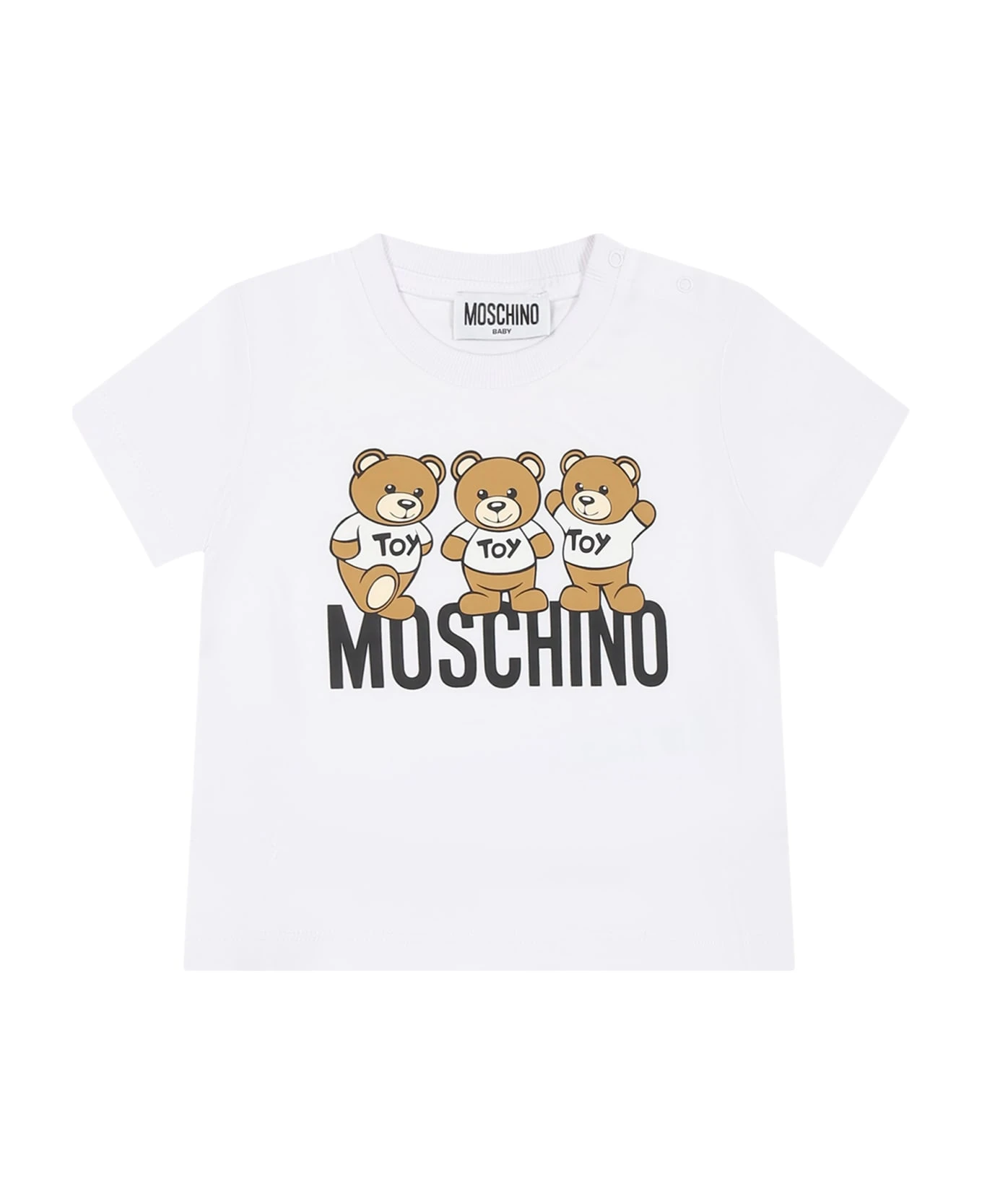 White cotton t-shirt, with short sleeves, ribbed crew neck and snap button closure on the shoulder. It is embellished with three Teddy Bears and logo, on the front.