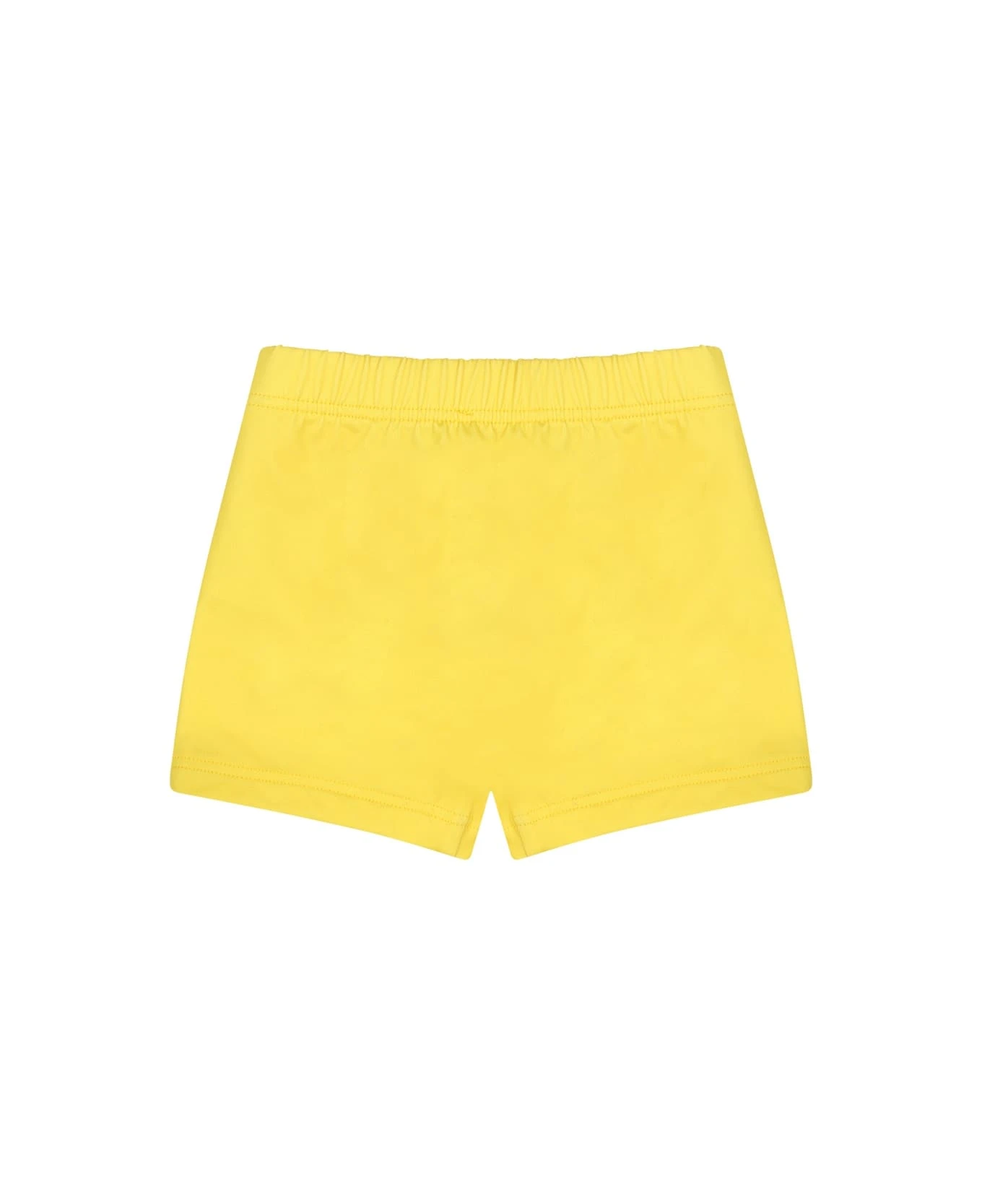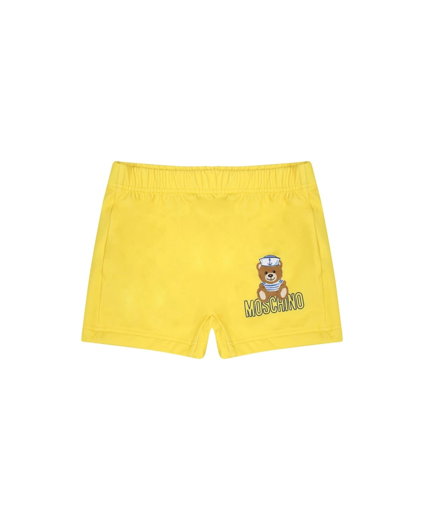 Yellow swim boxer, with elastic waistband. It is embellished with Teddy Bear and logo, on the front.