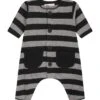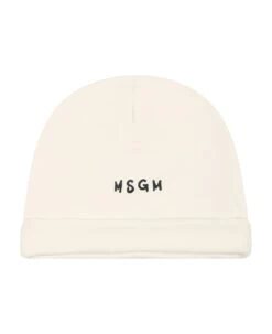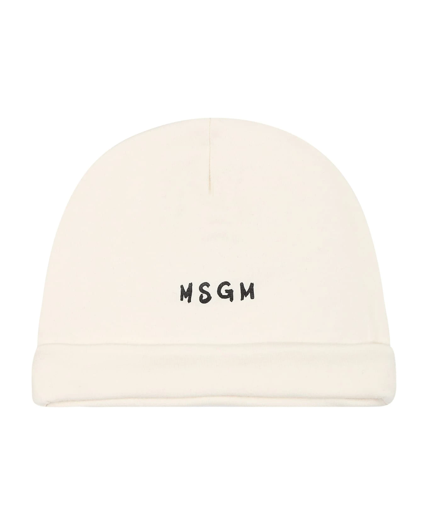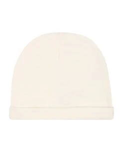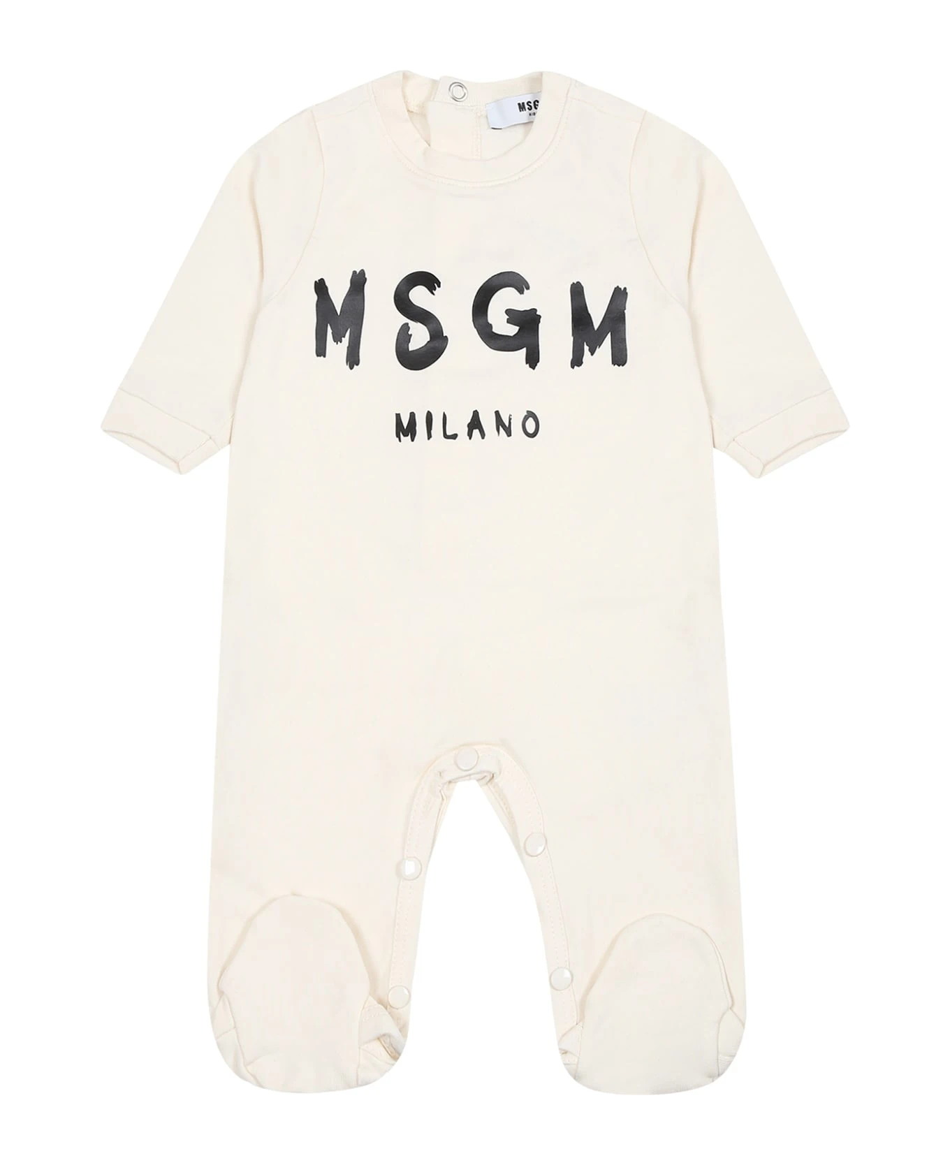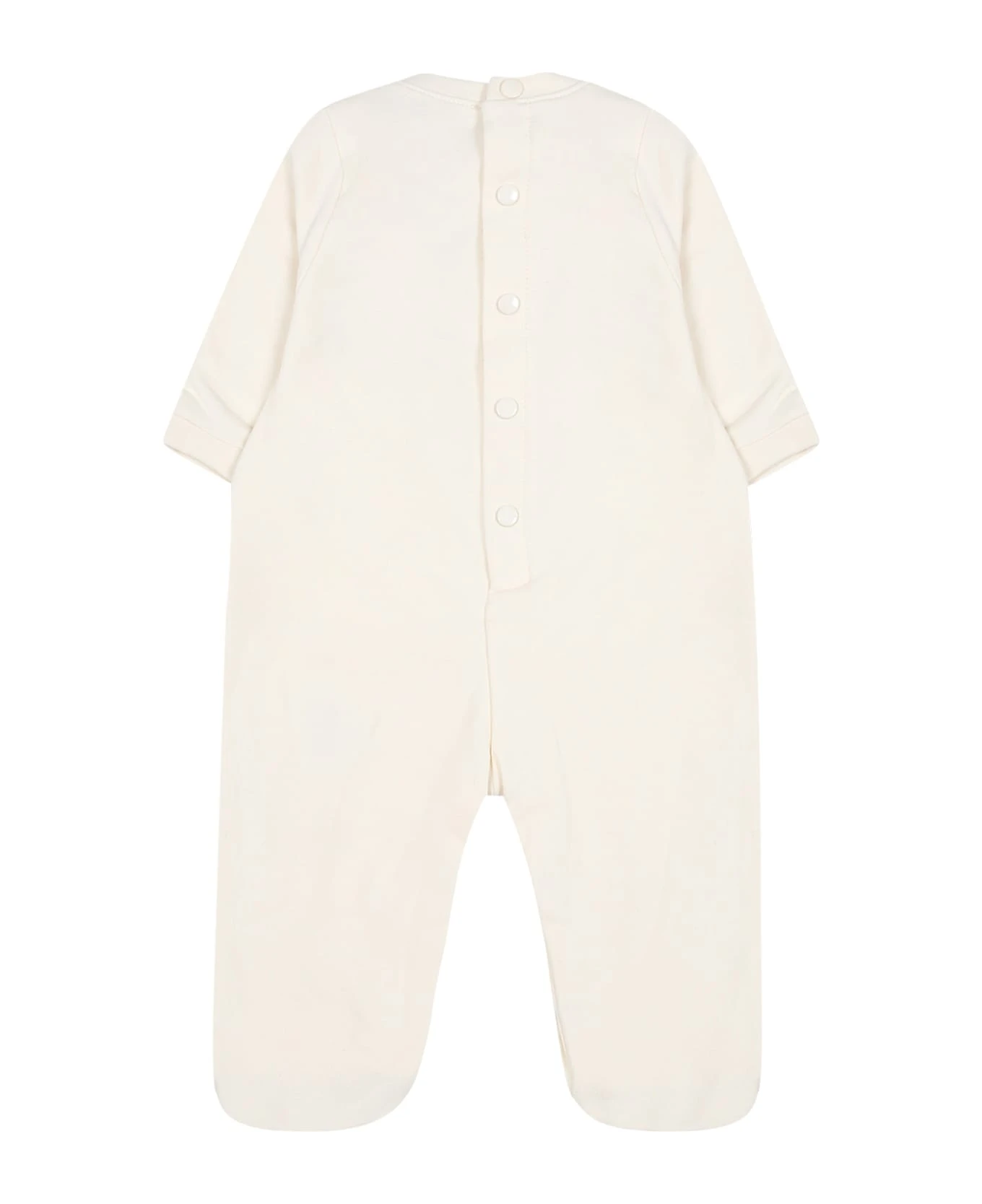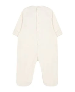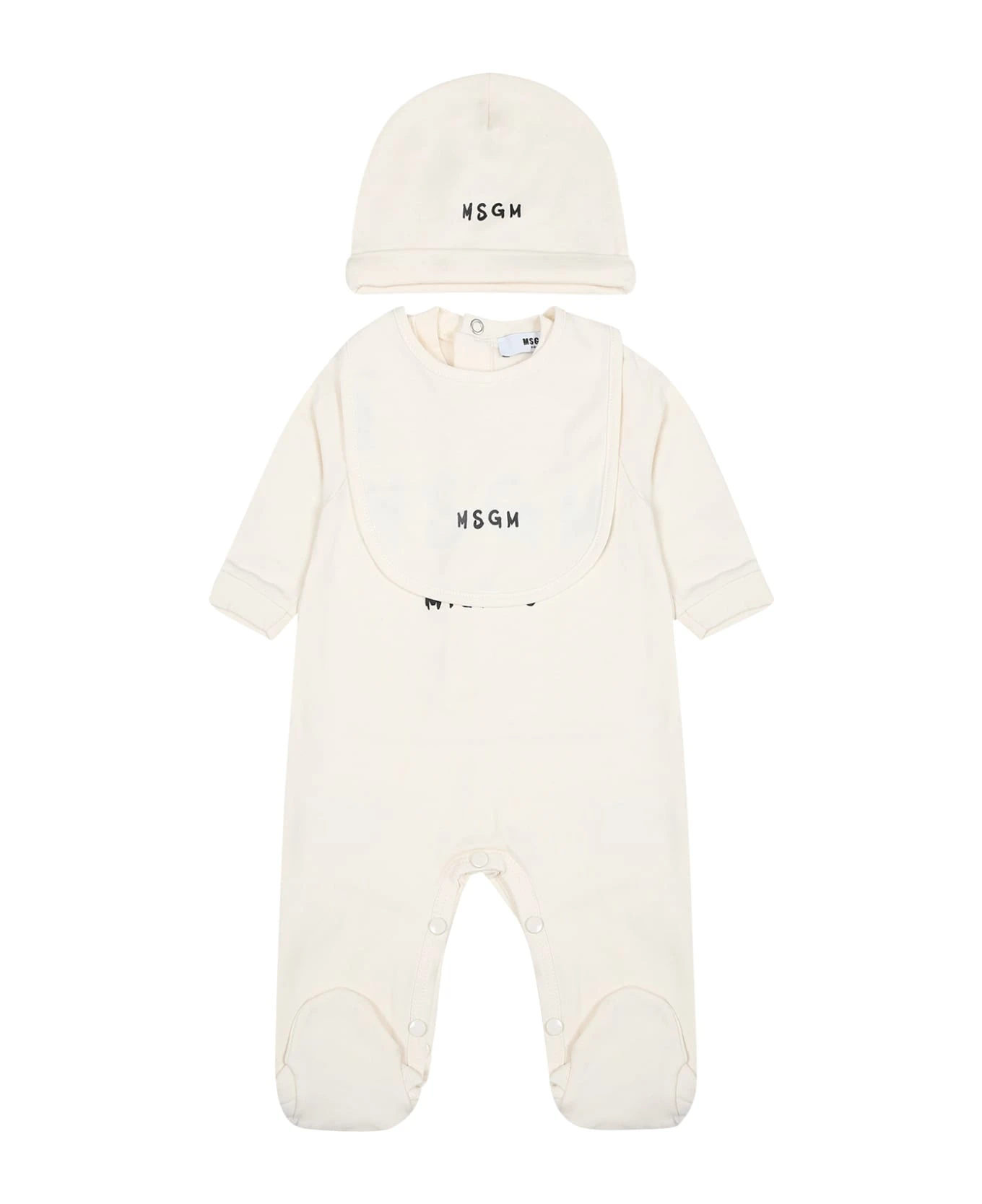 Ivory set composed of babygrow, bib and hat; cotton fleece babygrow, with long sleeves, ribbed crew neck and cuffs, feet, snap button closure on the back and between the legs; bib with snap closure on the back; cuffed hat. They are embellished with black logo on the front.