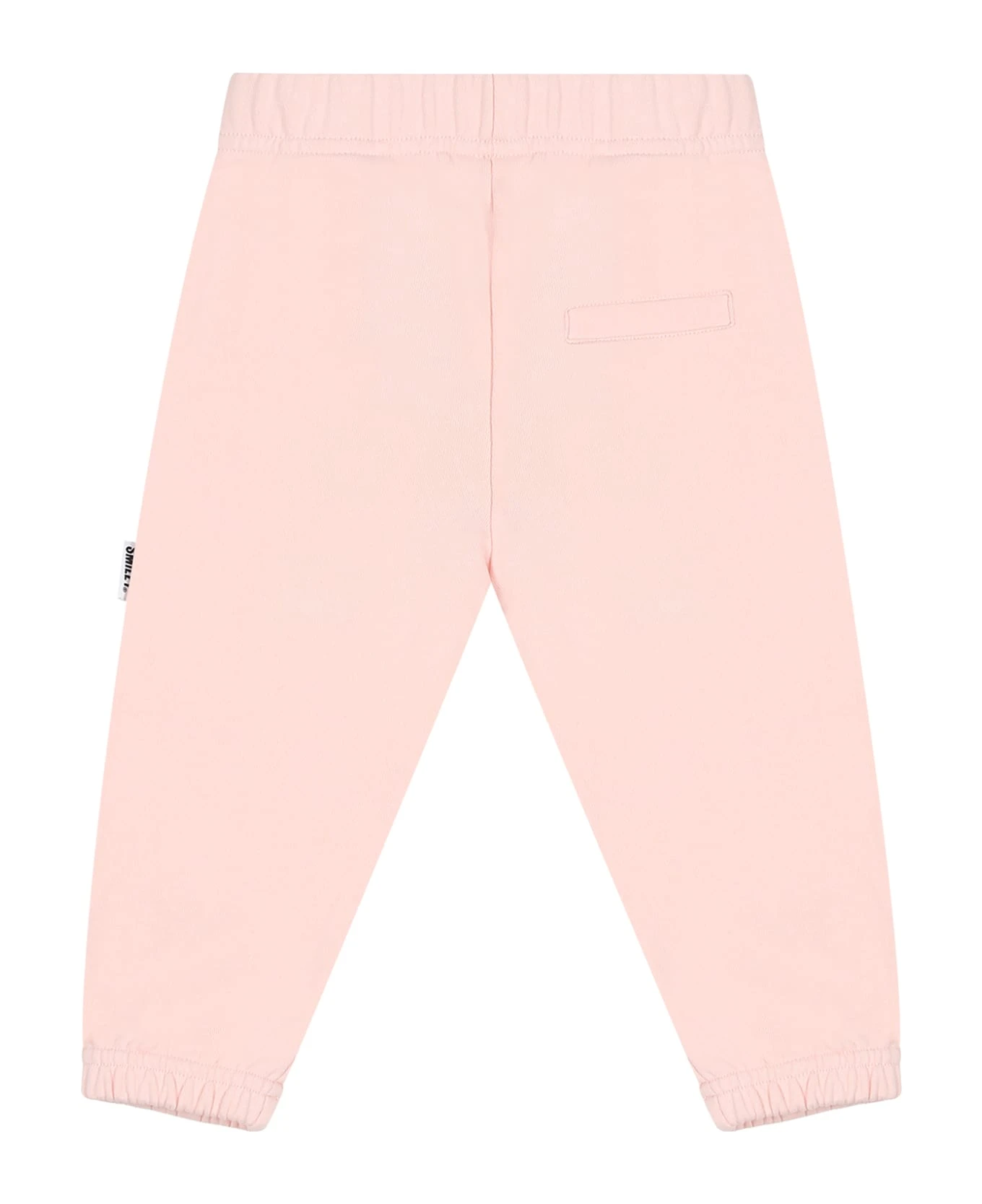 Pink trousers in brushed cotton, with elastic waist and ribbed ankles. They are embellished with logoed smileys on the legs. It’s a Palm Angels collaboration for Smiley.