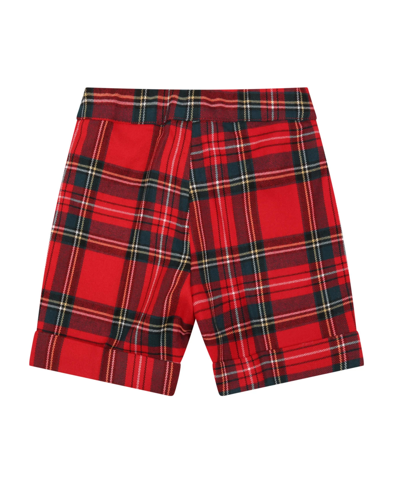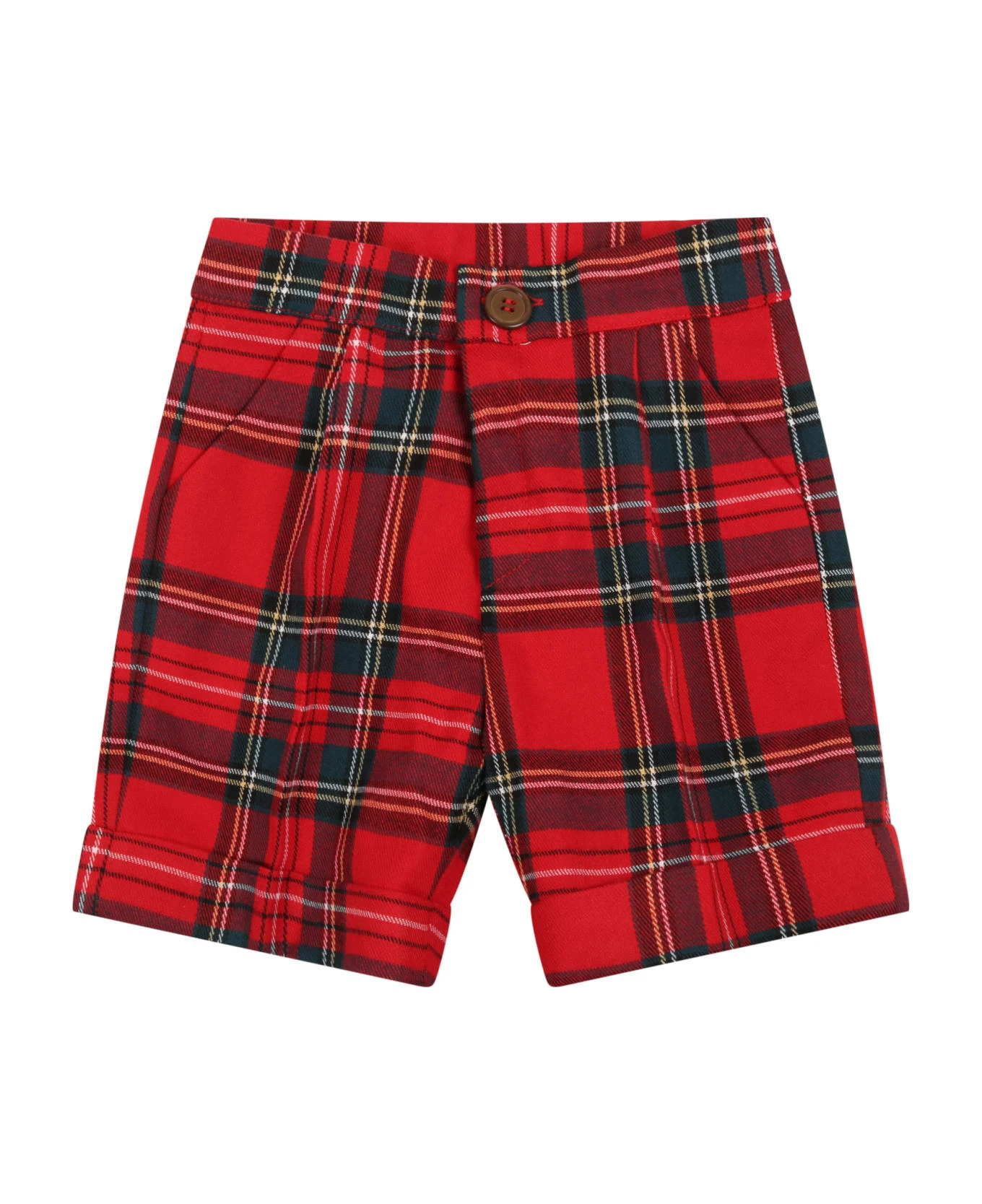Red short, with adjustable waist thanks to inside elastic with button, side pockets, pleat on the front and zipped and buttoned closure on the front. It s embellished with tartan pattern all-over.