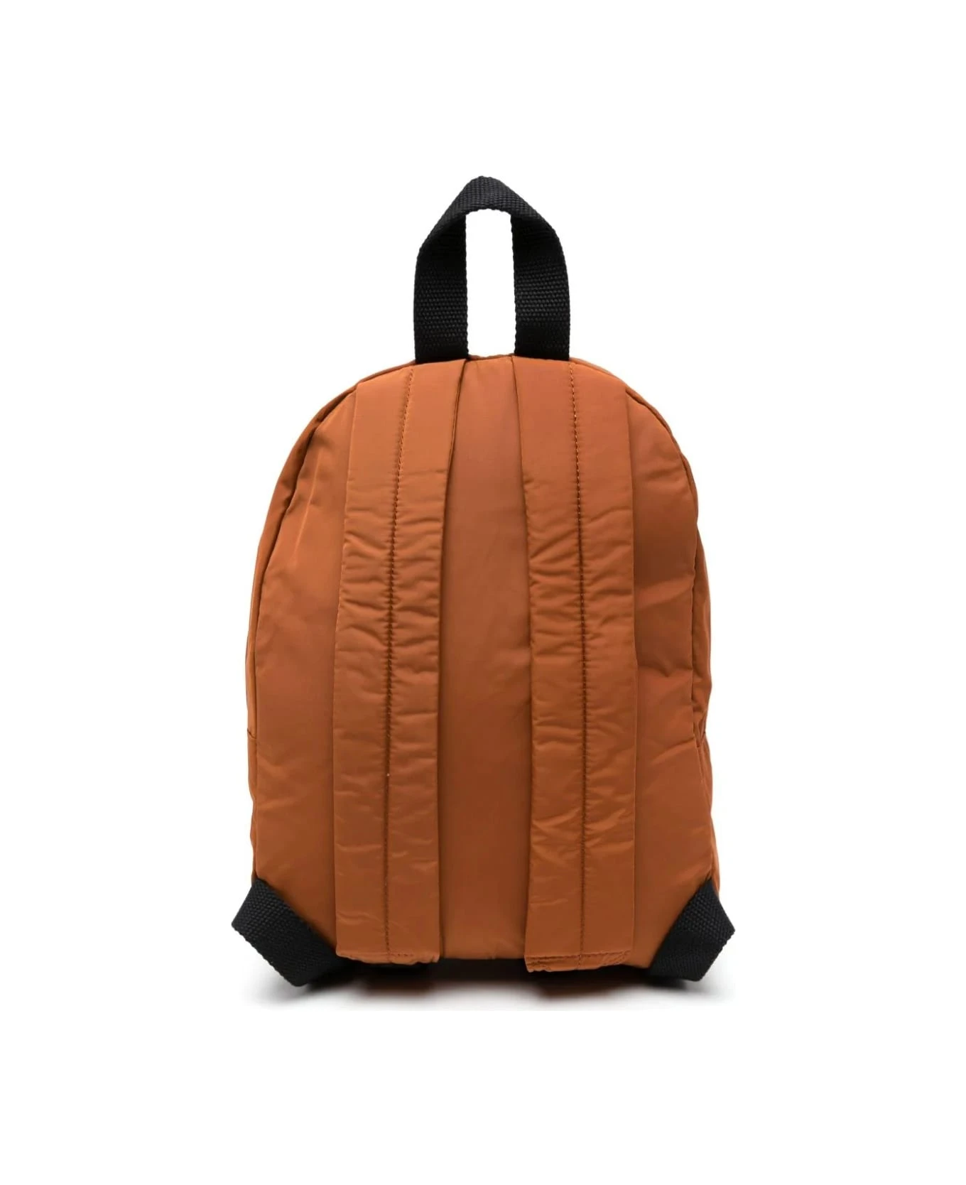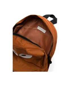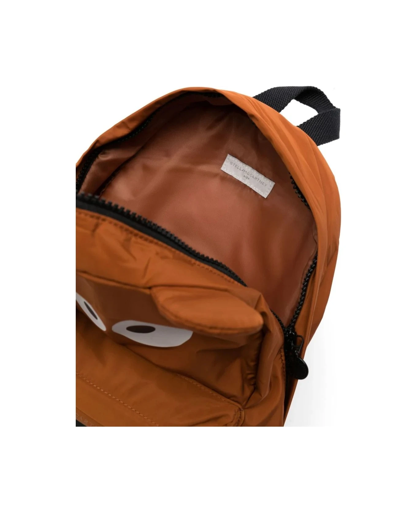 Stella McCartney Kids brown backpack made from recycled materials and featuring a grizzly bear motif on the front and three-dimensional bear ears on the top. The model features two shoulder straps, a top handle, full lining, single stitching, a main compartment, a two-way zip fastening, a front pocket and an embossed logo label on the front.