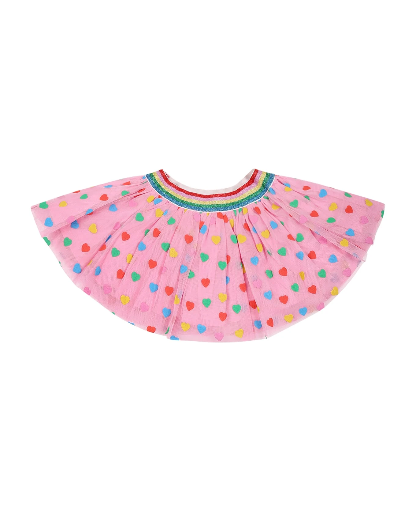 Pink tulle skirt, made of recycled polyester, with multicolor elastic waistband. It is embellished with all-over multicolor hearts.