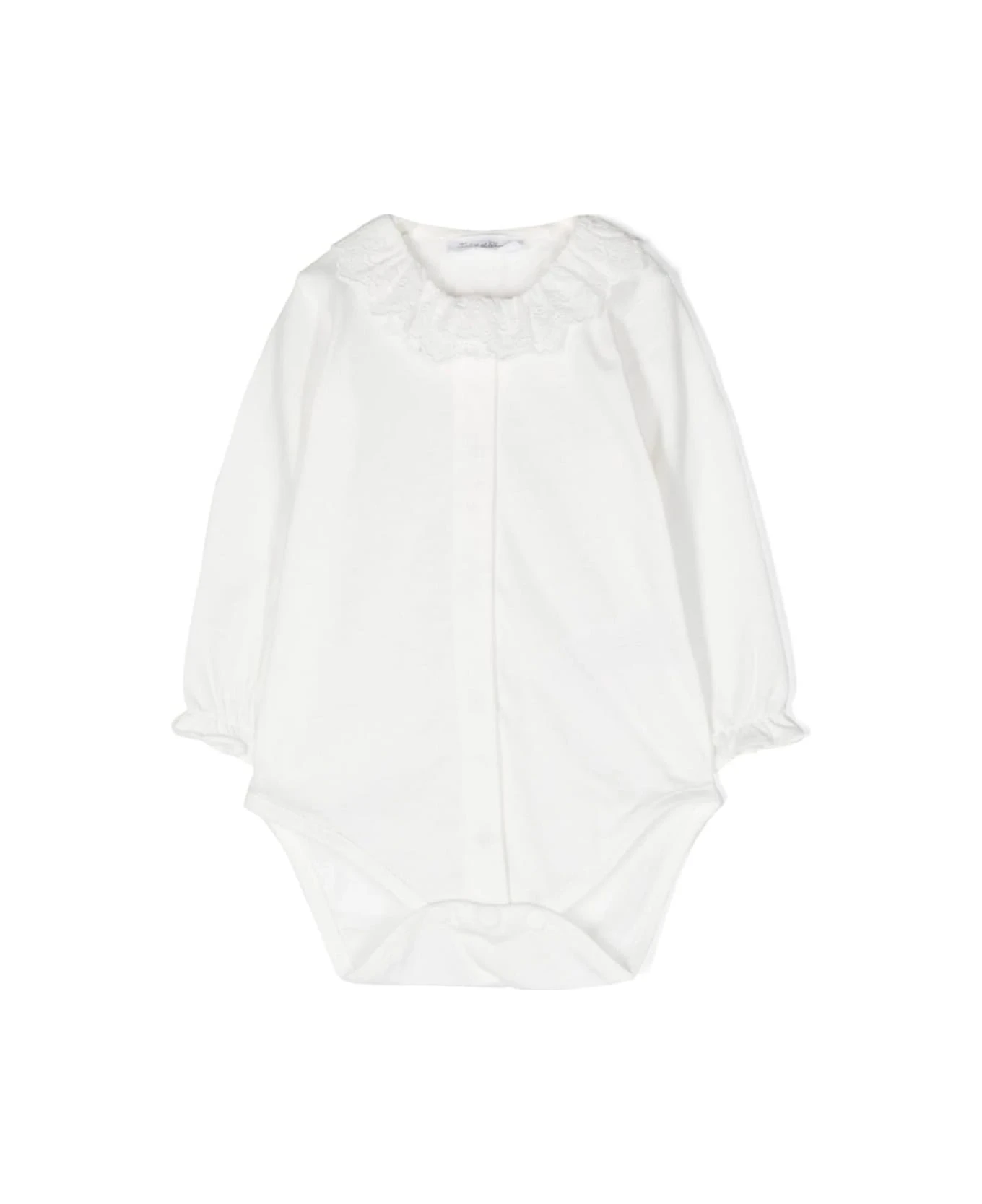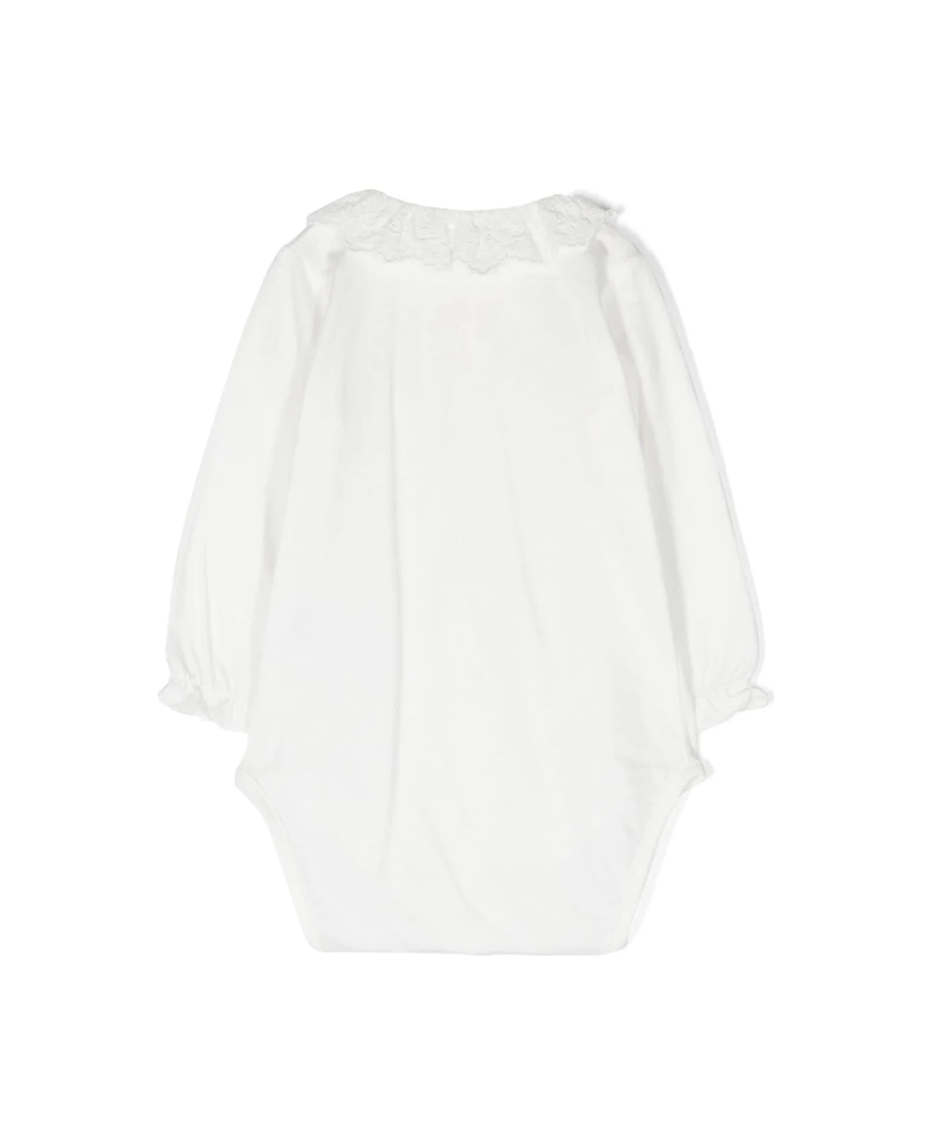 White, cotton, ruffled collar, round neckline, front button closure, long sleeves and ruffled hem. Composition