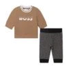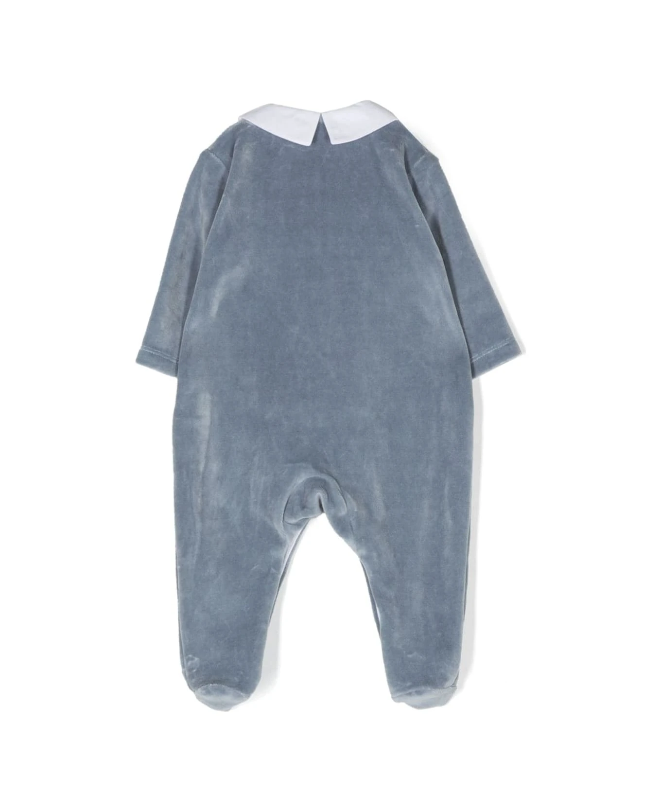 Blue-grey, cotton blend, bib collar, double-breasted button closure and long sleeves. Composition