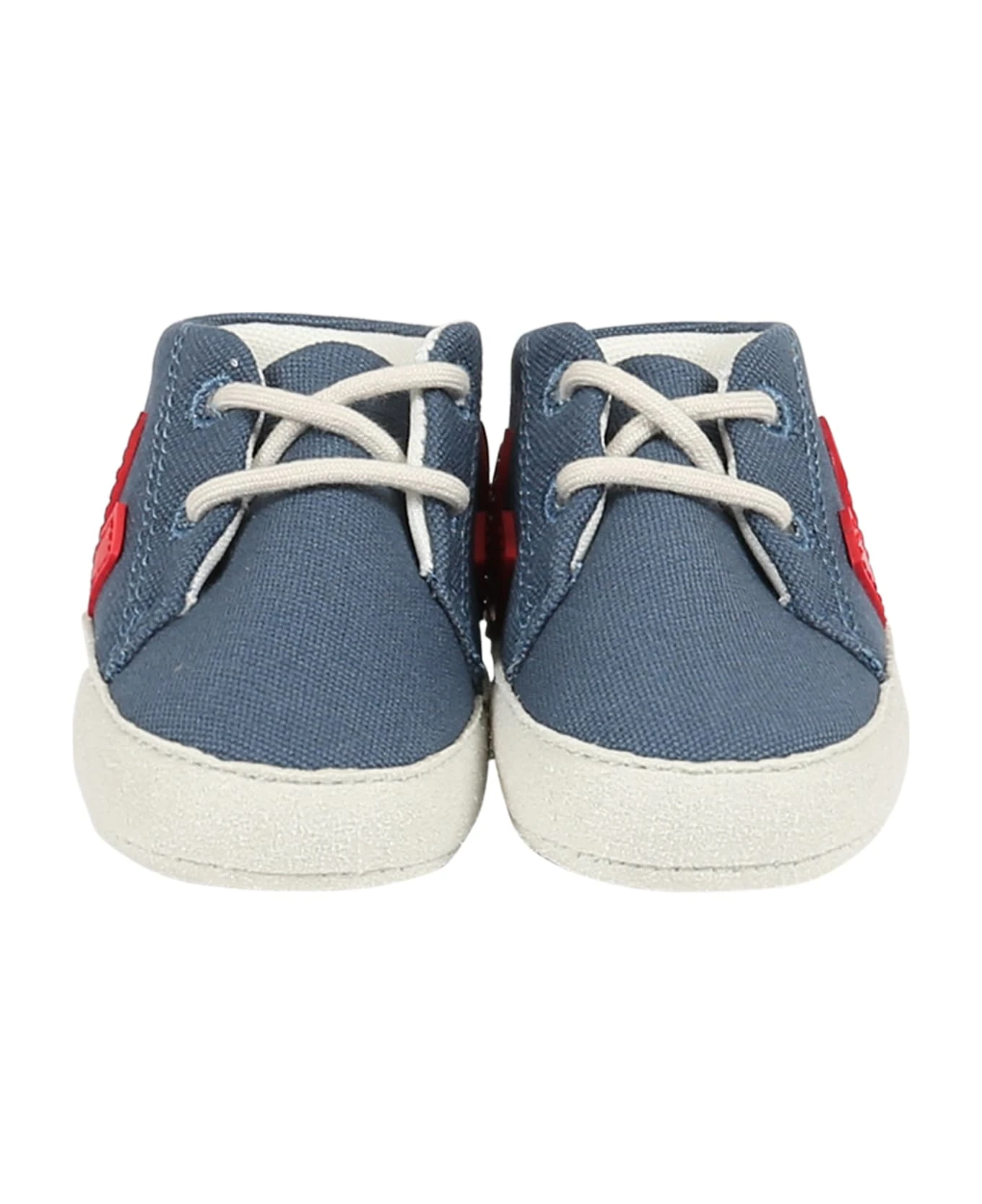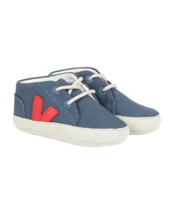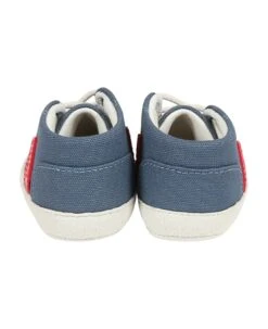 Blue sneakers, in organic cotton, suede sole, round toe, lace-up closure on the top. They are embellished with red logo patch, on the sides. They are made from ecological and vegan fabrics