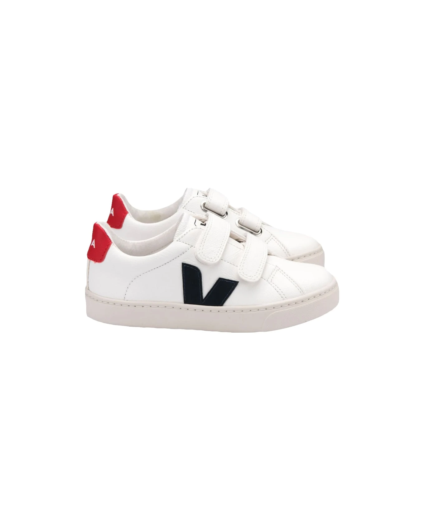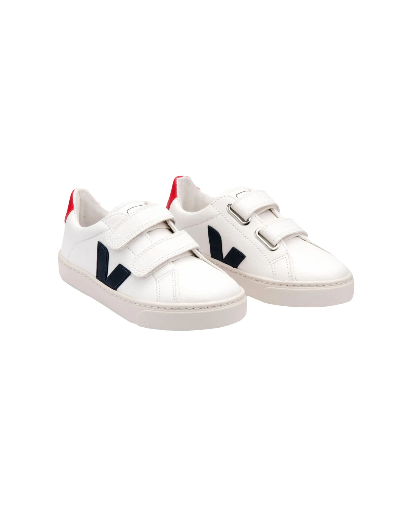 White and Nautico Pekin Cromo Chromefree sneakers by Veja Kids made from ChromeFree leather and featuring a round toe, a pull-on strap closure, a red logo spoiler and a contrasting V logo on the outer side. ChromeFree leather, chrome-free tanned cowhide, is soft and lightweight. Sourced from farms in the south of Brazil (Rio Grande do Sul), it undergoes an innovative tanning process during which no chromium, hard metals or dangerous acids are used. The simplification of the tanning steps makes it possible to limit the use of chemicals and energy, as well as to reduce the use of ambient water by 40% and the salt cell by 80%. After tanning, the water is recyclable. ChromeFree leather is used on the entire Kids leather collection.
