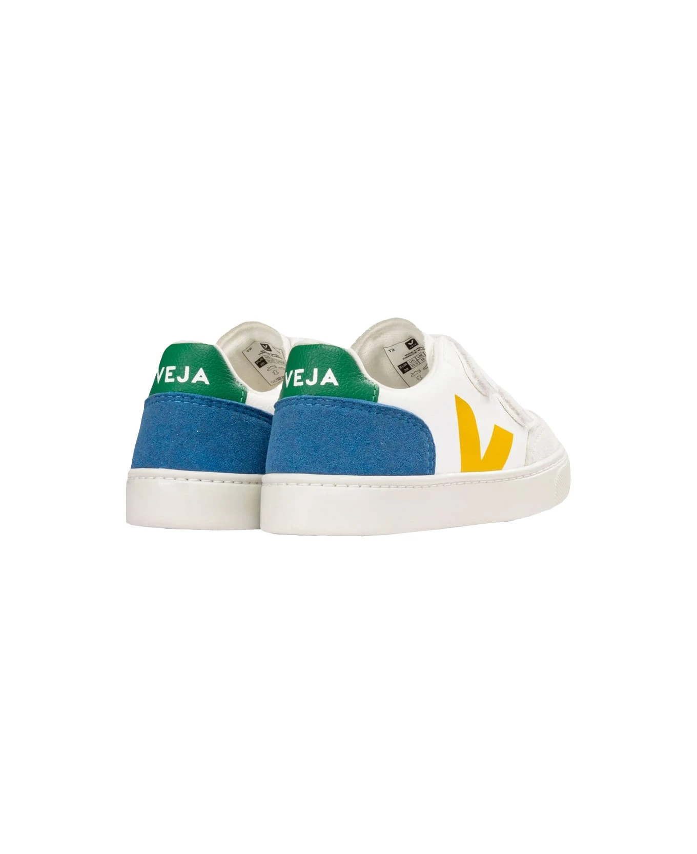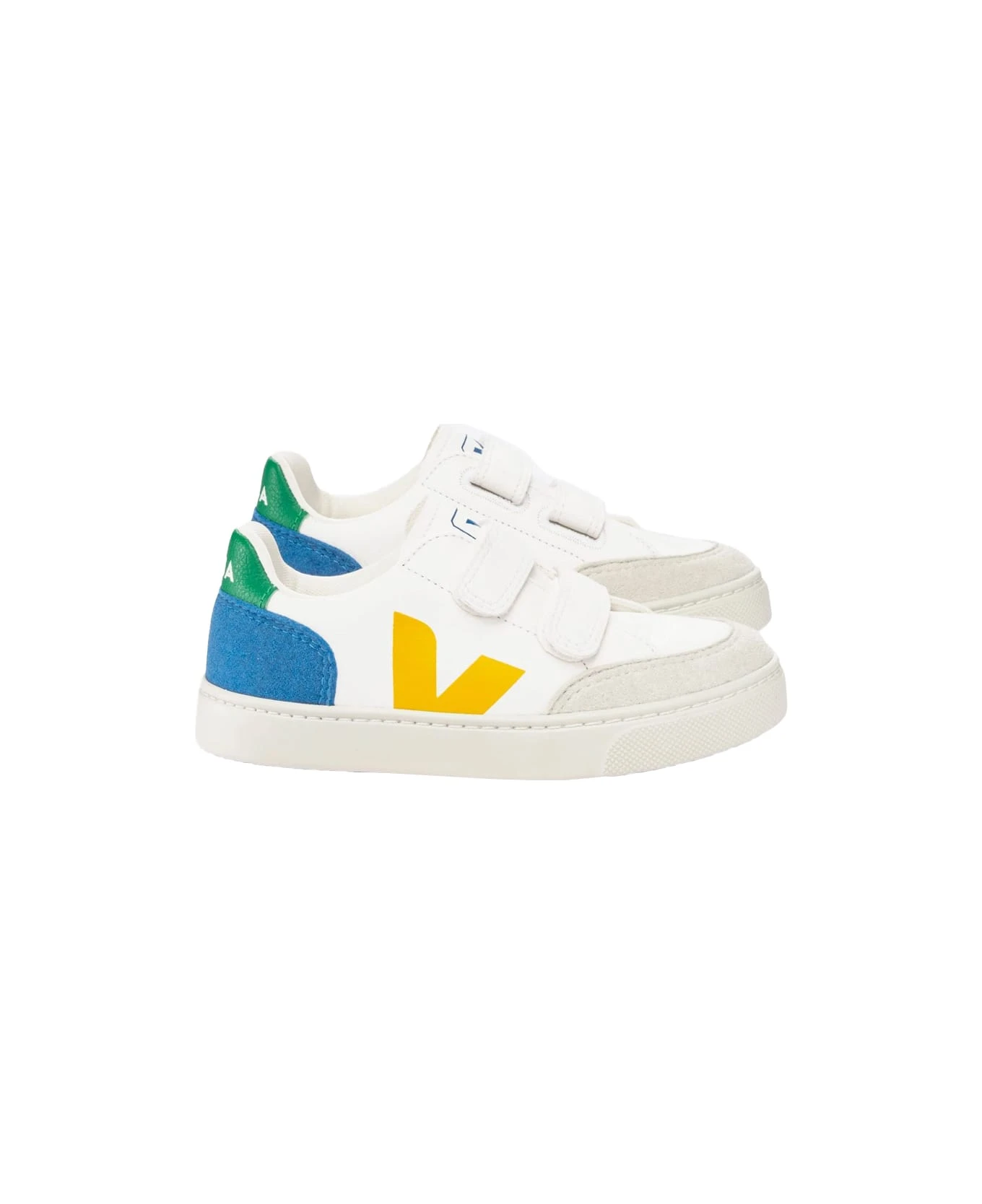 White V-12 ChromeFree sneakers by Veja Kids made of ChromeFree cowhide and characterized by a round suede toe, yellow V logo on the external side, blue suede heel, green spoiler with white logo and hook and loop strap closure. ChromeFree cowhide is smooth and lightweight. Coming from farms located in southern Brazil (Rio Grande do Sul), it is subjected to an innovative tanning process in which no chromium, heavy metals or dangerous acids are involved. By simplifying the tanning process, the use of chemicals and energy is limited. Water consumption is reduced by approximately 40% and salt consumption by 80%. After tanning, the water is recyclable. ChromeFree leather is used across the entire Kids leather collection.