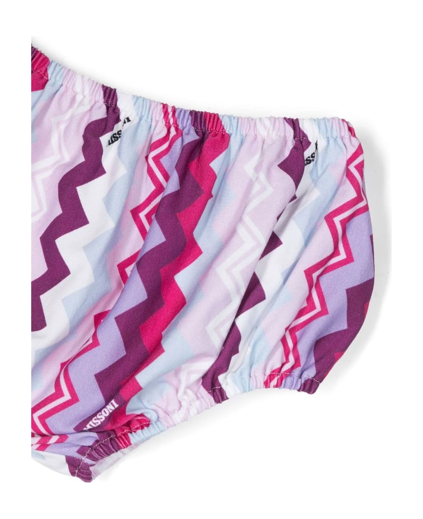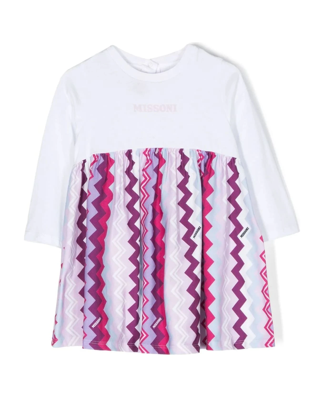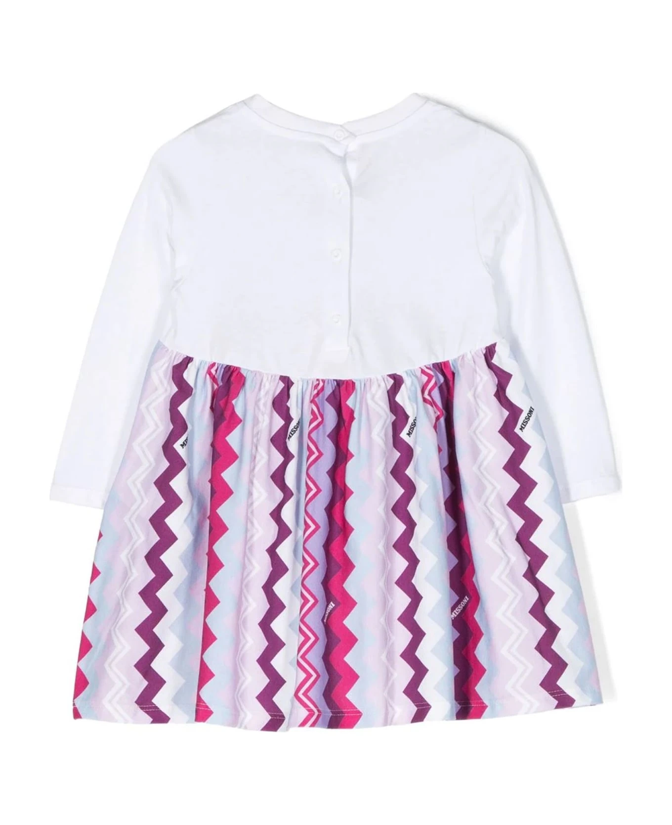 White and dark purple stretch-cotton dress, jersey knit, chevron print, logo print to the front, panelled design, crew neck, rear button fastening, long sleeves, straight hem