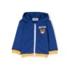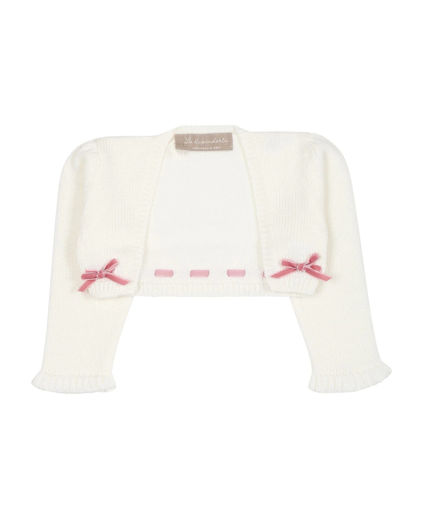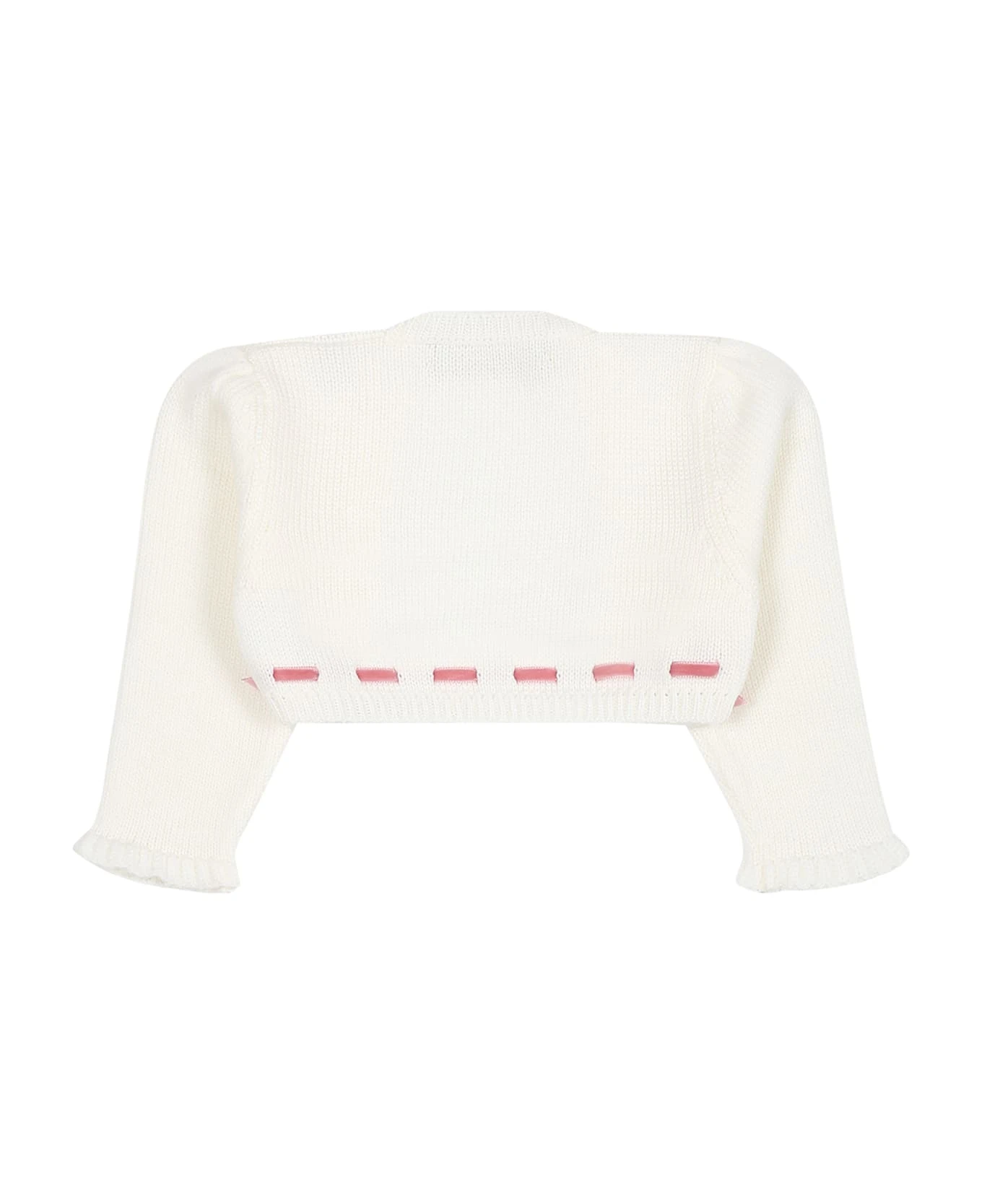 White cardigan in wool, with long sleeves, with ribbed cuffs and hem. It is embellished with pink velvet bows on the sides.